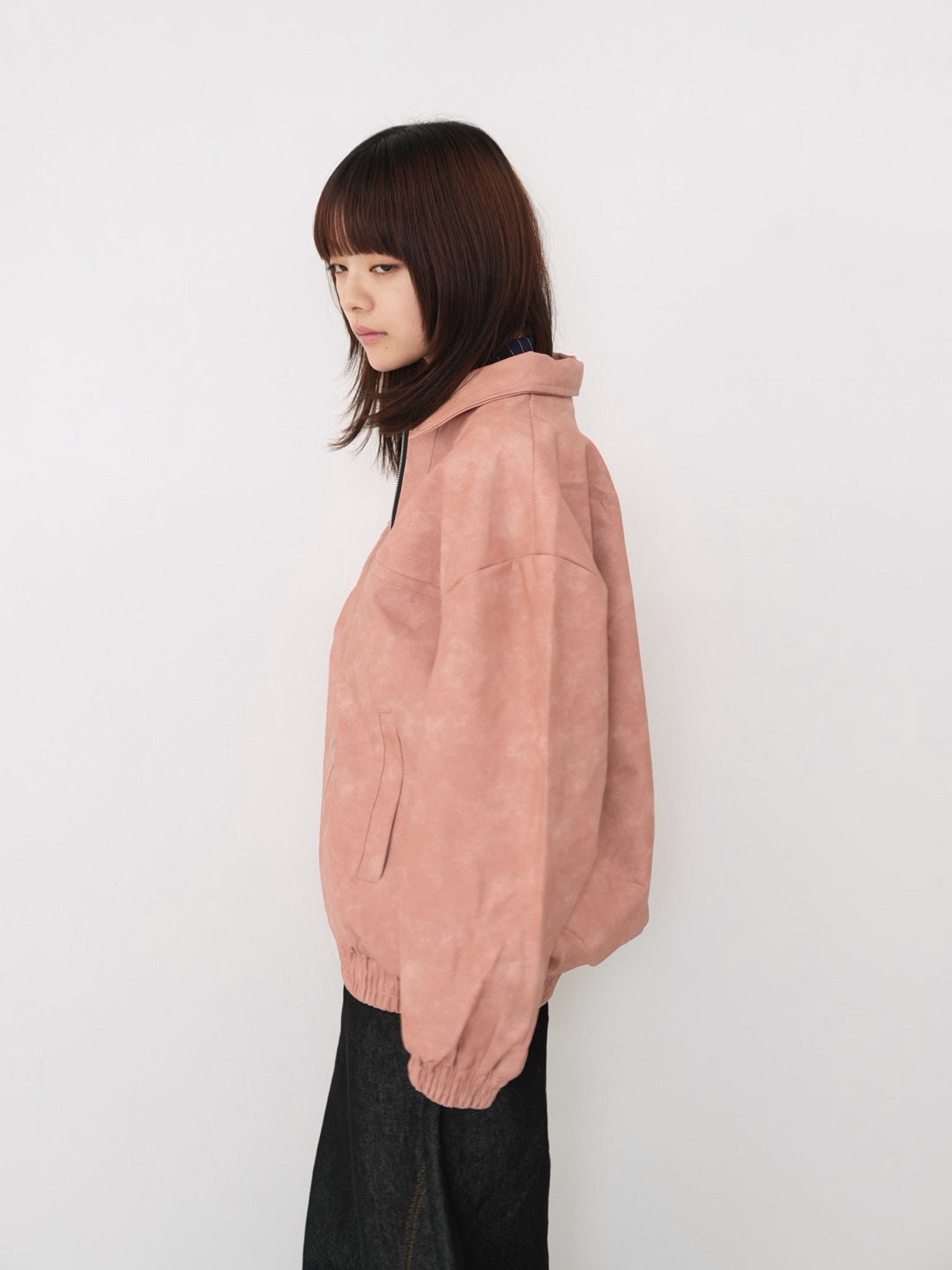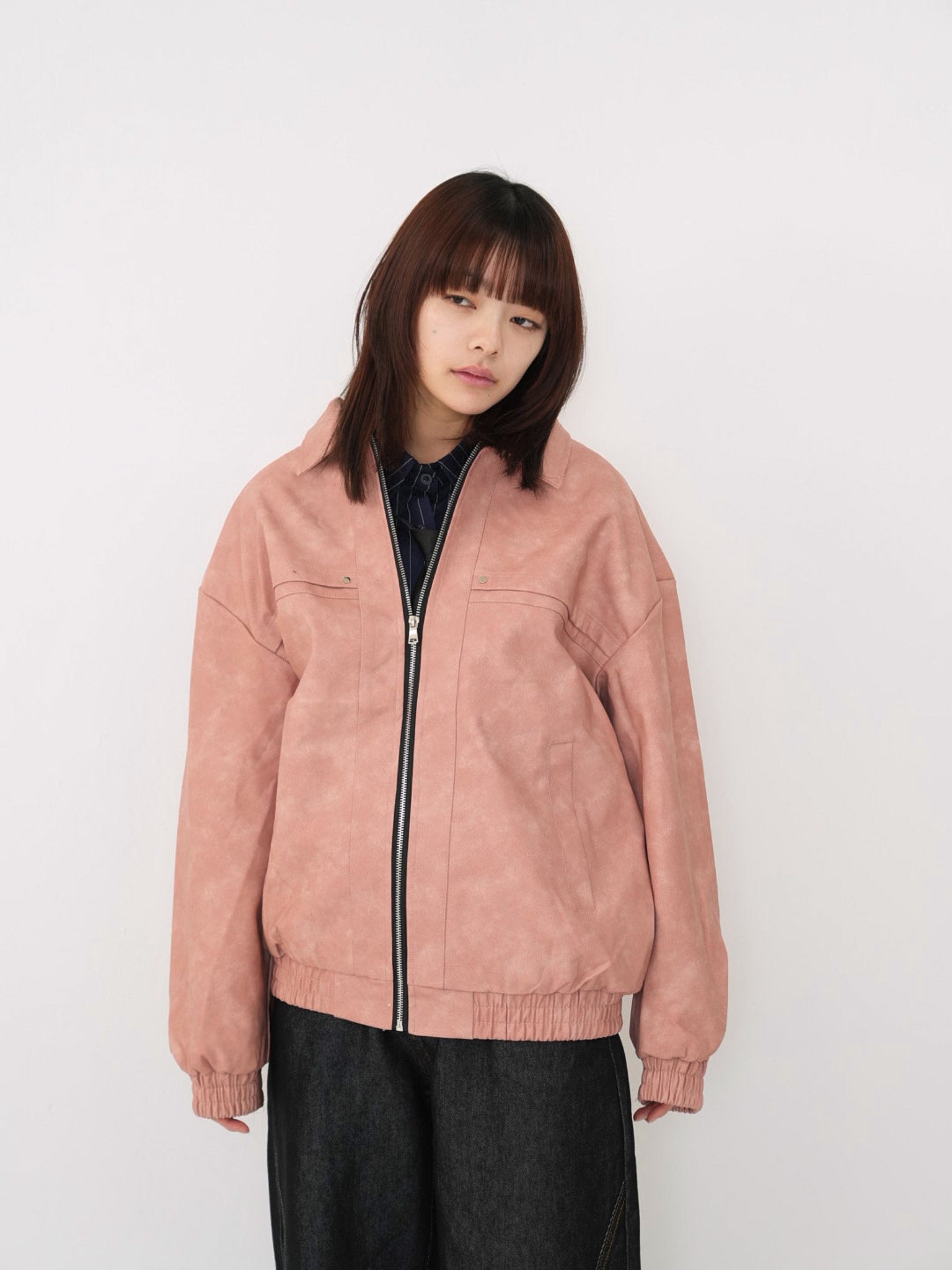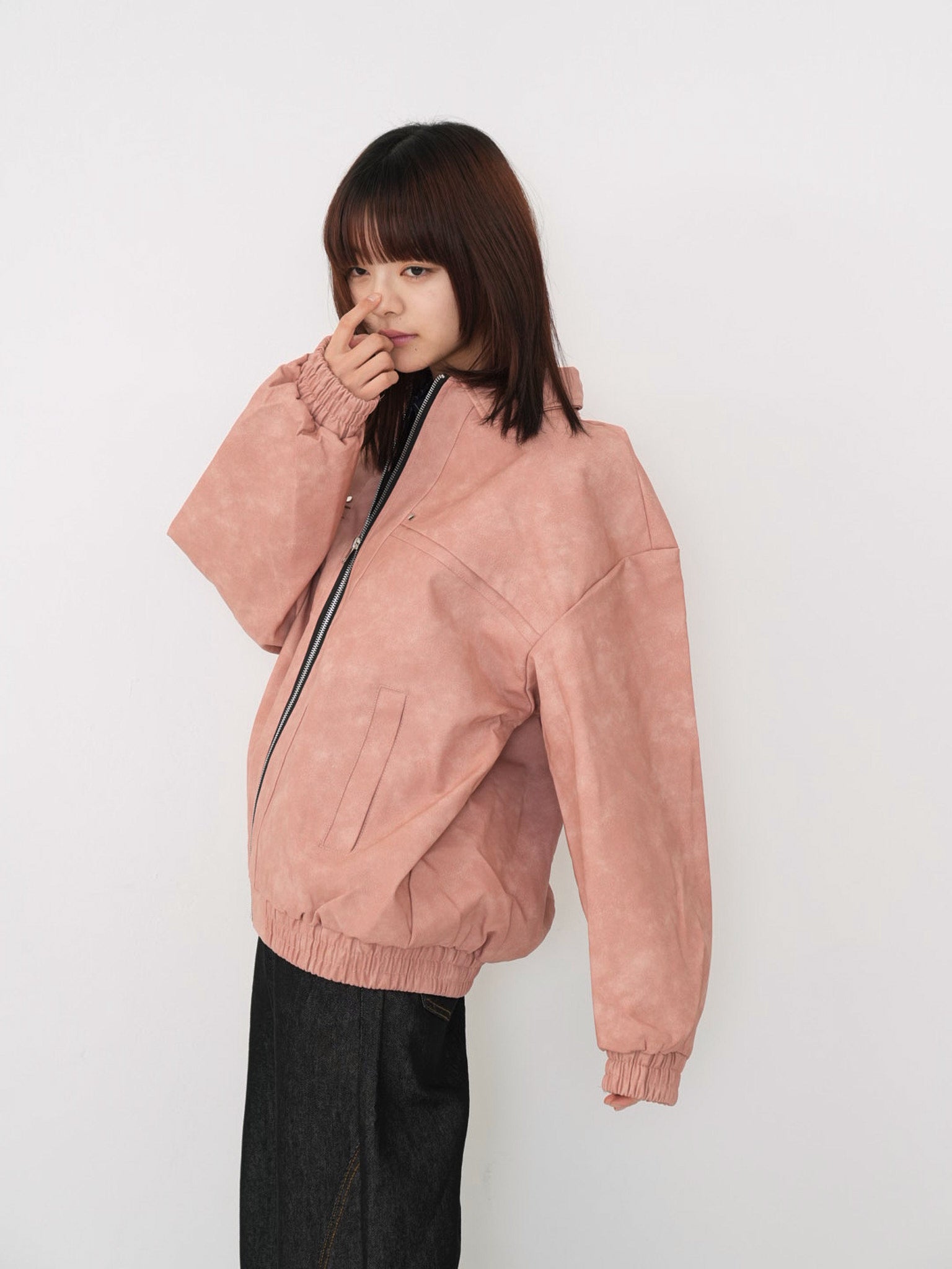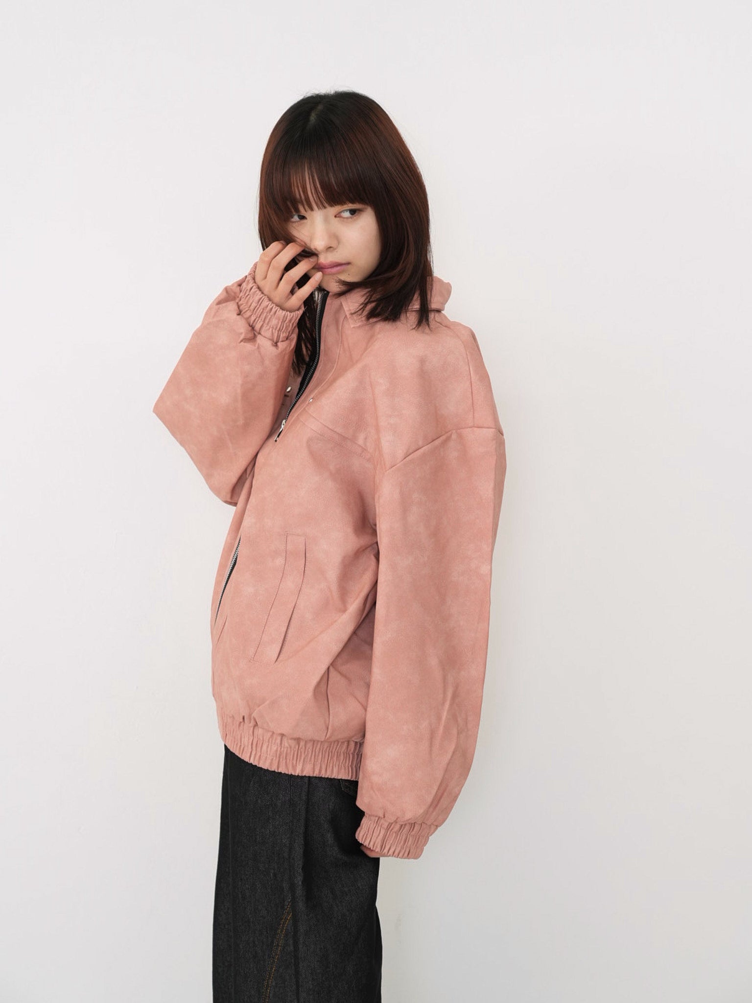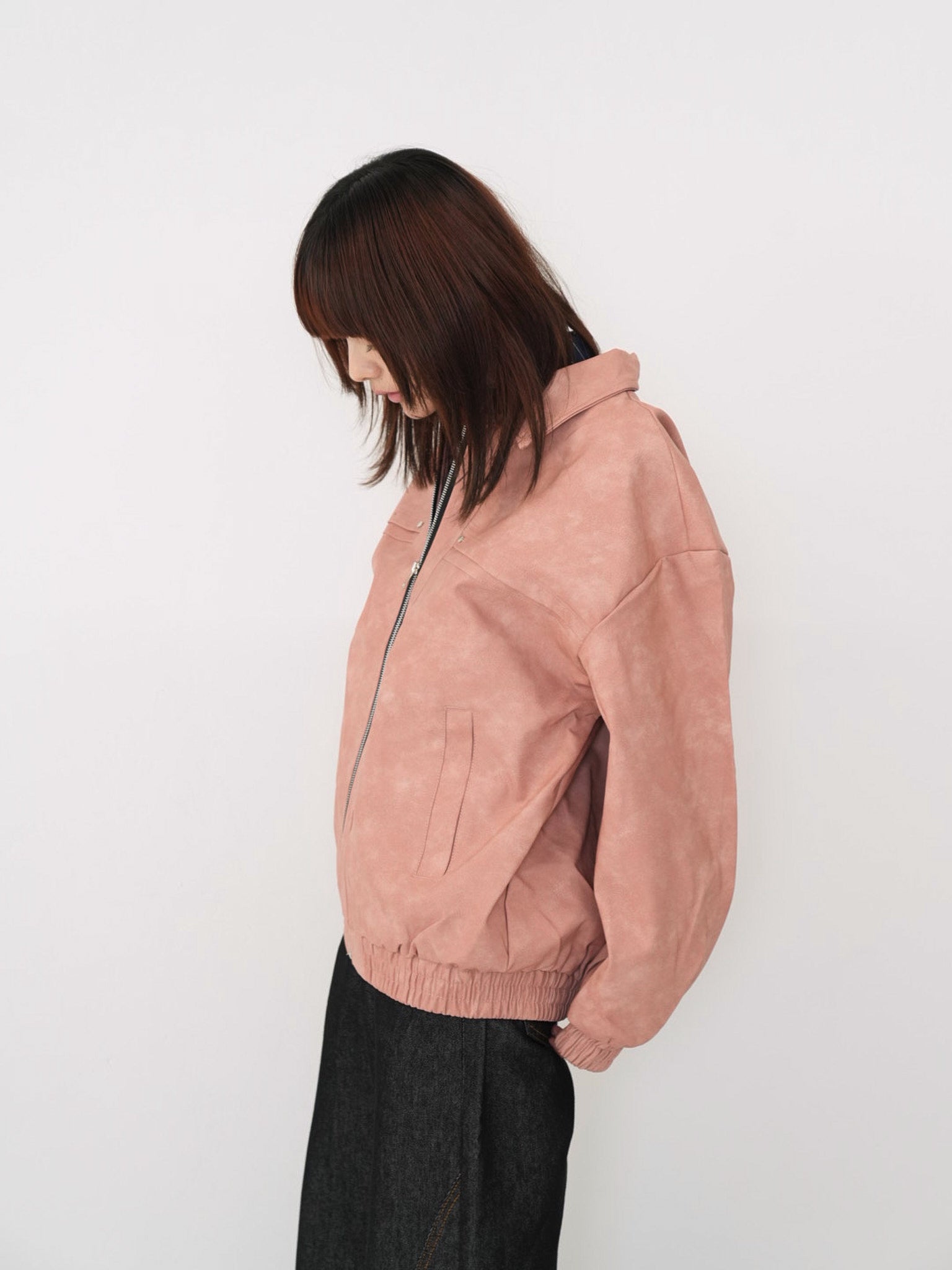 程よい艶感のあるフェイクレザー素材を使用したジップアップアウター。柔らかく軽い着心地で、ハードになりすぎず日常に取り入れやすい一着。丸みのあるシルエットが抜け感を演出し、羽織るだけでスタイリングに奥行きを与えます。