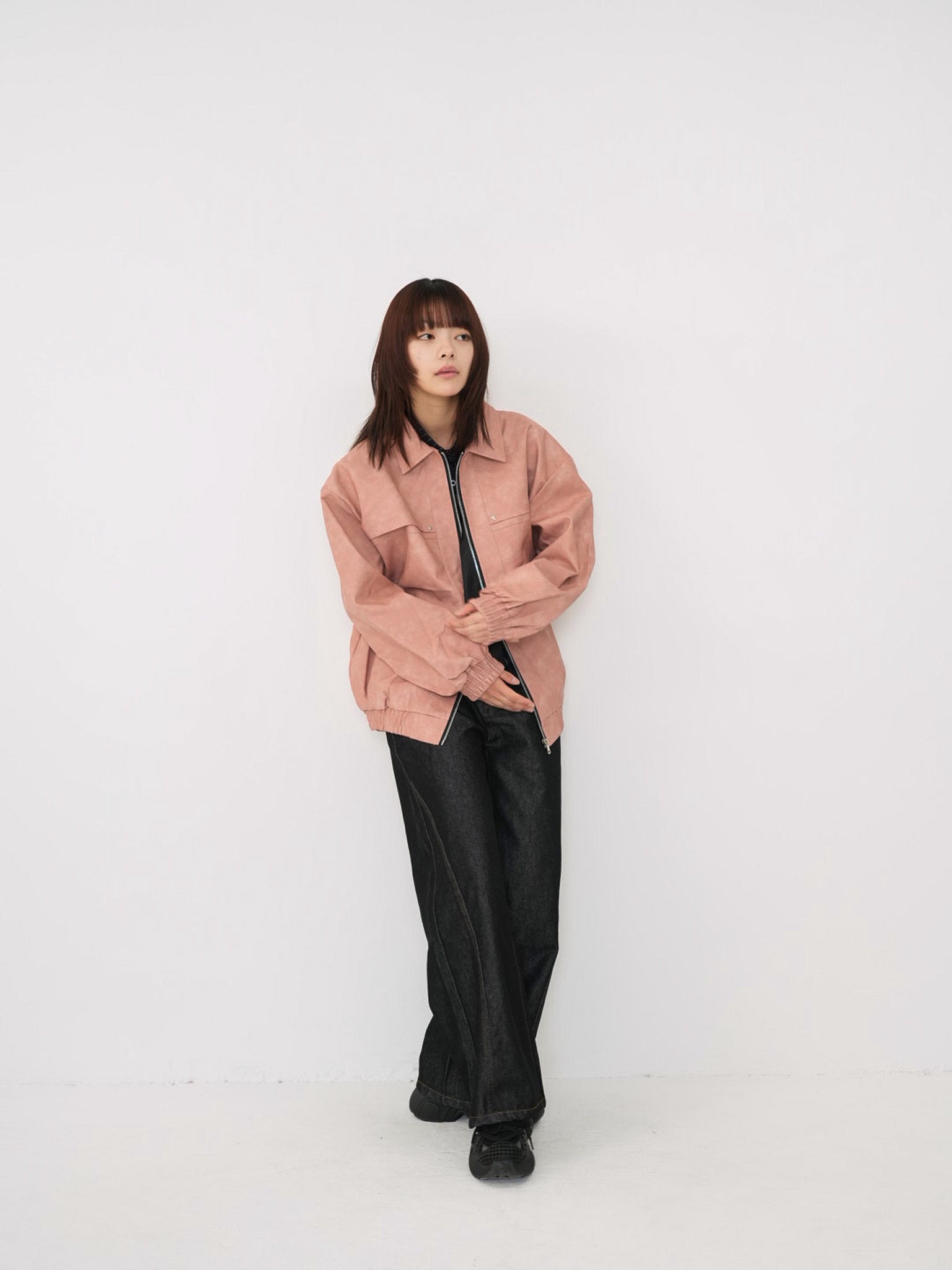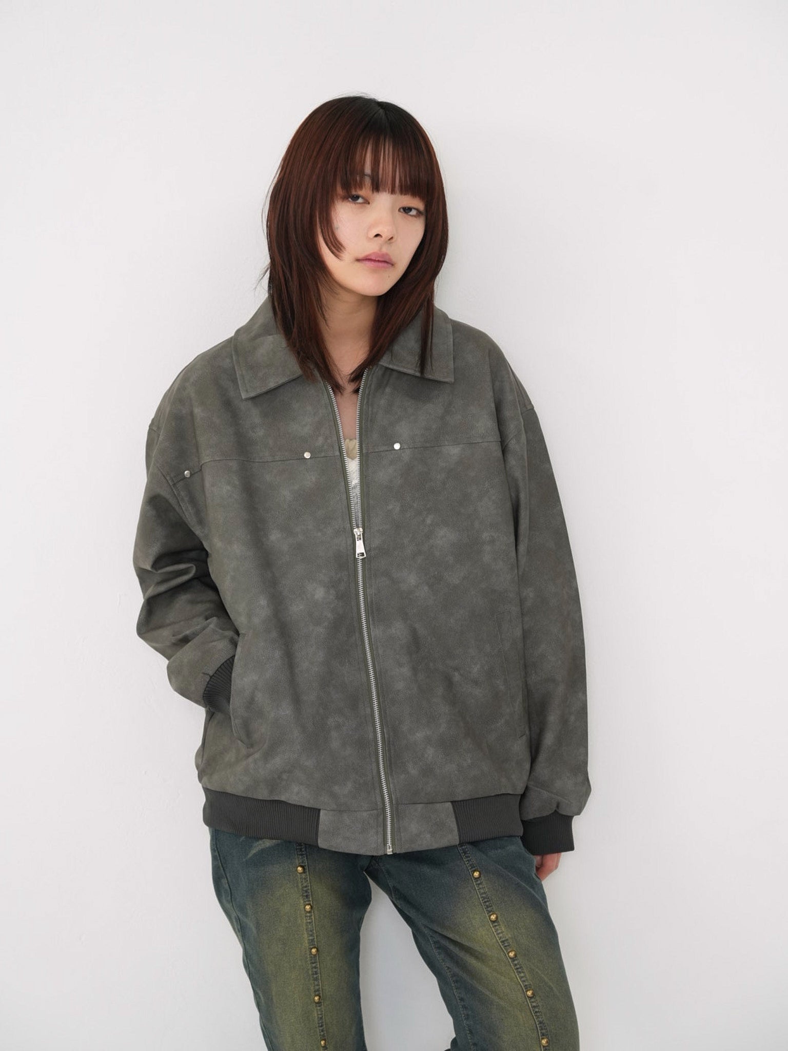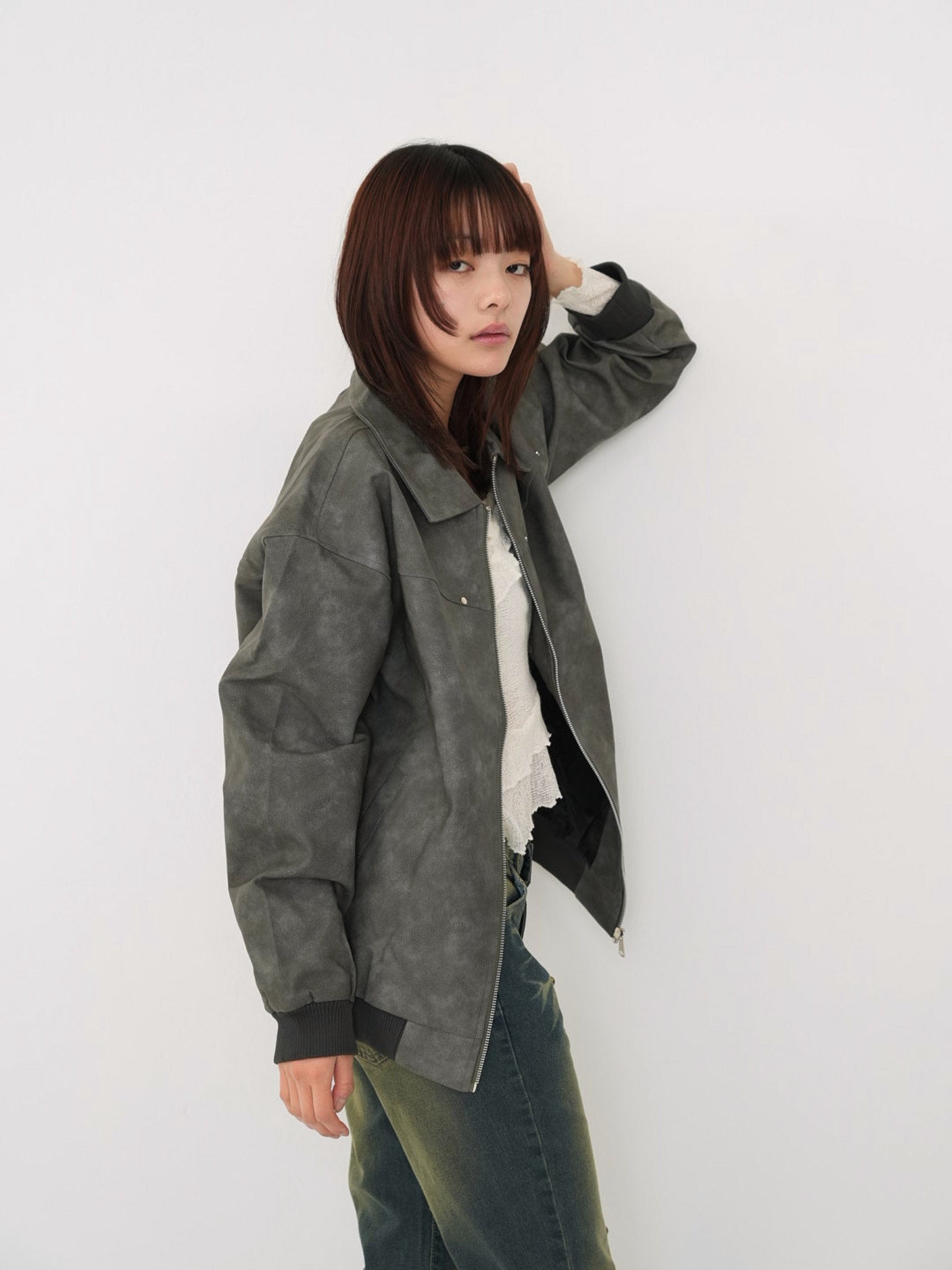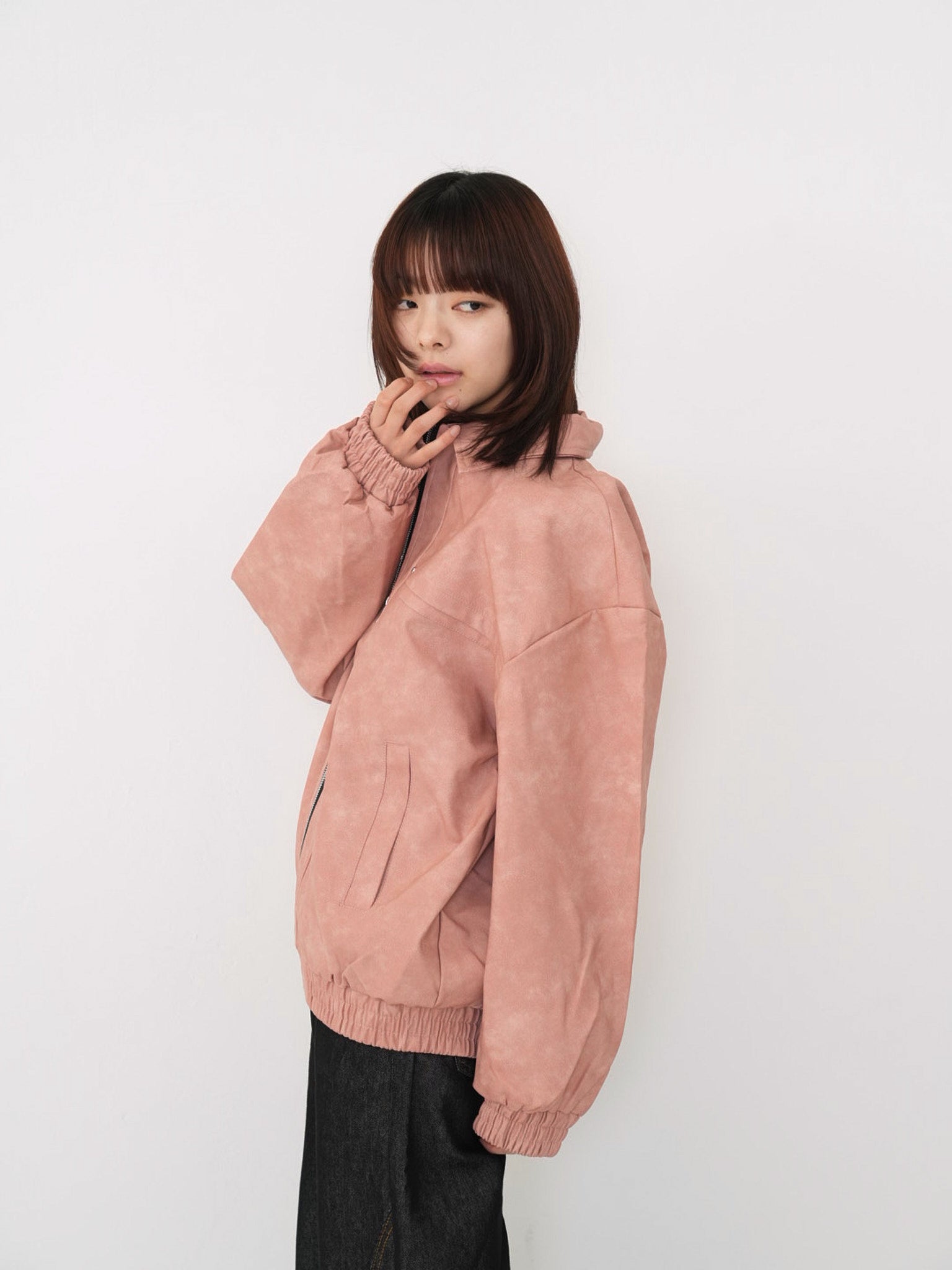 程よい艶感のあるフェイクレザー素材を使用したジップアップアウター。柔らかく軽い着心地で、ハードになりすぎず日常に取り入れやすい一着。丸みのあるシルエットが抜け感を演出し、羽織るだけでスタイリングに奥行きを与えます。