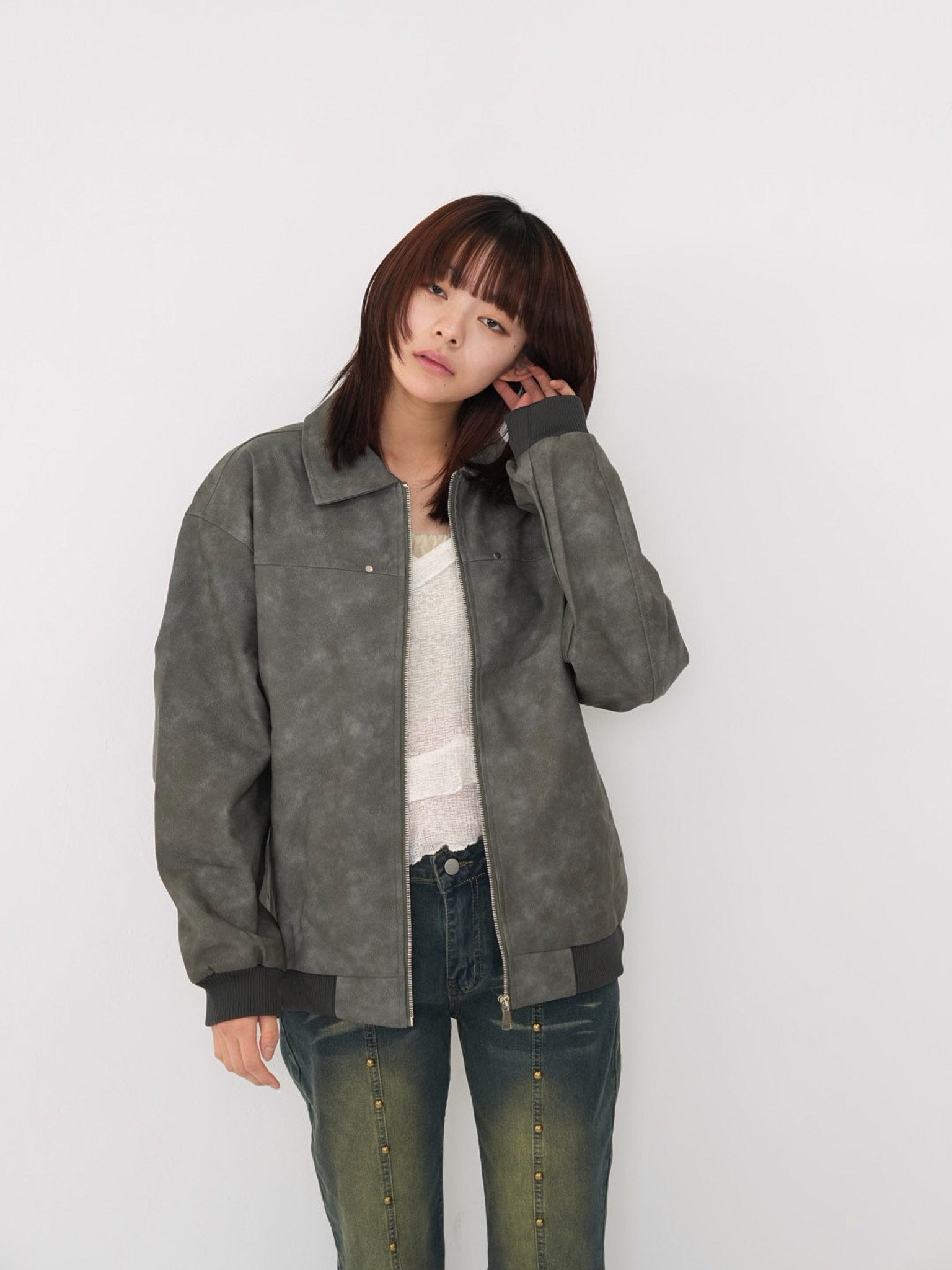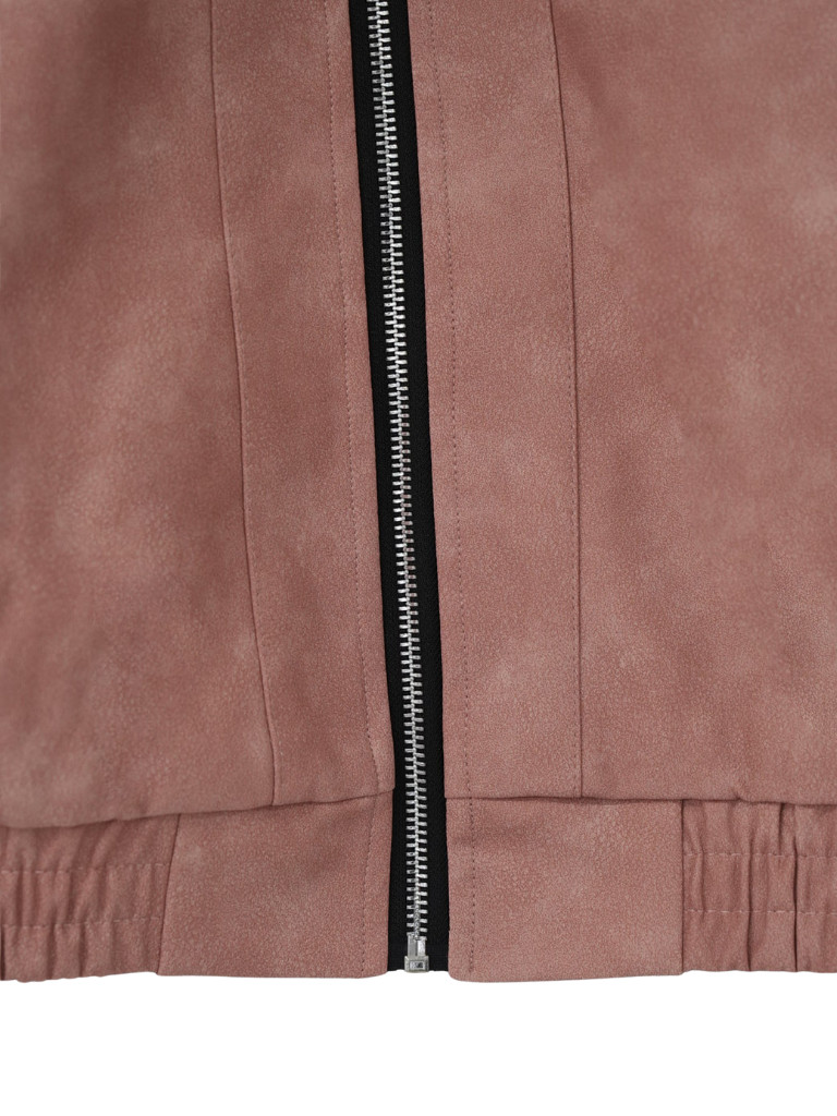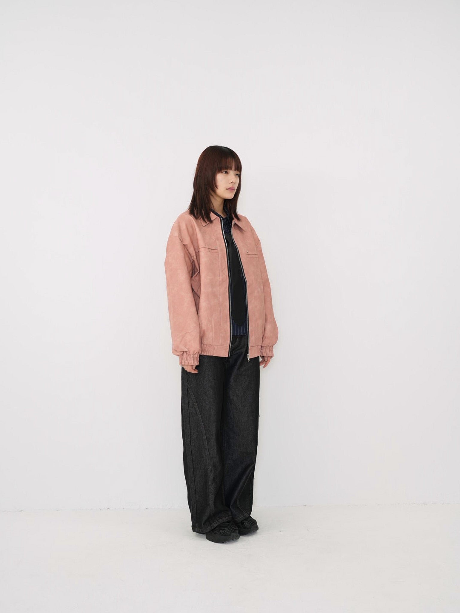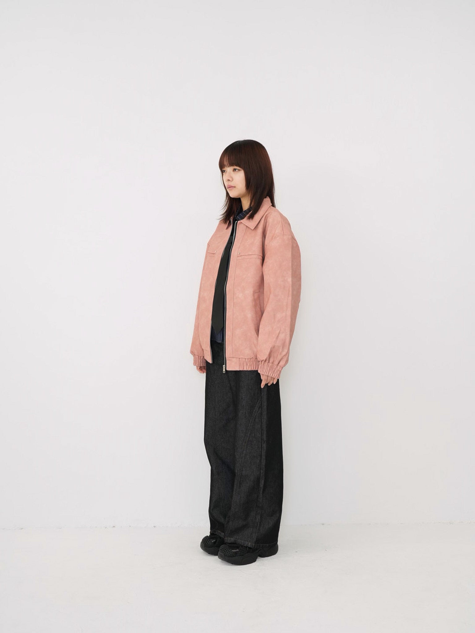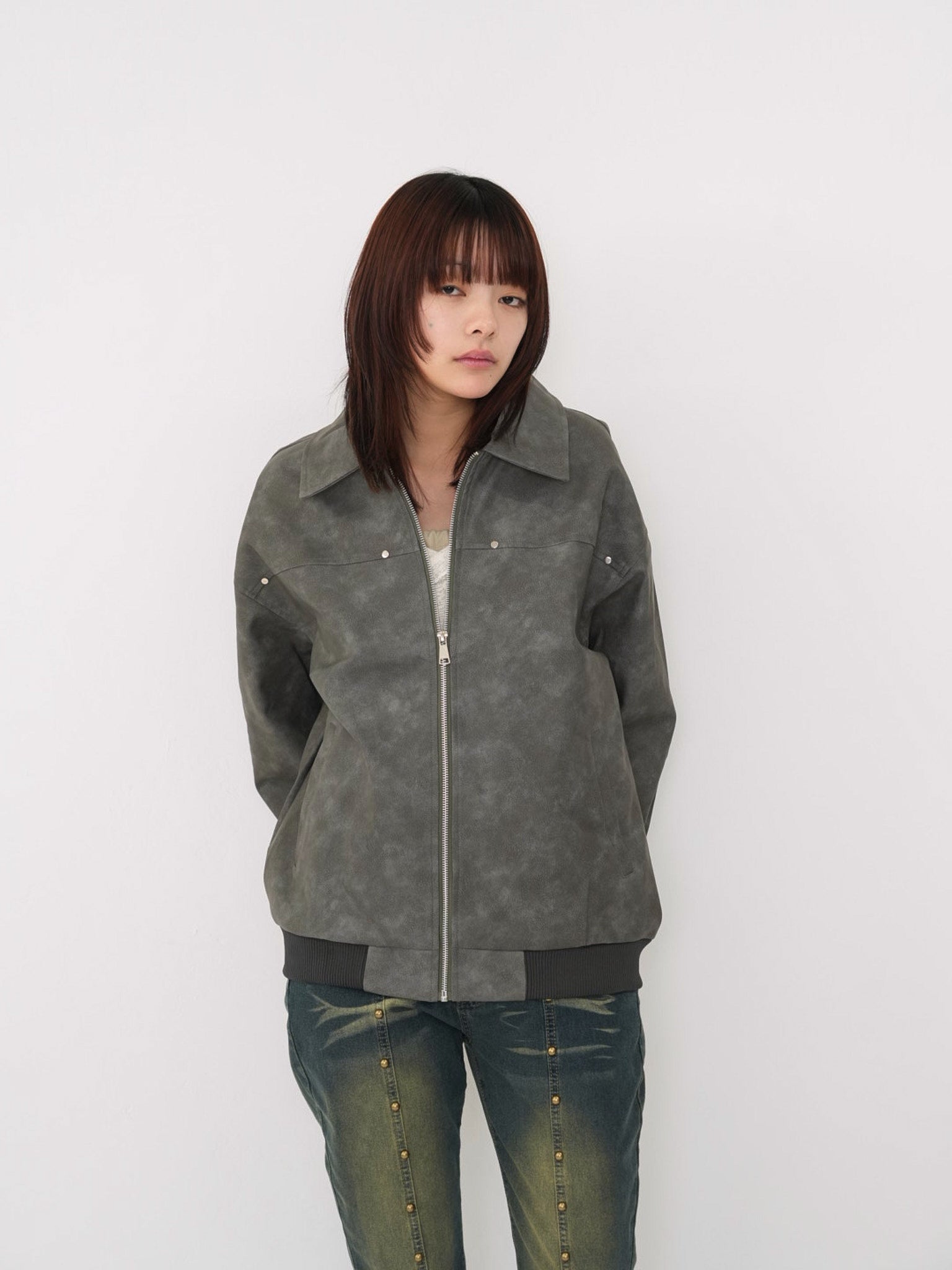 程よい艶感のあるフェイクレザー素材を使用したジップアップアウター。柔らかく軽い着心地で、ハードになりすぎず日常に取り入れやすい一着。丸みのあるシルエットが抜け感を演出し、羽織るだけでスタイリングに奥行きを与えます。