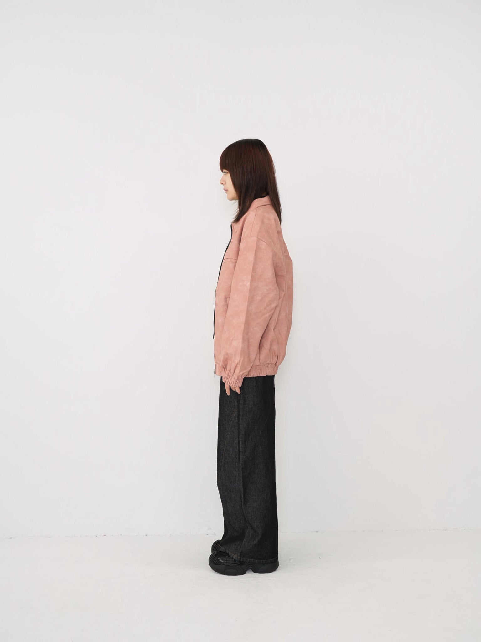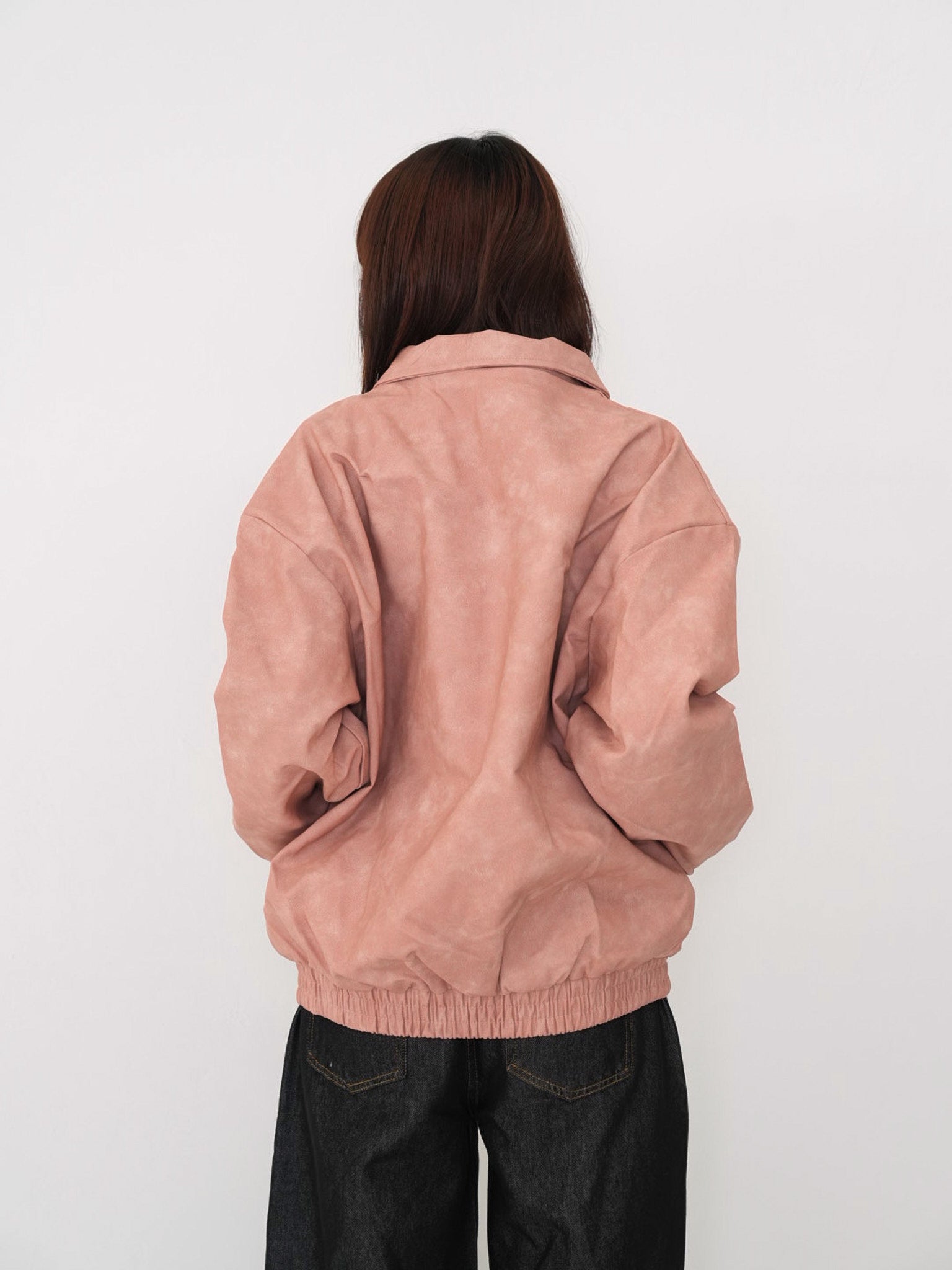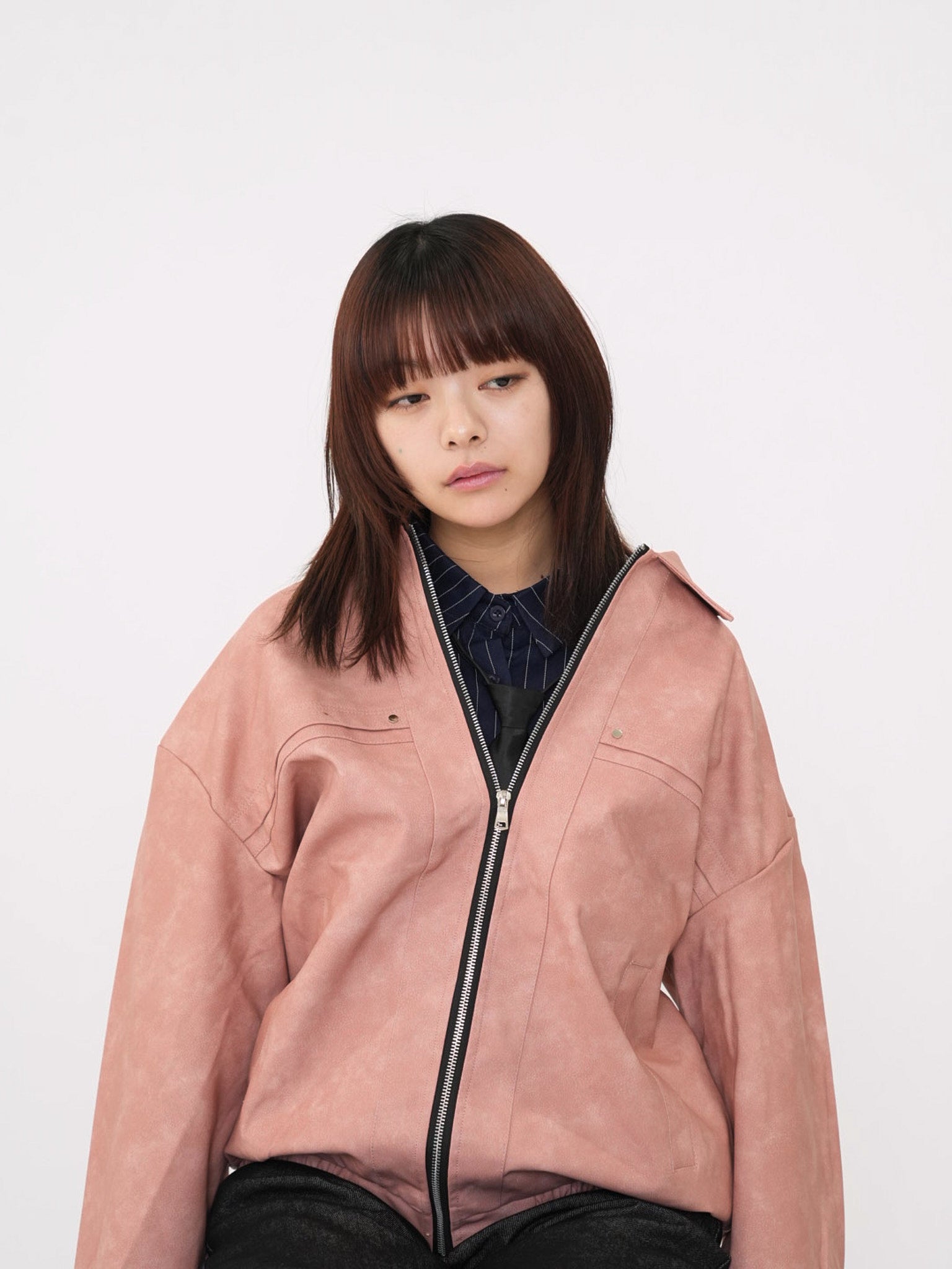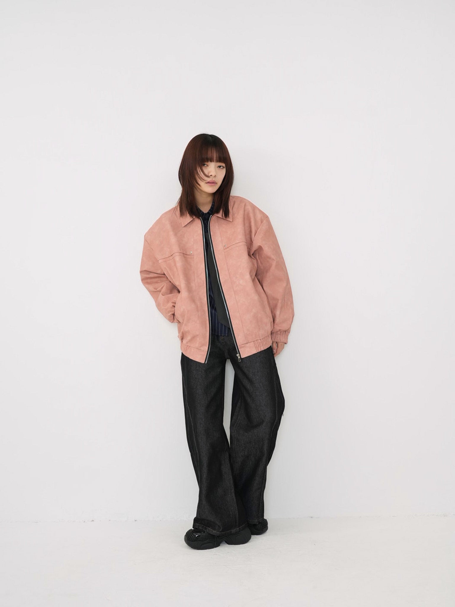 程よい艶感のあるフェイクレザー素材を使用したジップアップアウター。柔らかく軽い着心地で、ハードになりすぎず日常に取り入れやすい一着。丸みのあるシルエットが抜け感を演出し、羽織るだけでスタイリングに奥行きを与えます。