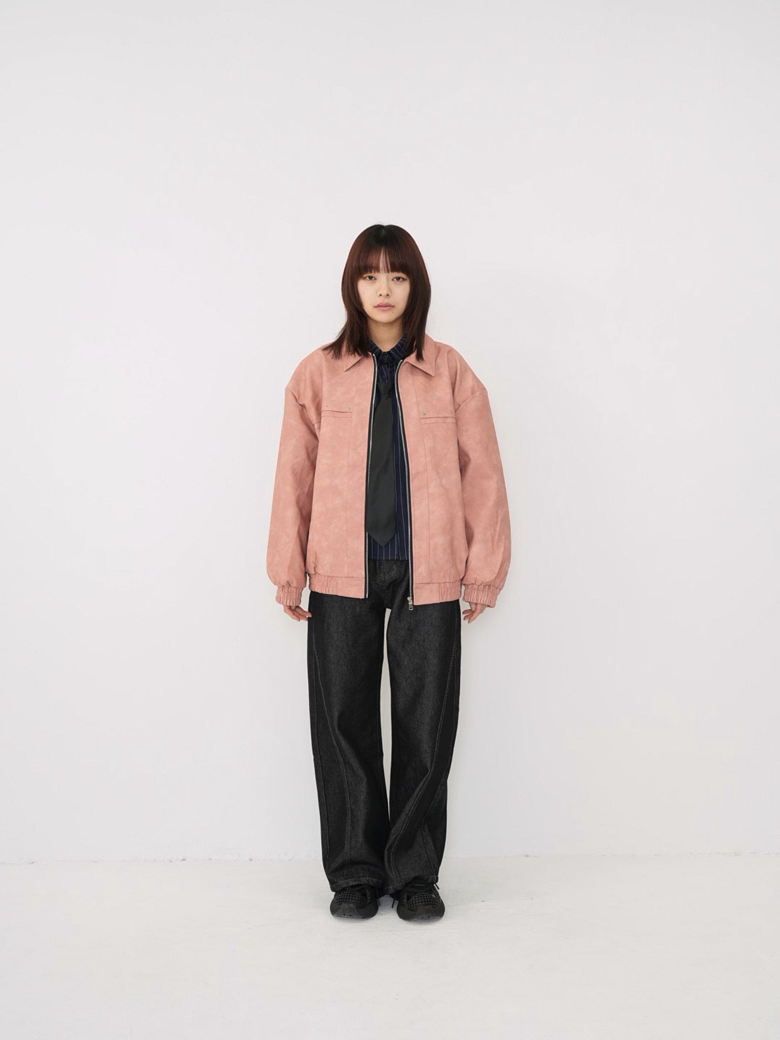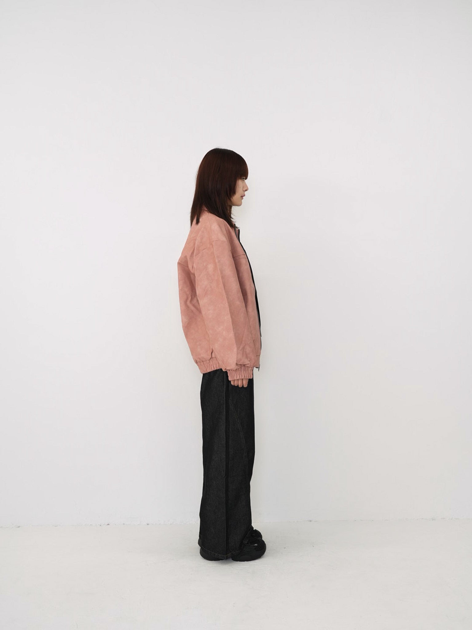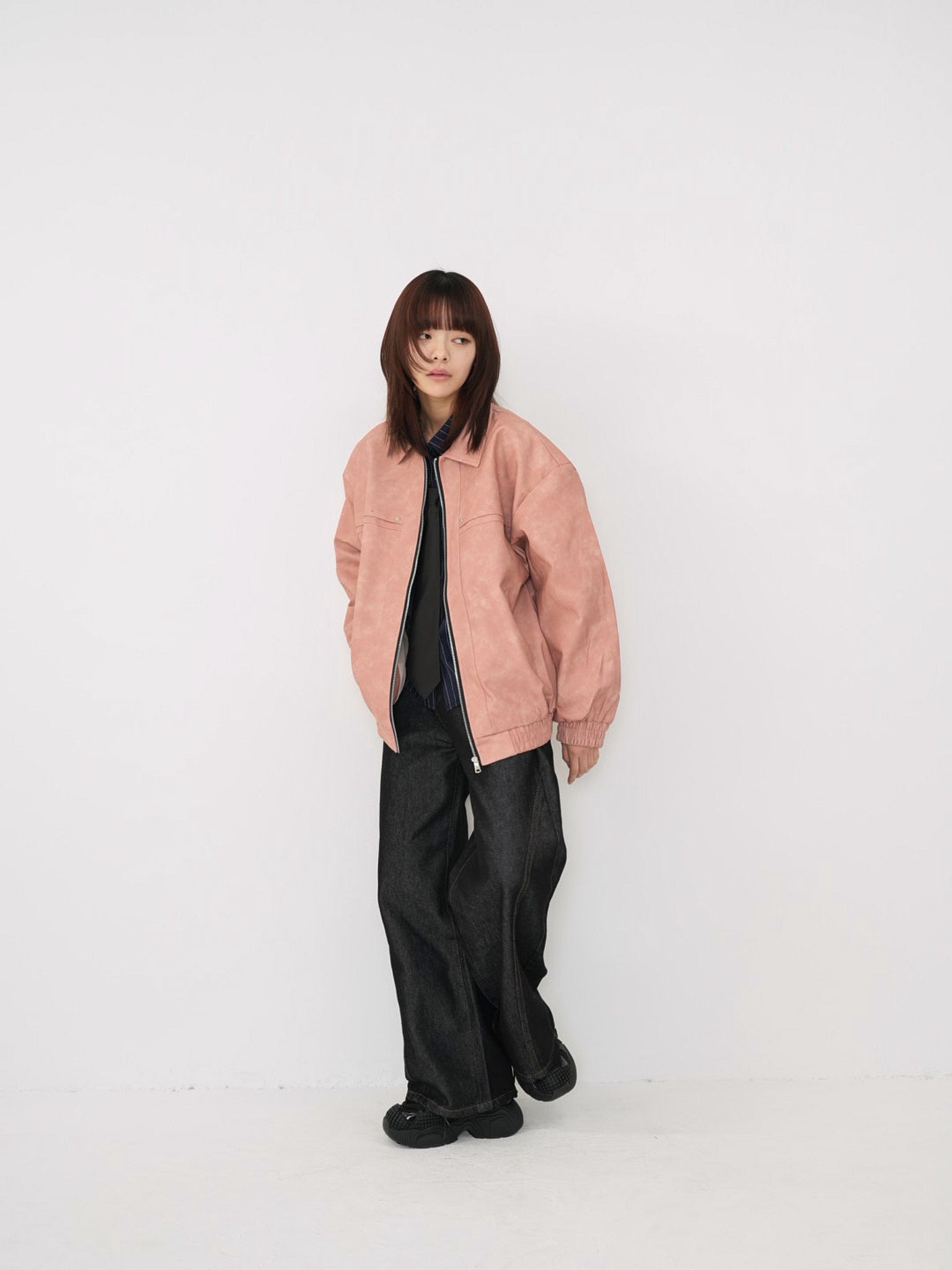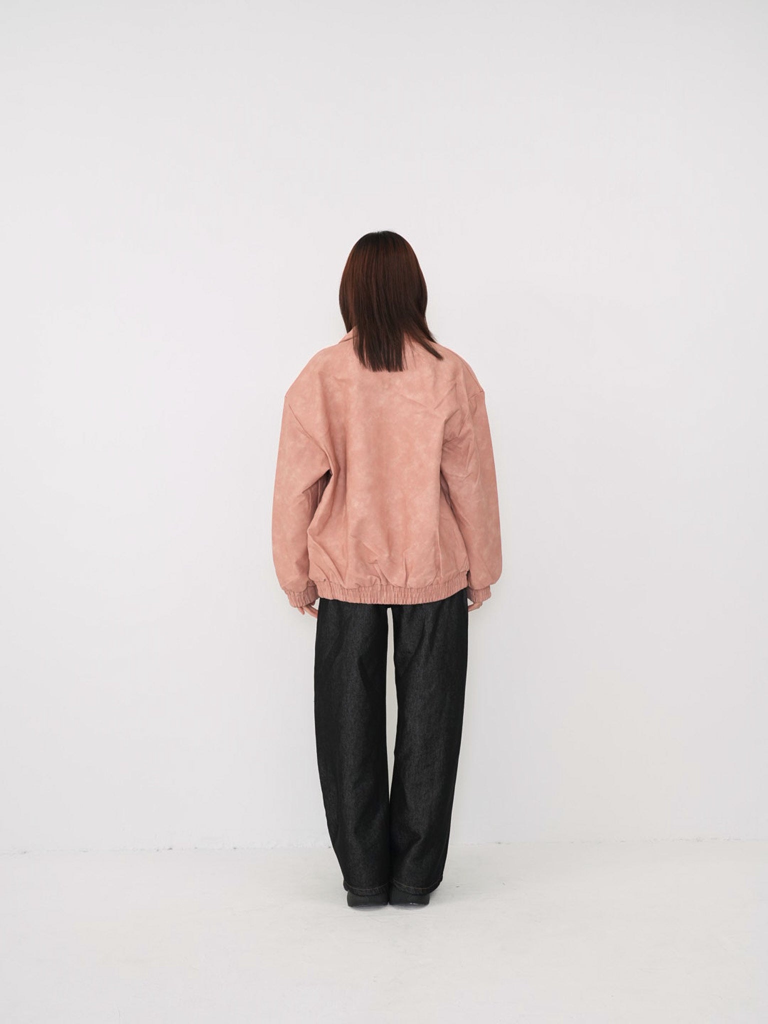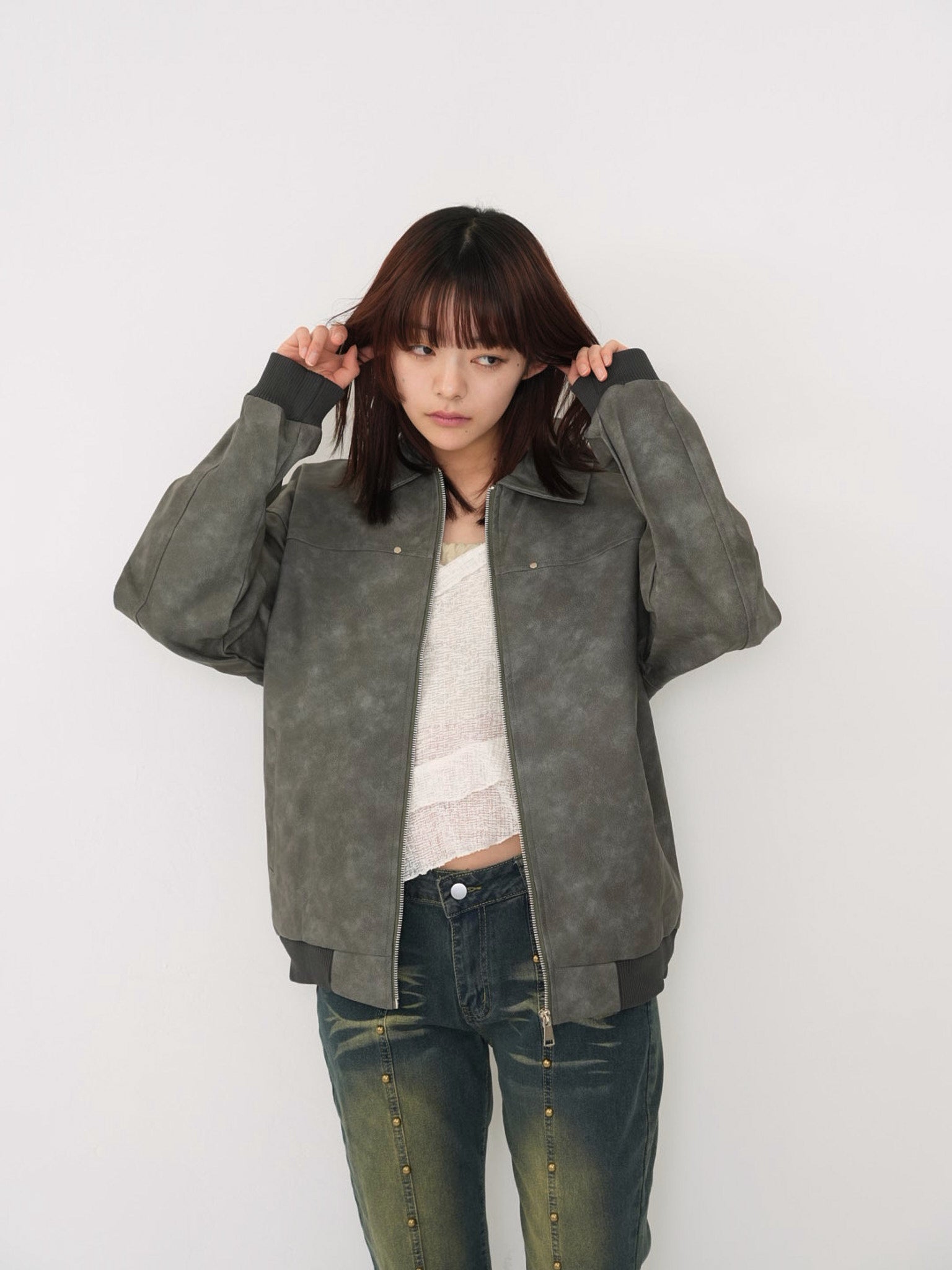 程よい艶感のあるフェイクレザー素材を使用したジップアップアウター。柔らかく軽い着心地で、ハードになりすぎず日常に取り入れやすい一着。丸みのあるシルエットが抜け感を演出し、羽織るだけでスタイリングに奥行きを与えます。