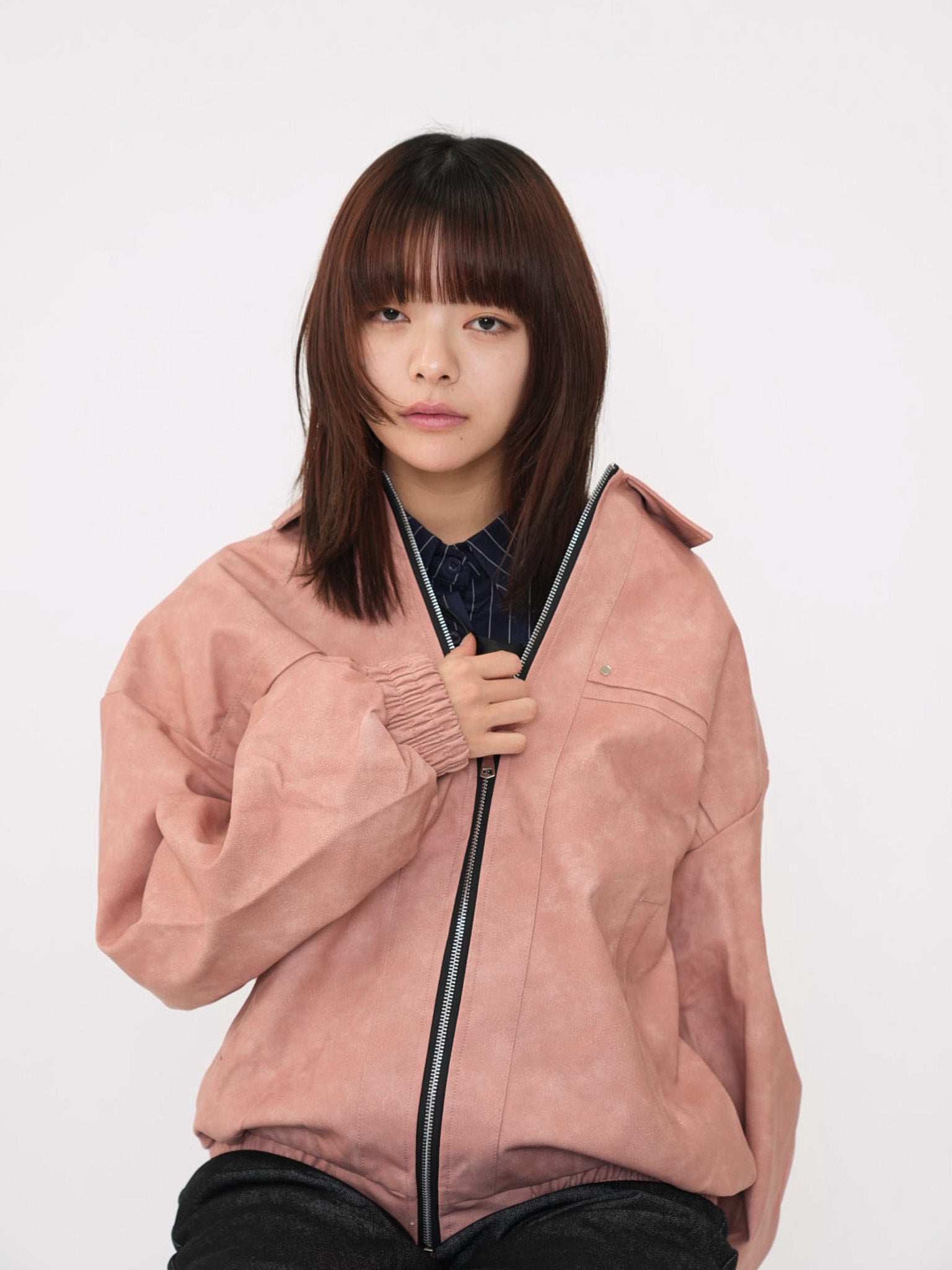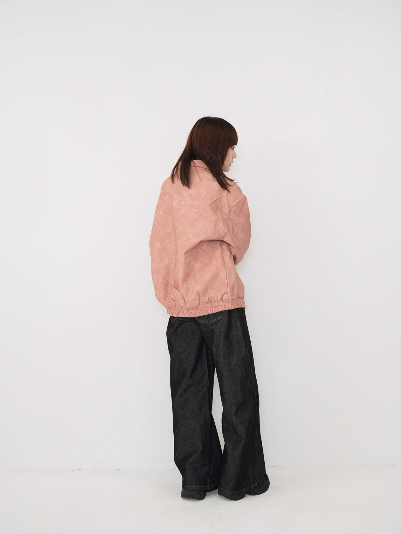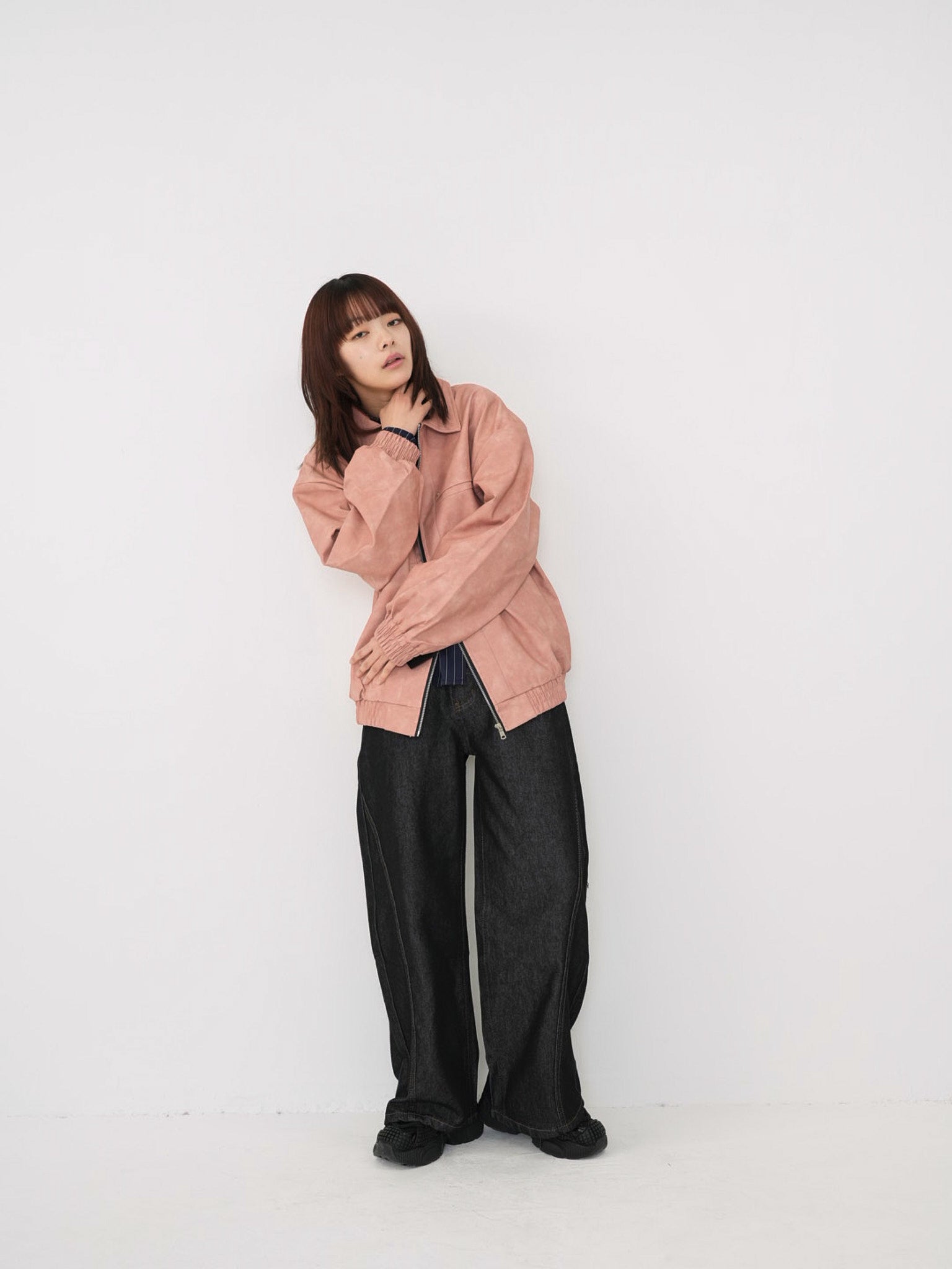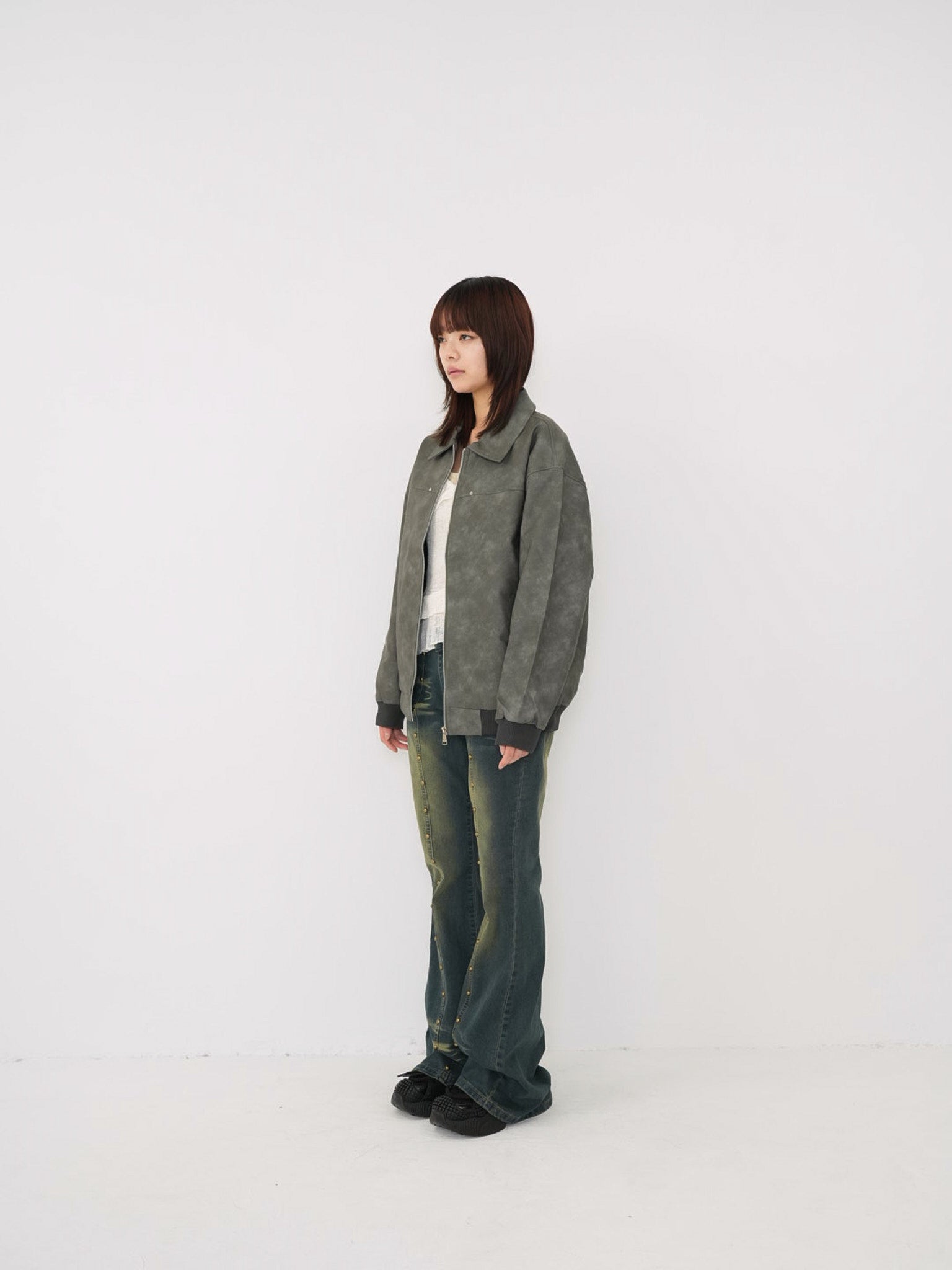 程よい艶感のあるフェイクレザー素材を使用したジップアップアウター。柔らかく軽い着心地で、ハードになりすぎず日常に取り入れやすい一着。丸みのあるシルエットが抜け感を演出し、羽織るだけでスタイリングに奥行きを与えます。