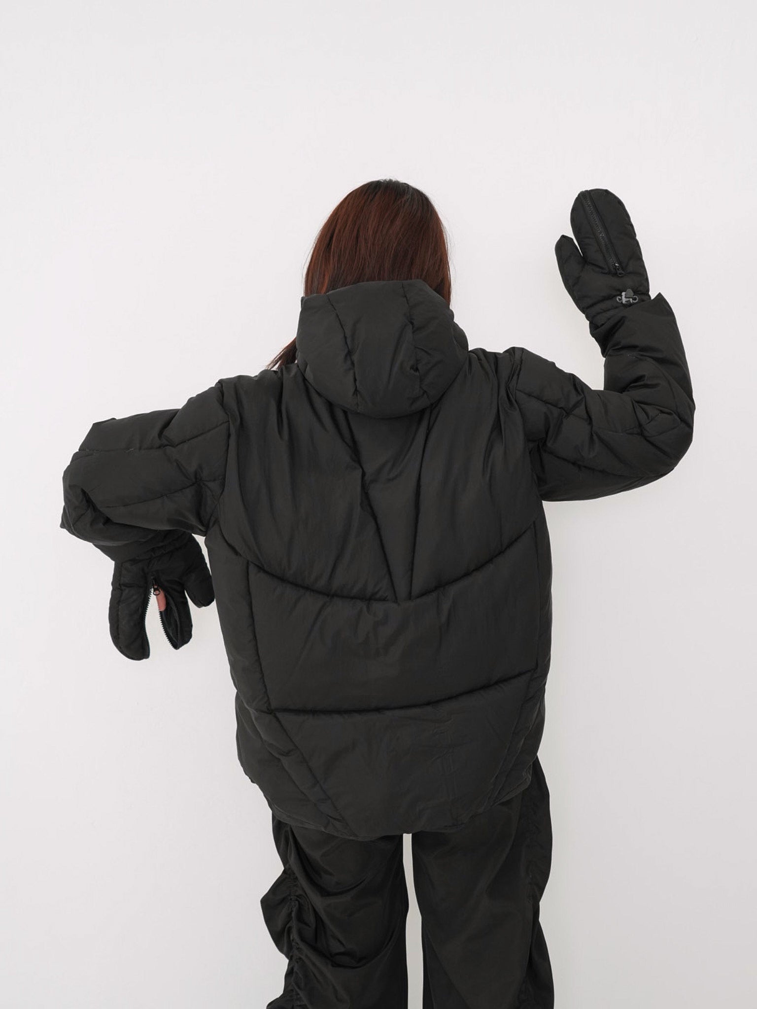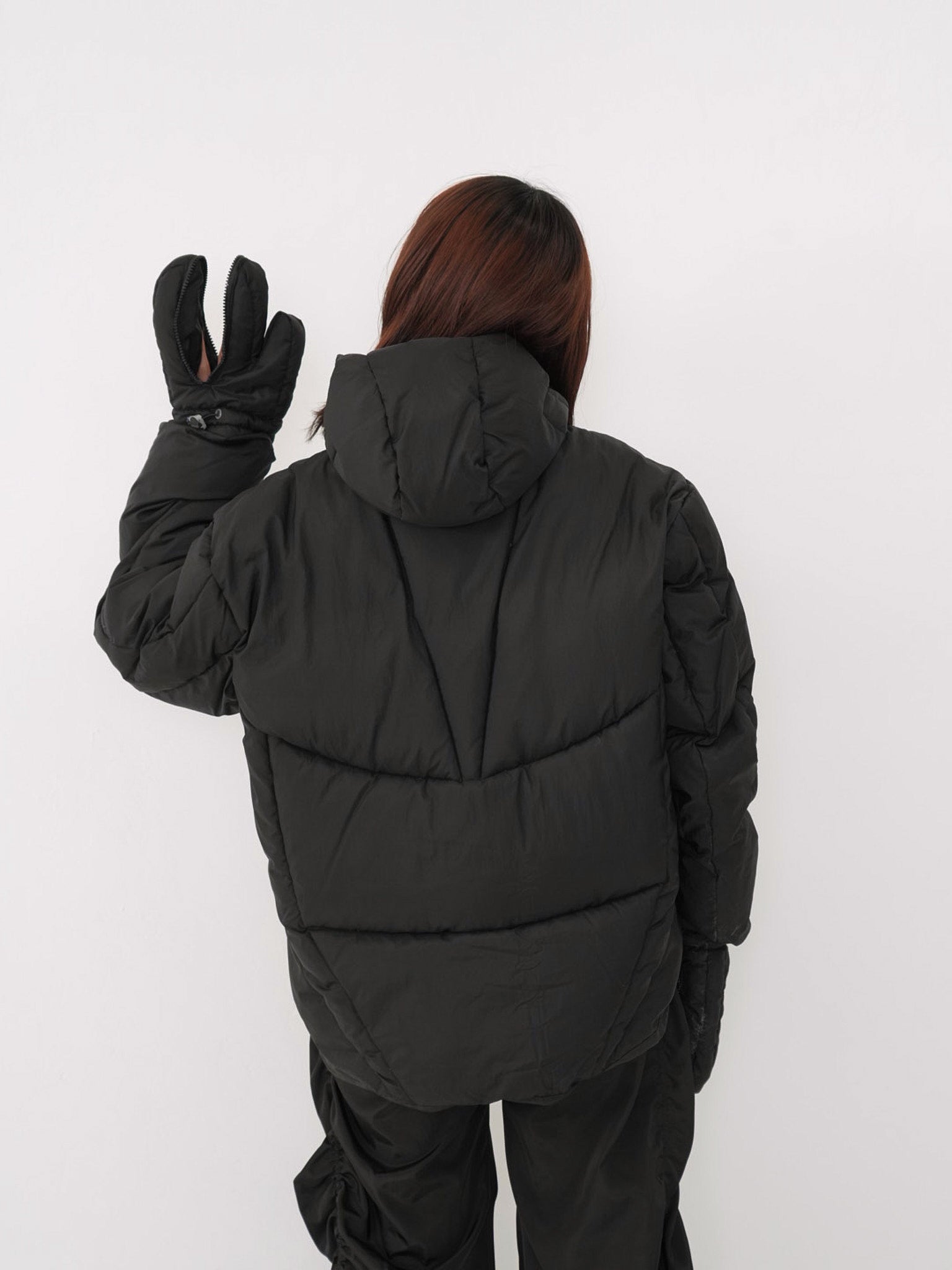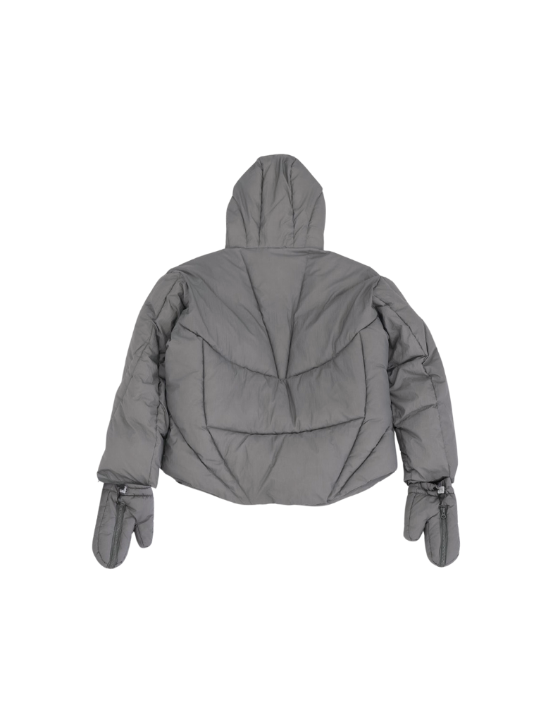 フードとグローブが一体化した、他にはないユニークなデザインのダウンジャケット。防寒性を高めながら、視覚的にも強いインパクトを与える一着。首元まで包み込む立体フードと中綿仕様で暖かく、機能と遊び心を両立した存在感のあるデザイン。