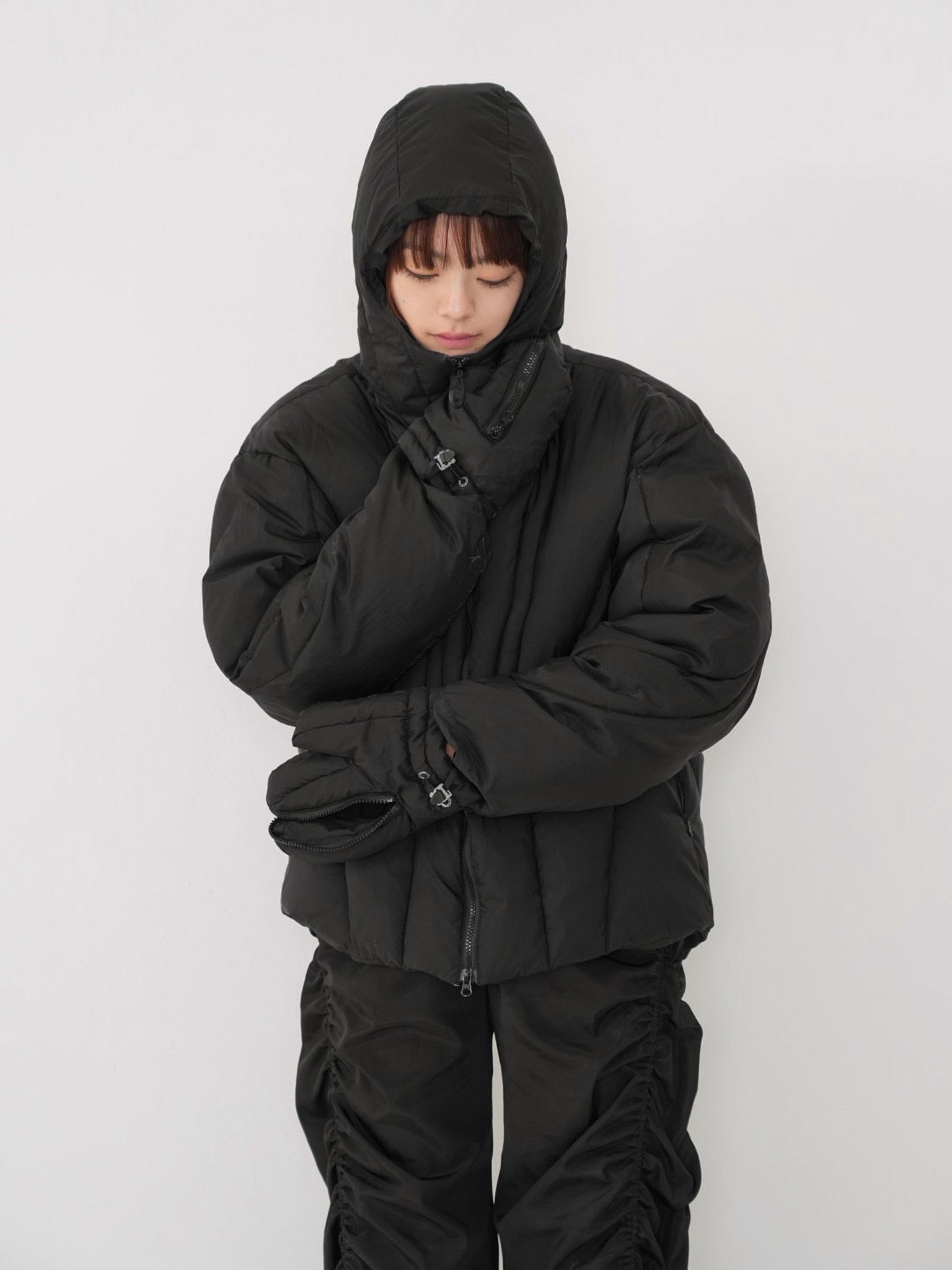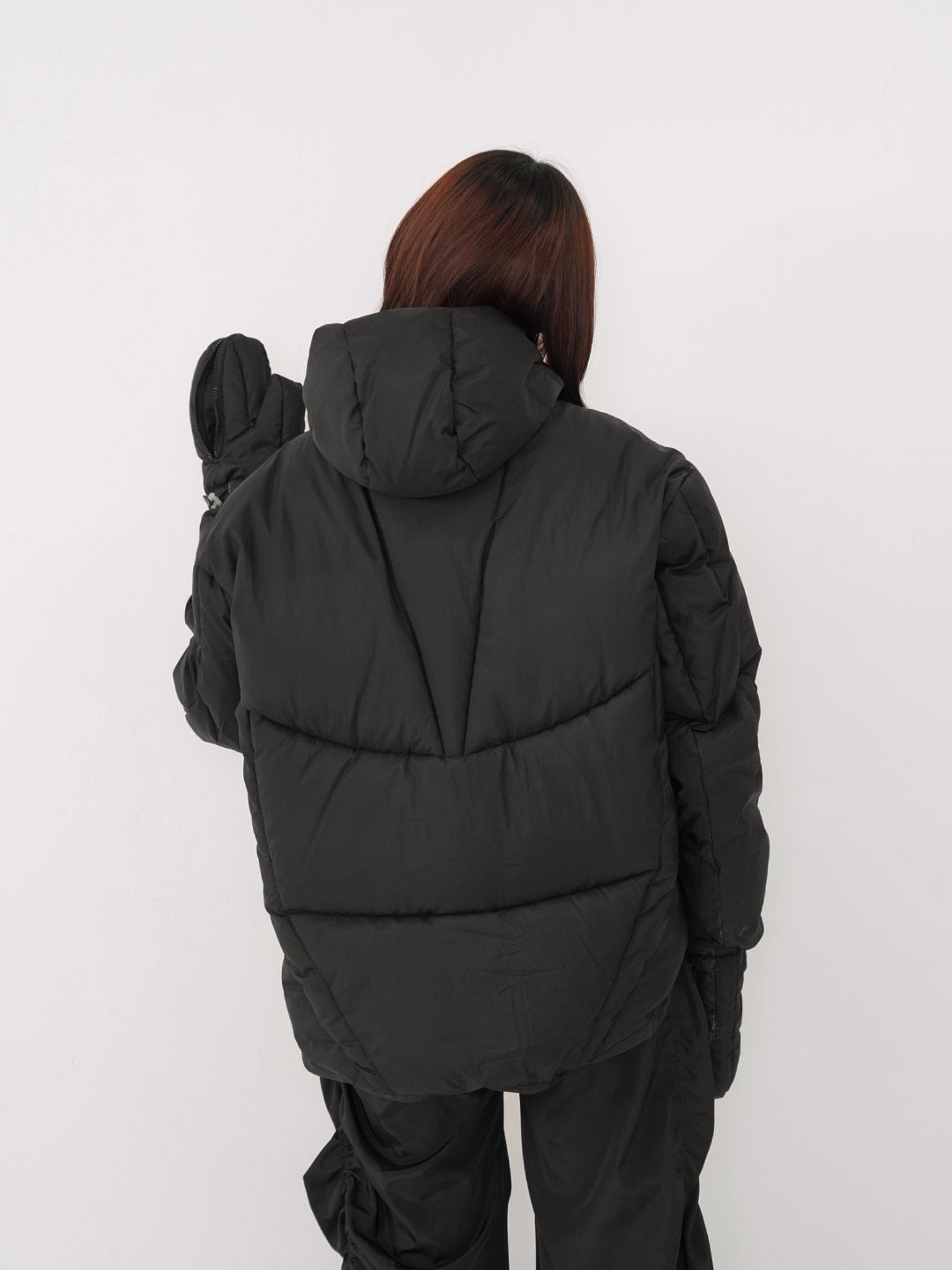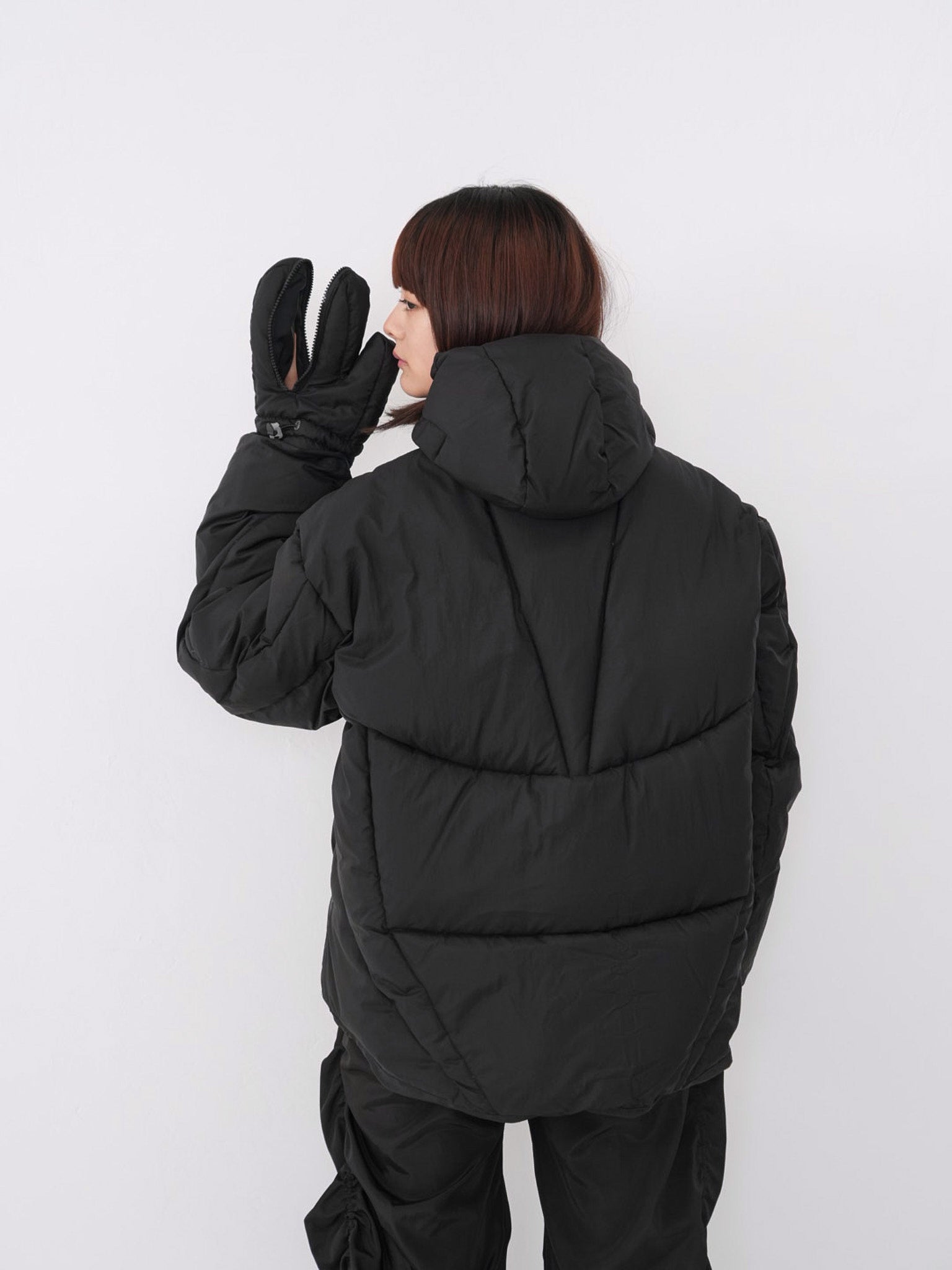 フードとグローブが一体化した、他にはないユニークなデザインのダウンジャケット。防寒性を高めながら、視覚的にも強いインパクトを与える一着。首元まで包み込む立体フードと中綿仕様で暖かく、機能と遊び心を両立した存在感のあるデザイン。