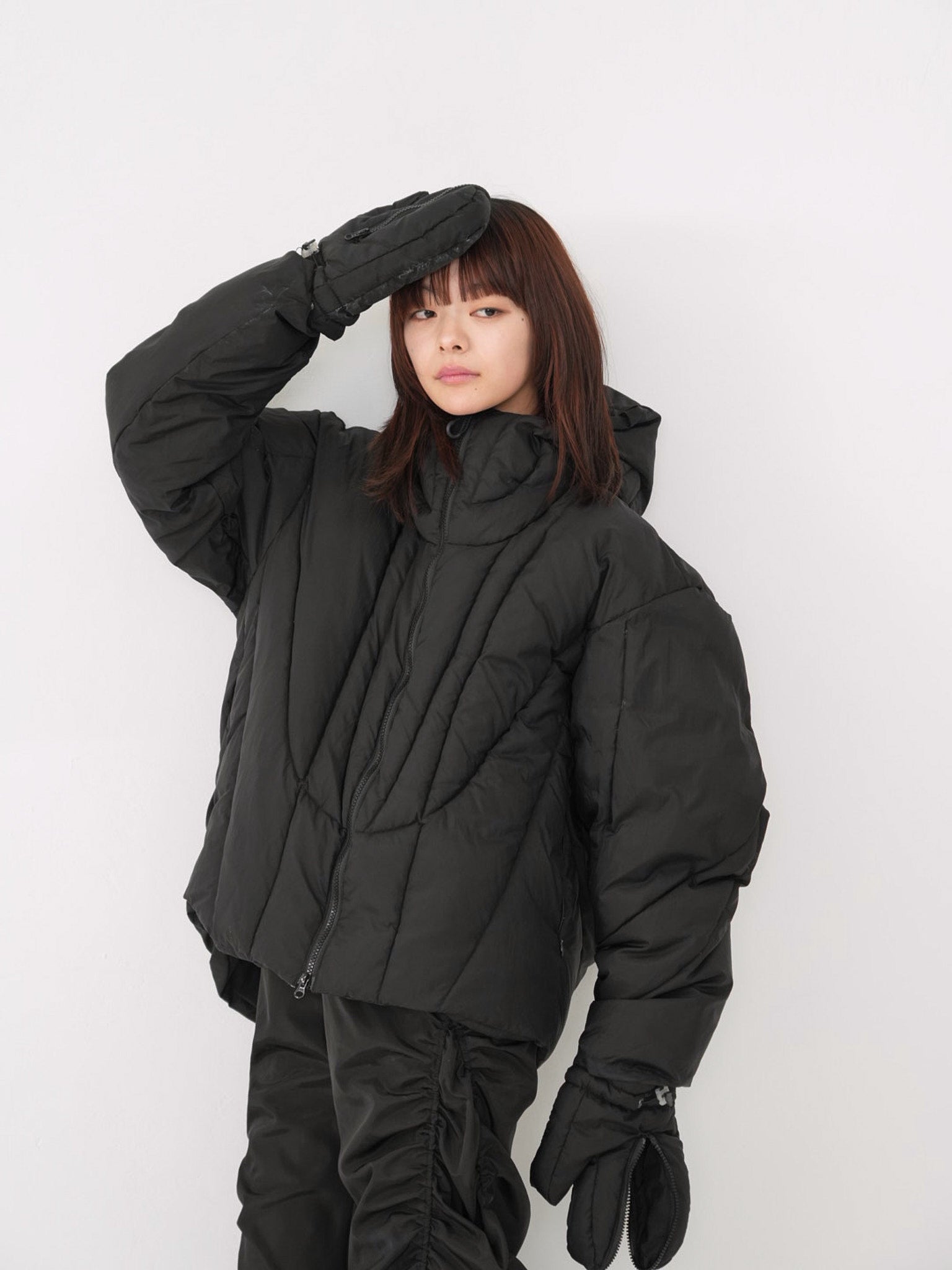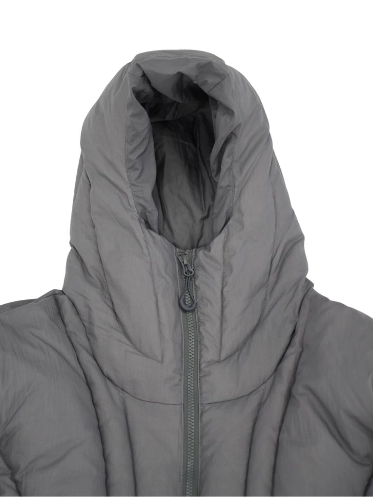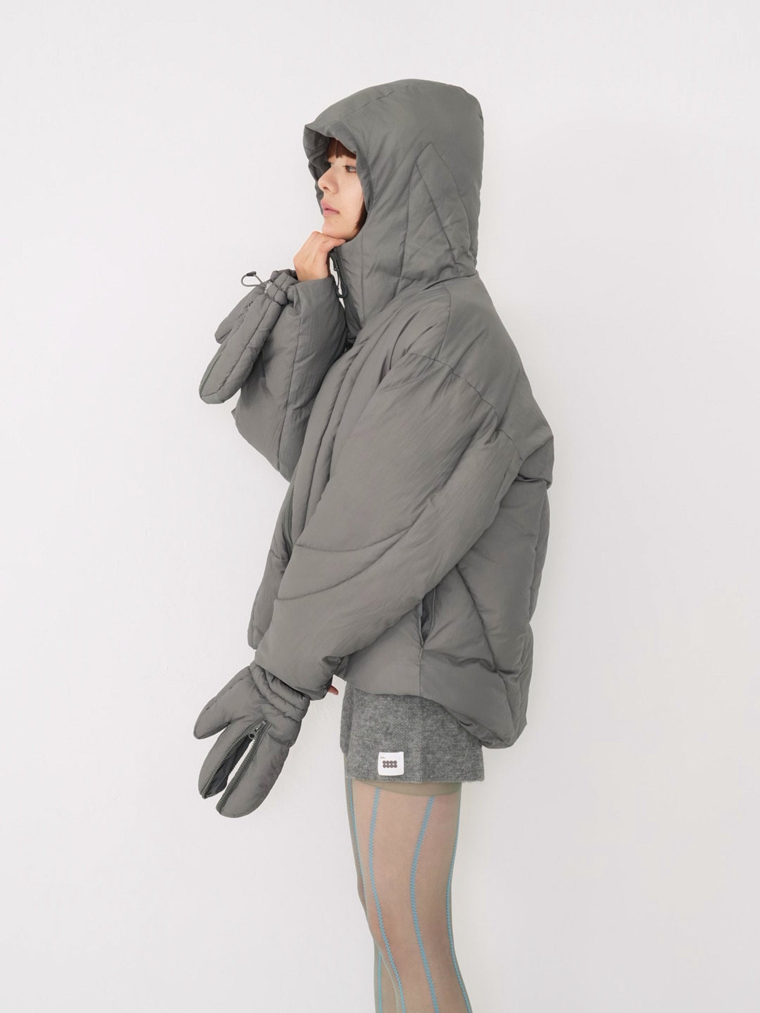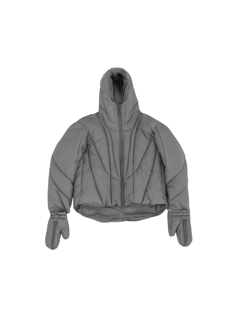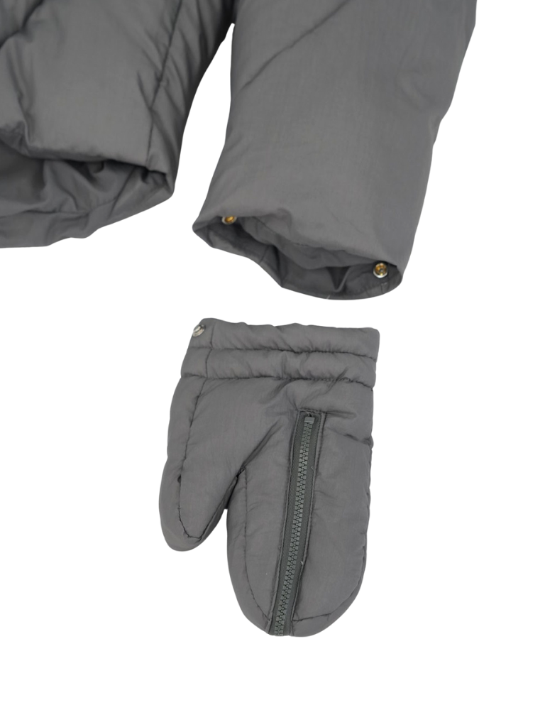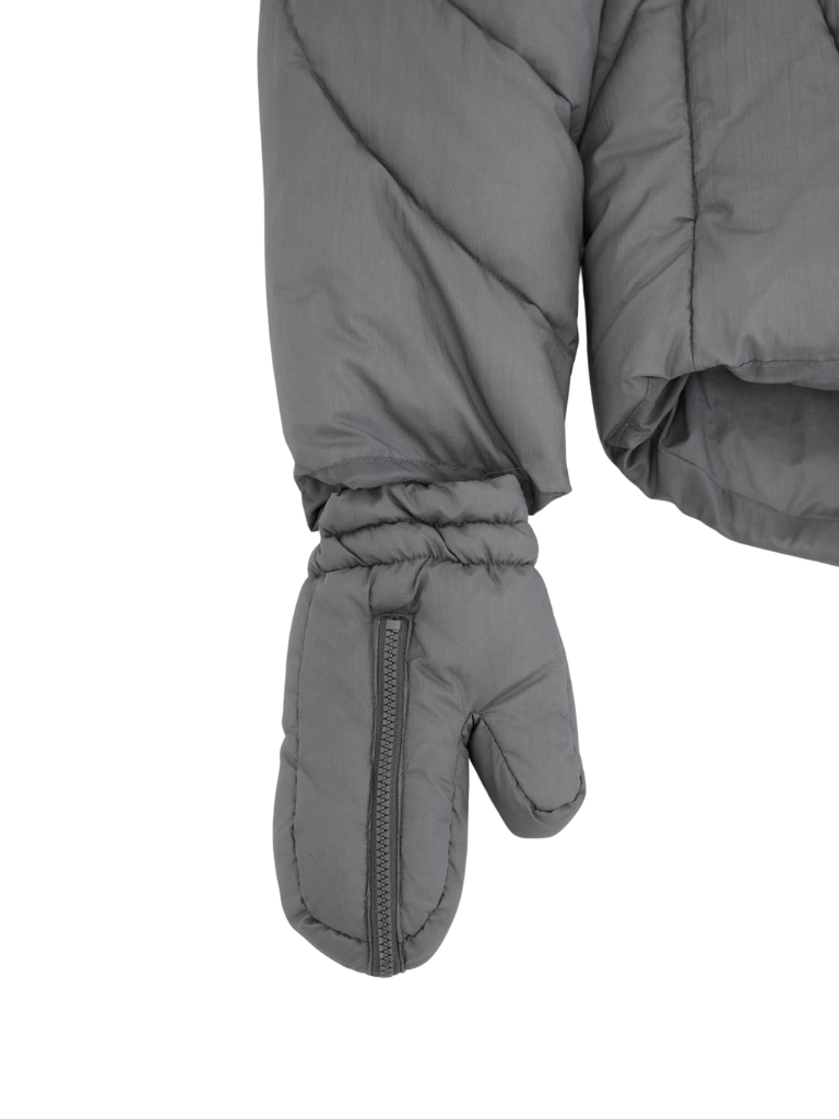 これは服というより、ちょっとした装備。フードとグローブが最初から付いていて、「寒いからどうしよう」を考える前にもう完成している。着る人の準備不足さえ受け止めてくれる、やさしくて変なダウン。ユニークな見た目は、目立つためじゃなく、迷わないため。防寒も、スタイルも、気分も全部まとめて包み込む。今日は外に出るだけ。それ以上のことは、この服がやってくれる。