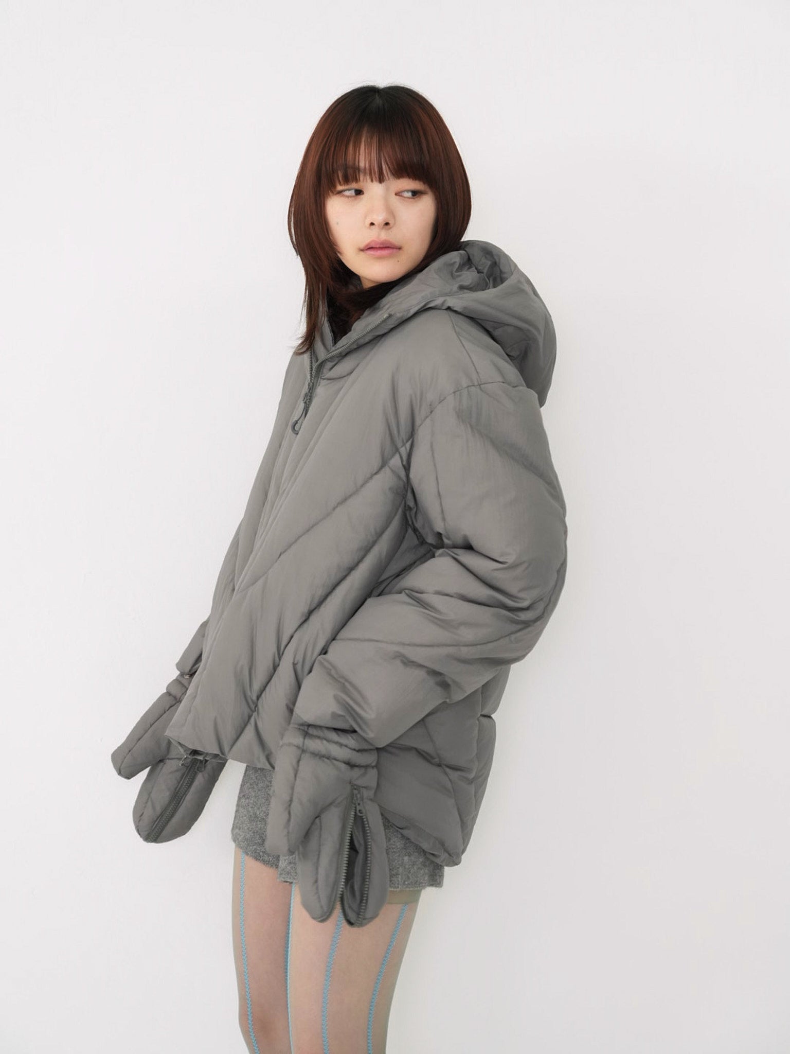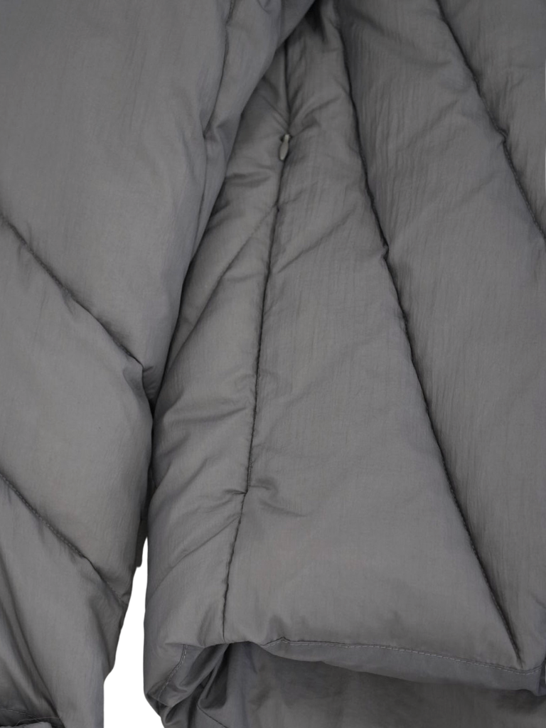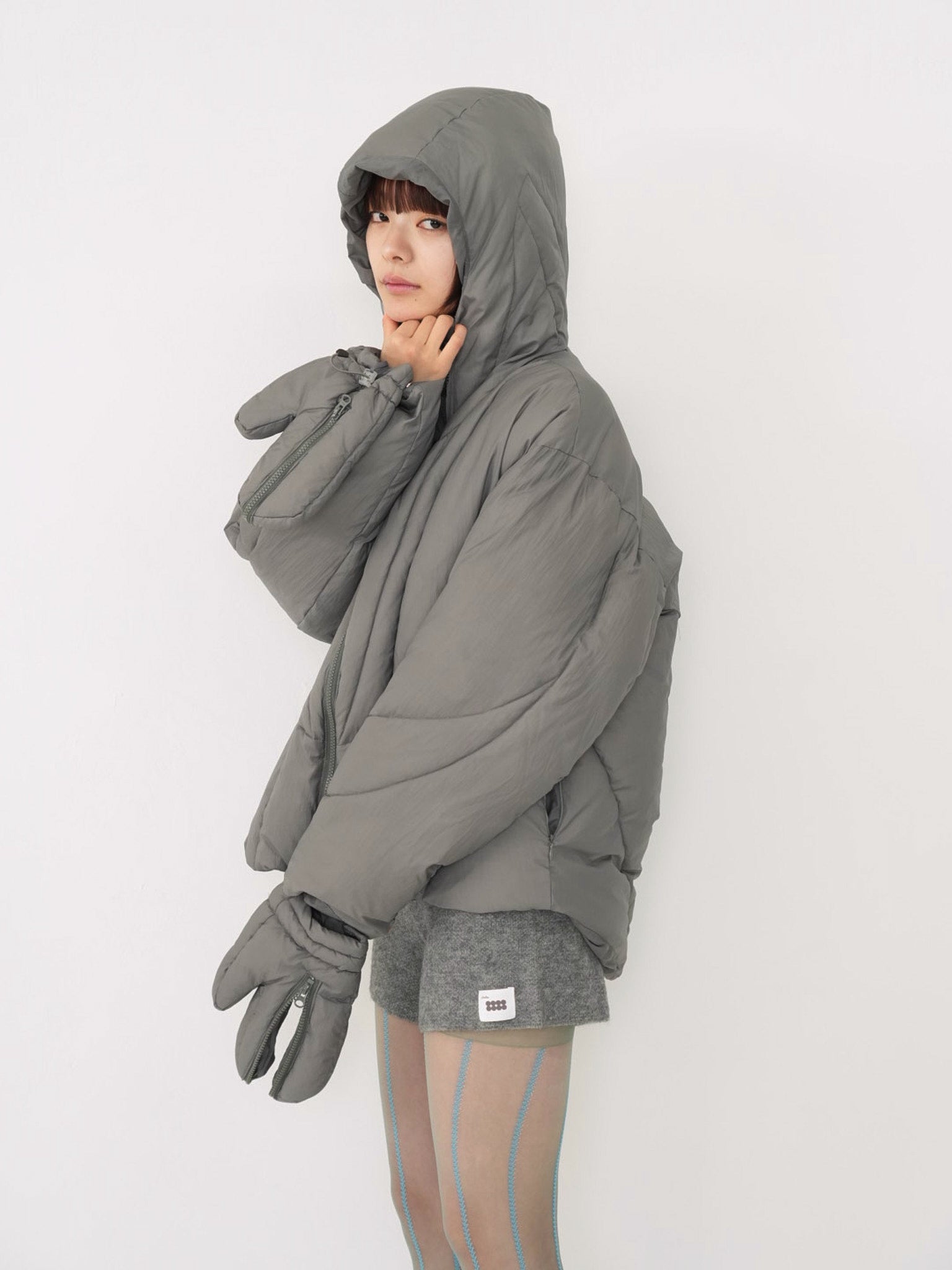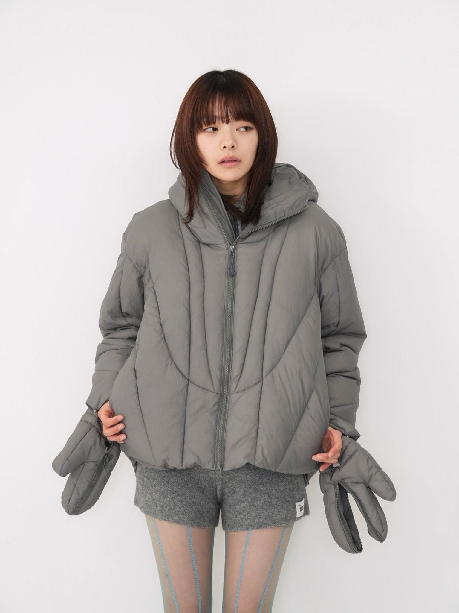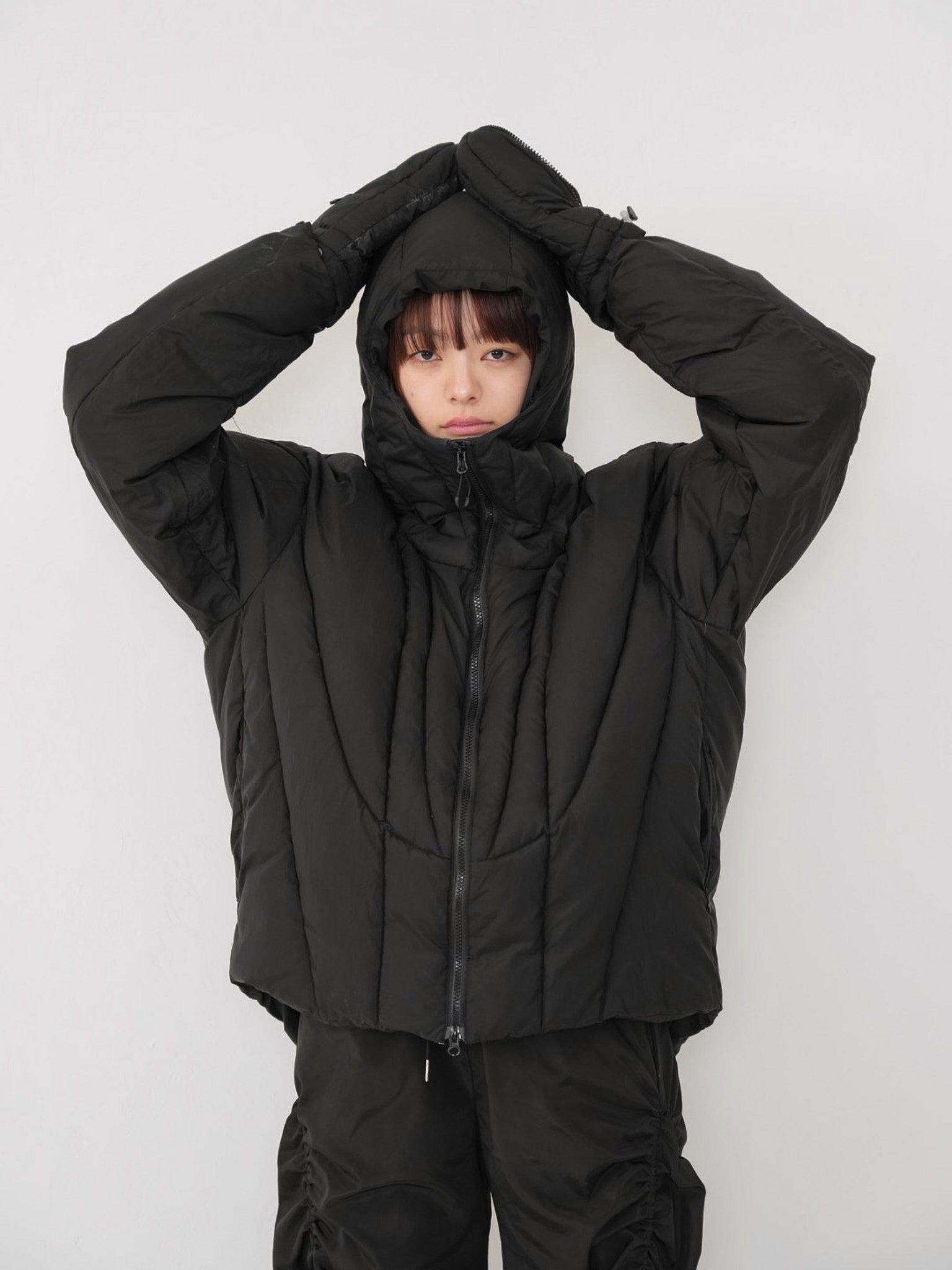 これは服というより、ちょっとした装備。フードとグローブが最初から付いていて、「寒いからどうしよう」を考える前にもう完成している。着る人の準備不足さえ受け止めてくれる、やさしくて変なダウン。ユニークな見た目は、目立つためじゃなく、迷わないため。防寒も、スタイルも、気分も全部まとめて包み込む。今日は外に出るだけ。それ以上のことは、この服がやってくれる。