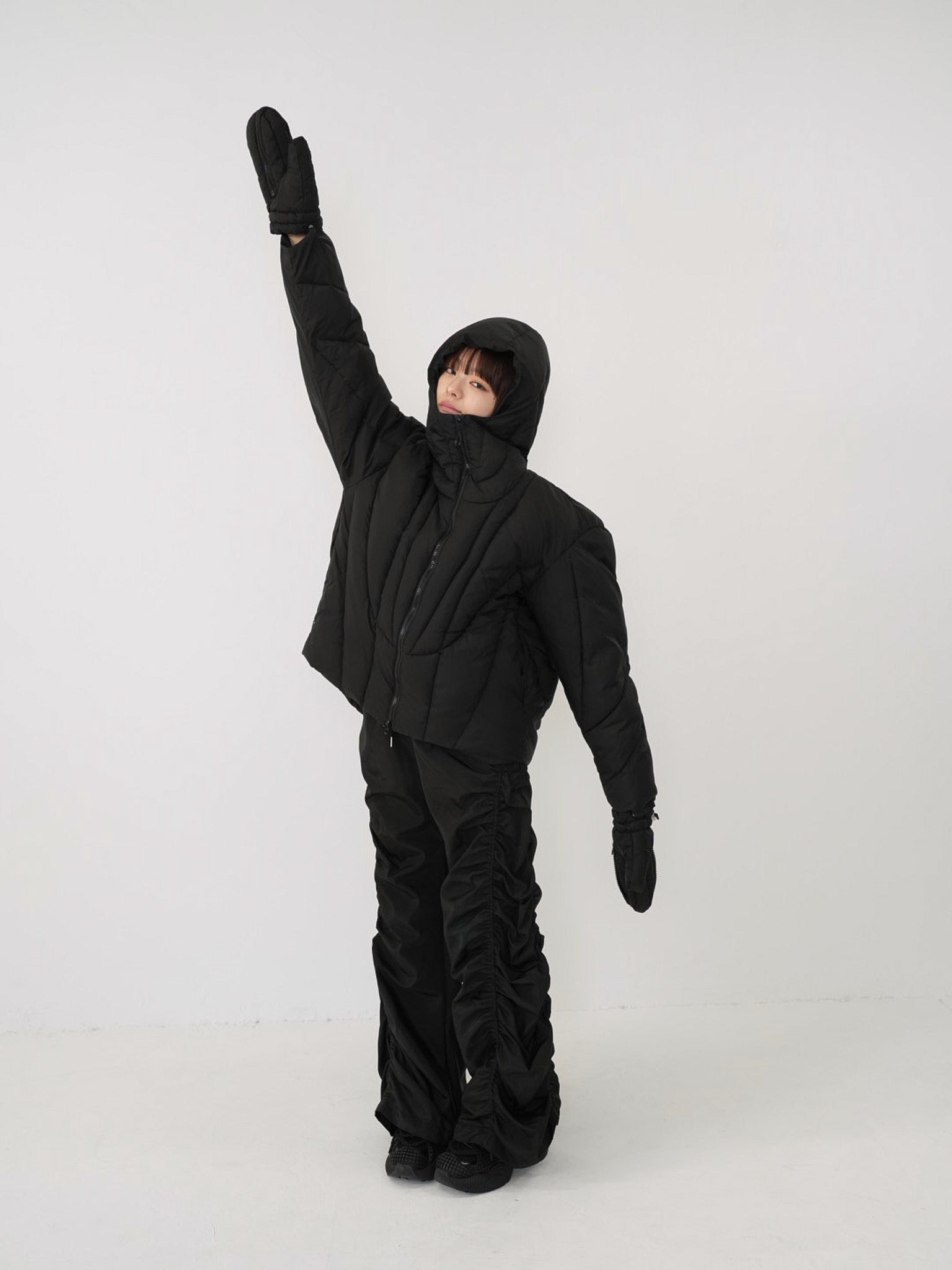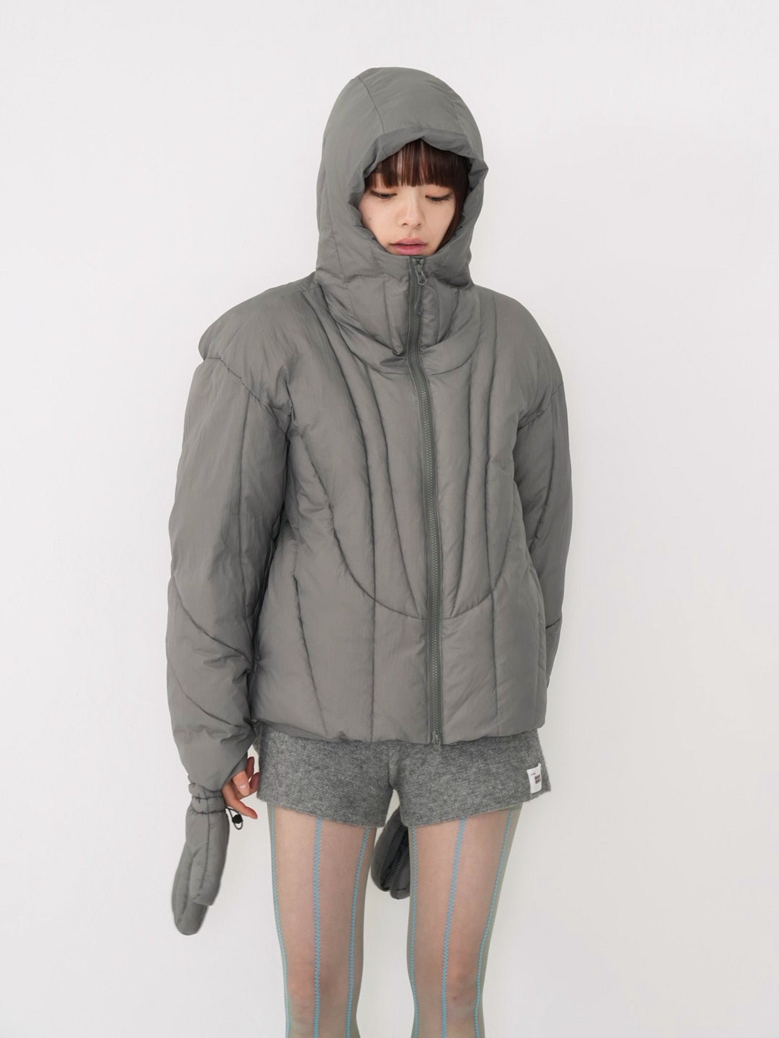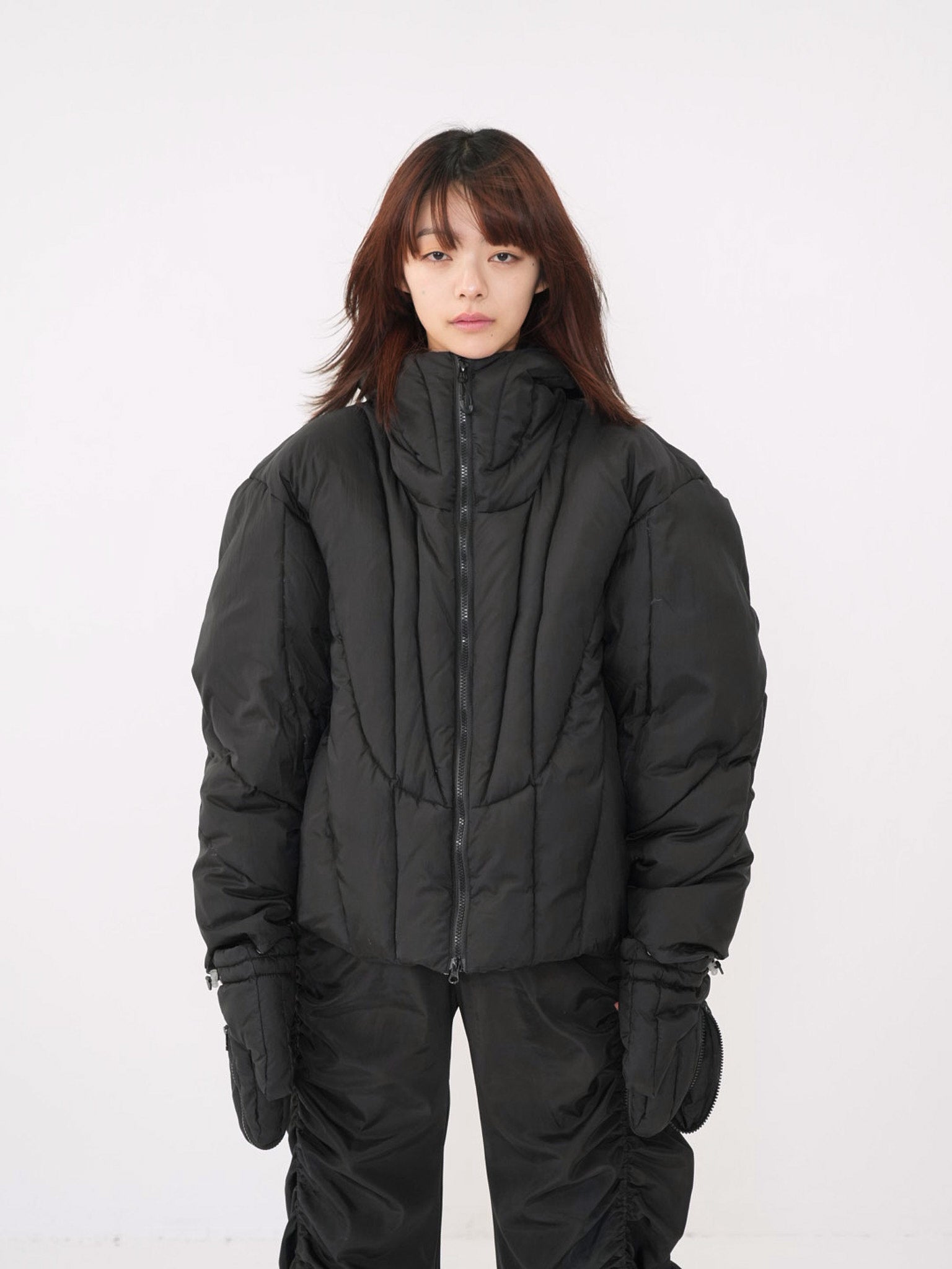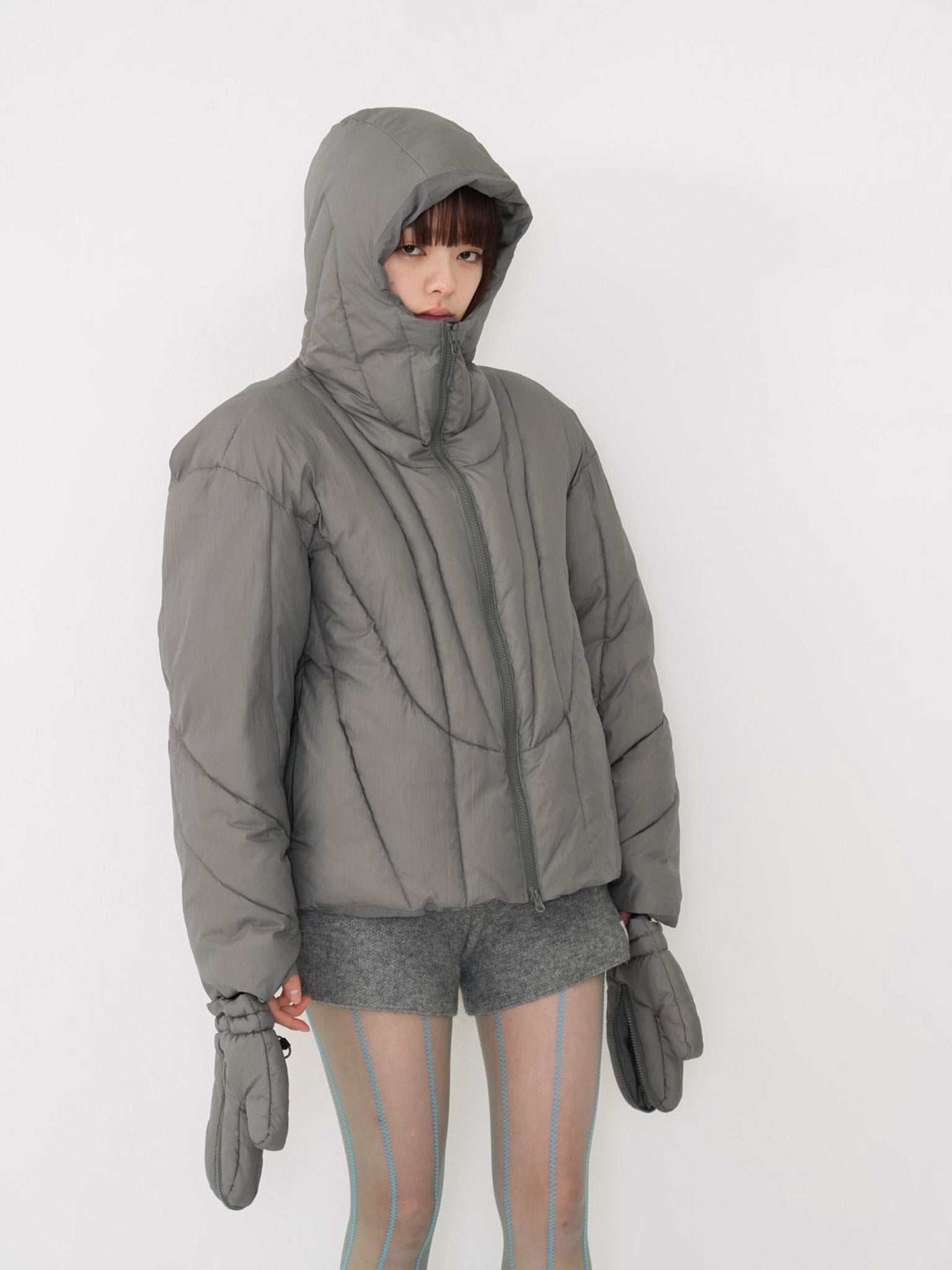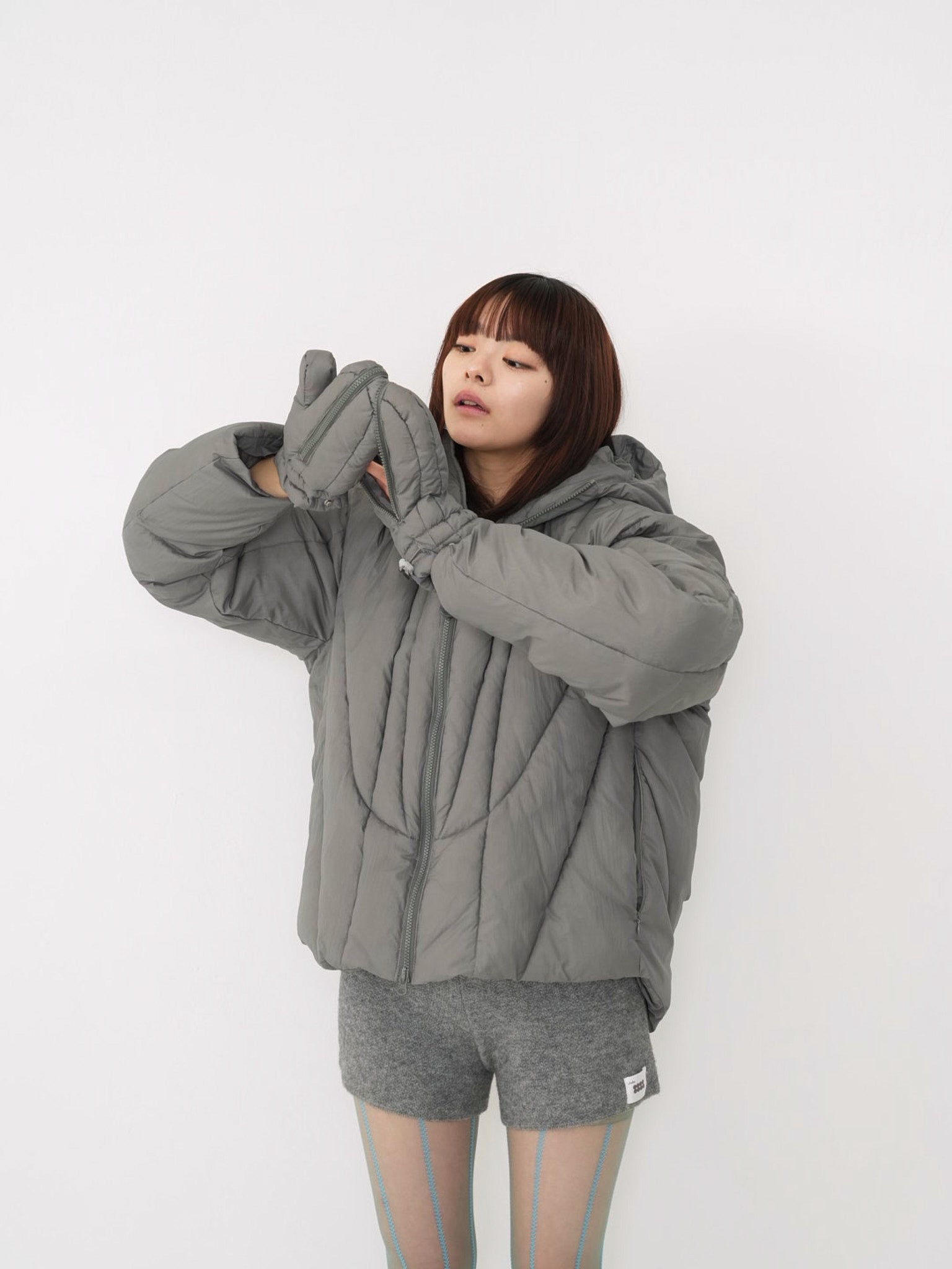 これは服というより、ちょっとした装備。フードとグローブが最初から付いていて、「寒いからどうしよう」を考える前にもう完成している。着る人の準備不足さえ受け止めてくれる、やさしくて変なダウン。ユニークな見た目は、目立つためじゃなく、迷わないため。防寒も、スタイルも、気分も全部まとめて包み込む。今日は外に出るだけ。それ以上のことは、この服がやってくれる。