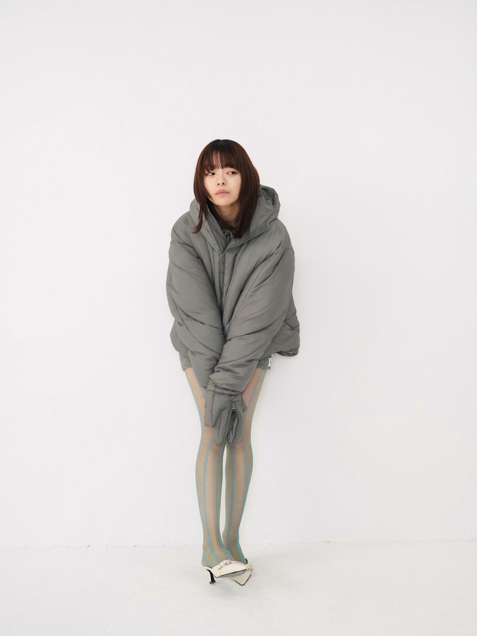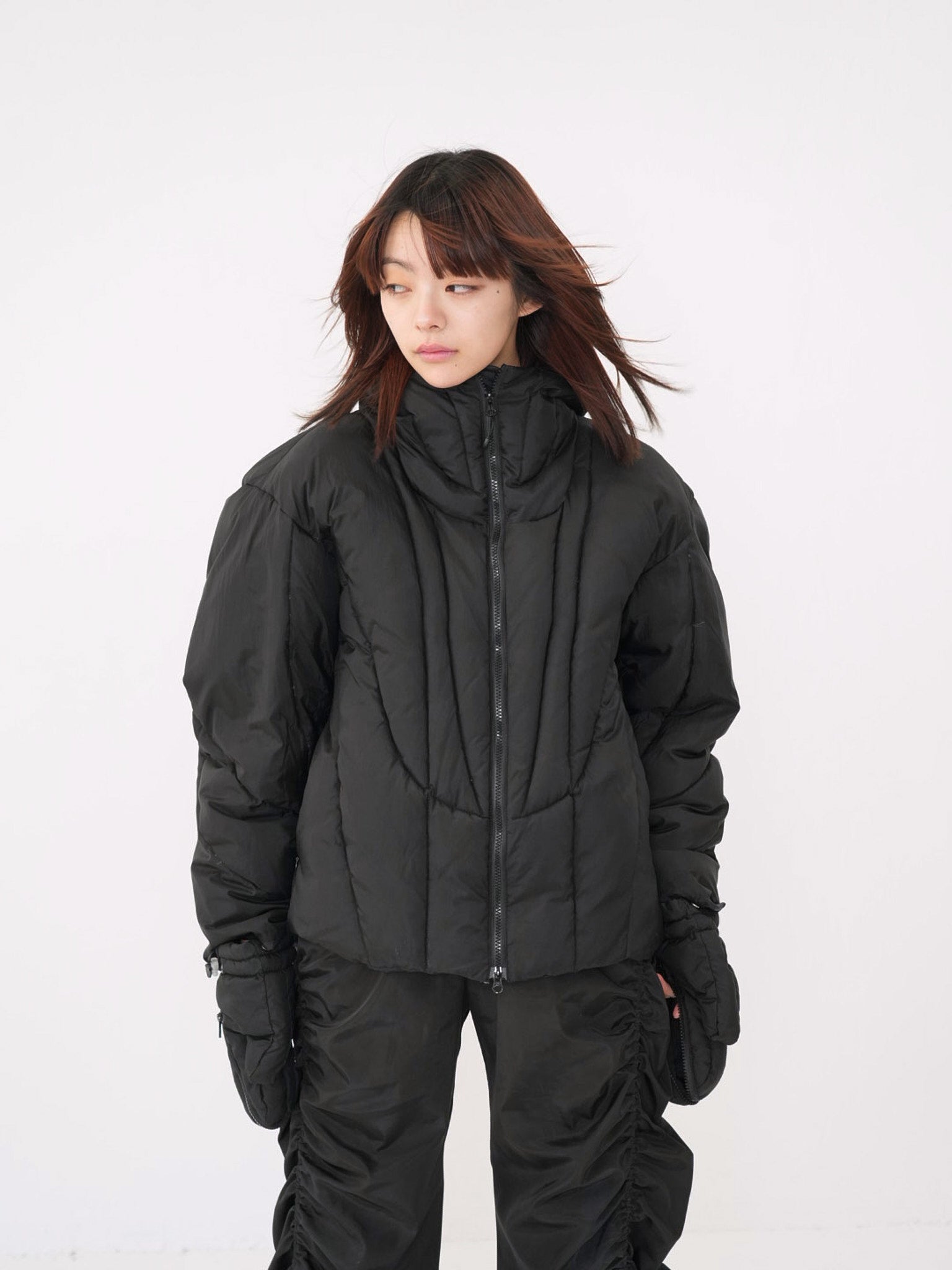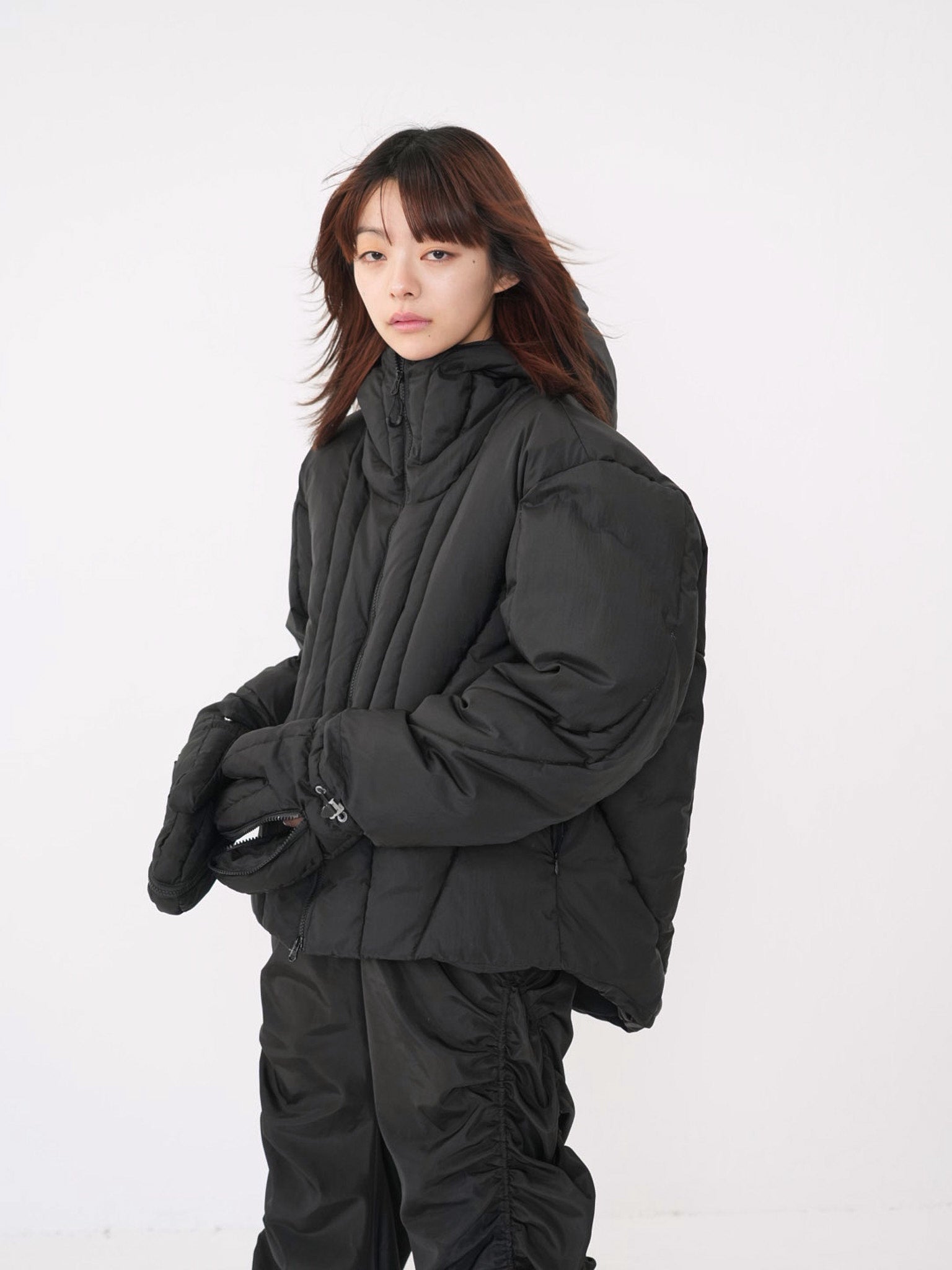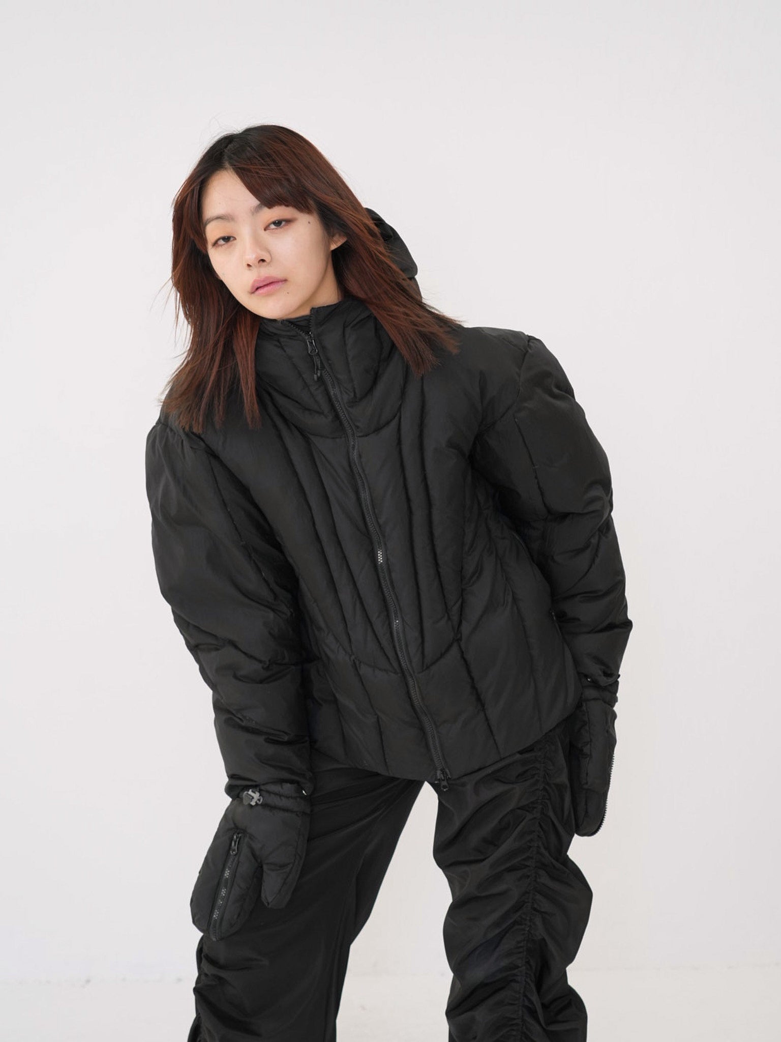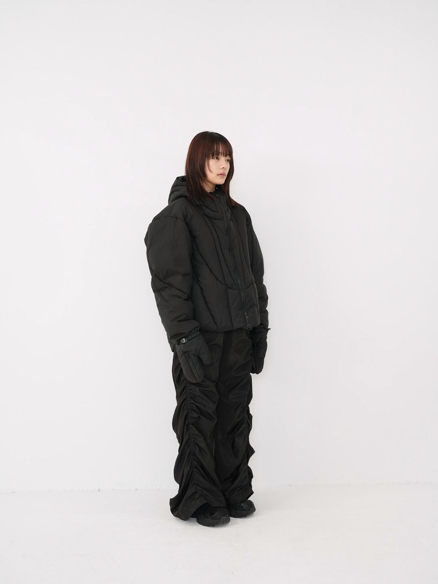 これは服というより、ちょっとした装備。フードとグローブが最初から付いていて、「寒いからどうしよう」を考える前にもう完成している。着る人の準備不足さえ受け止めてくれる、やさしくて変なダウン。ユニークな見た目は、目立つためじゃなく、迷わないため。防寒も、スタイルも、気分も全部まとめて包み込む。今日は外に出るだけ。それ以上のことは、この服がやってくれる。