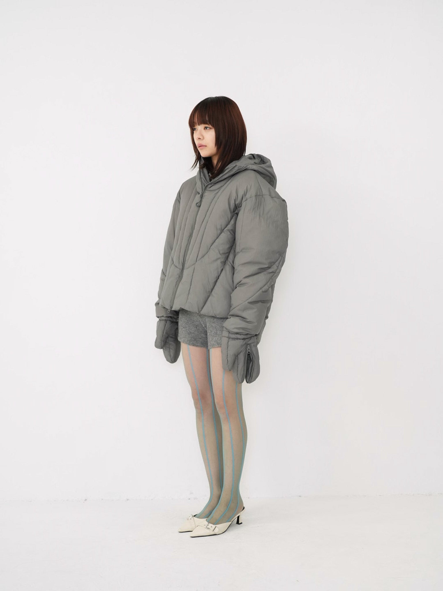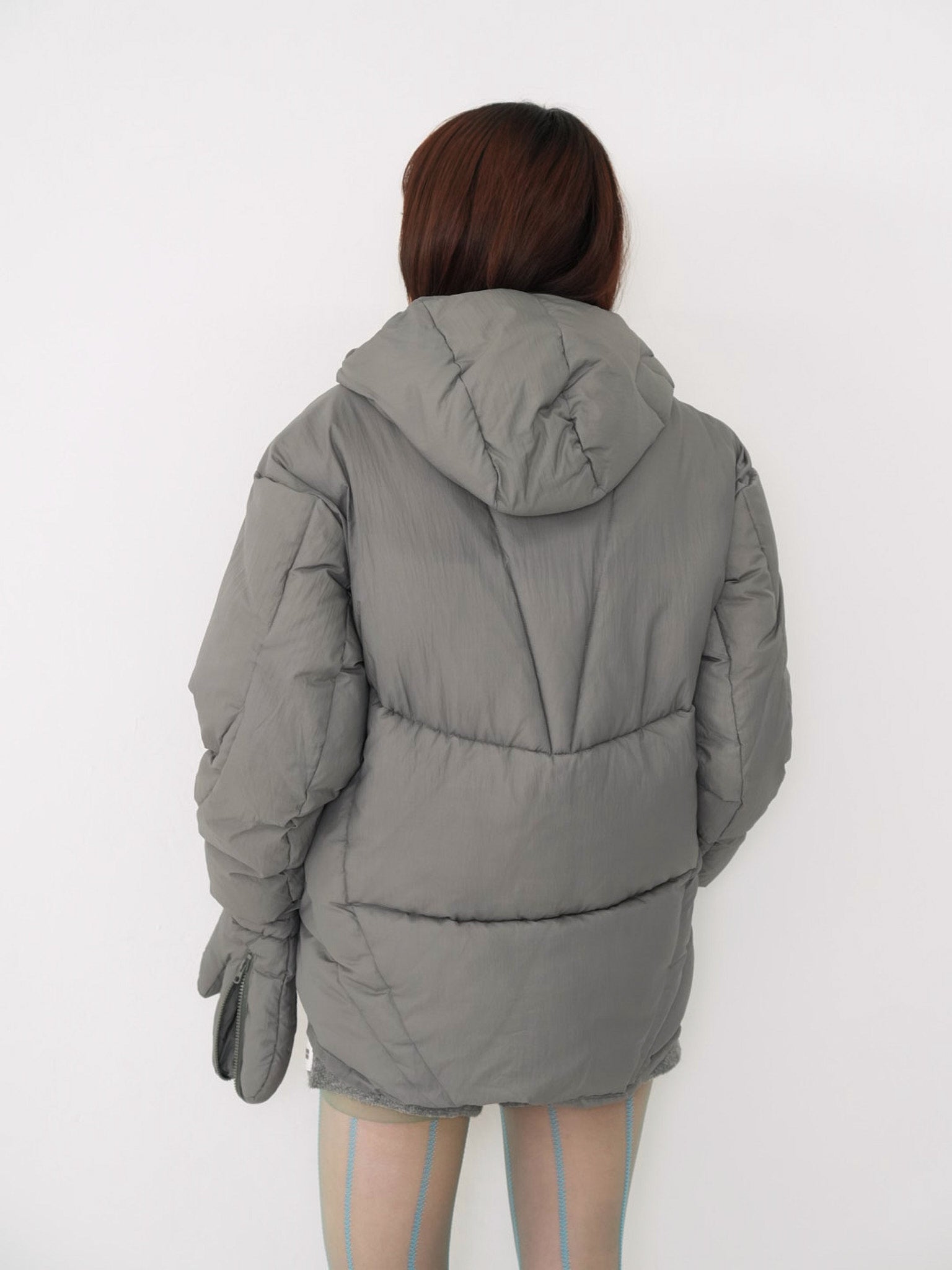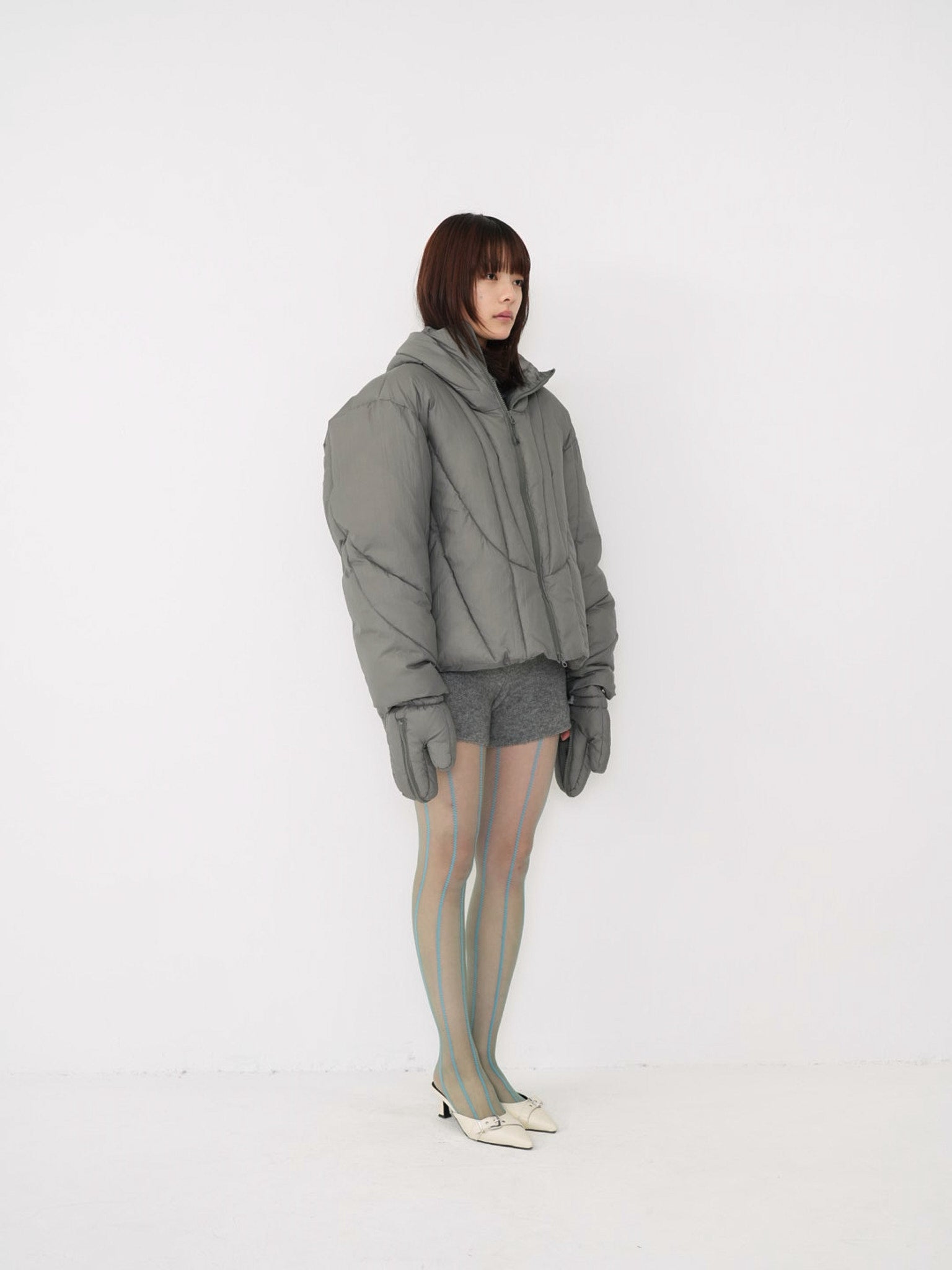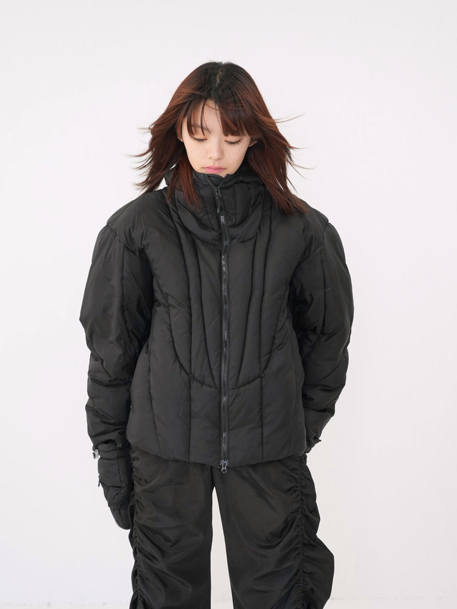 これは服というより、ちょっとした装備。フードとグローブが最初から付いていて、「寒いからどうしよう」を考える前にもう完成している。着る人の準備不足さえ受け止めてくれる、やさしくて変なダウン。ユニークな見た目は、目立つためじゃなく、迷わないため。防寒も、スタイルも、気分も全部まとめて包み込む。今日は外に出るだけ。それ以上のことは、この服がやってくれる。