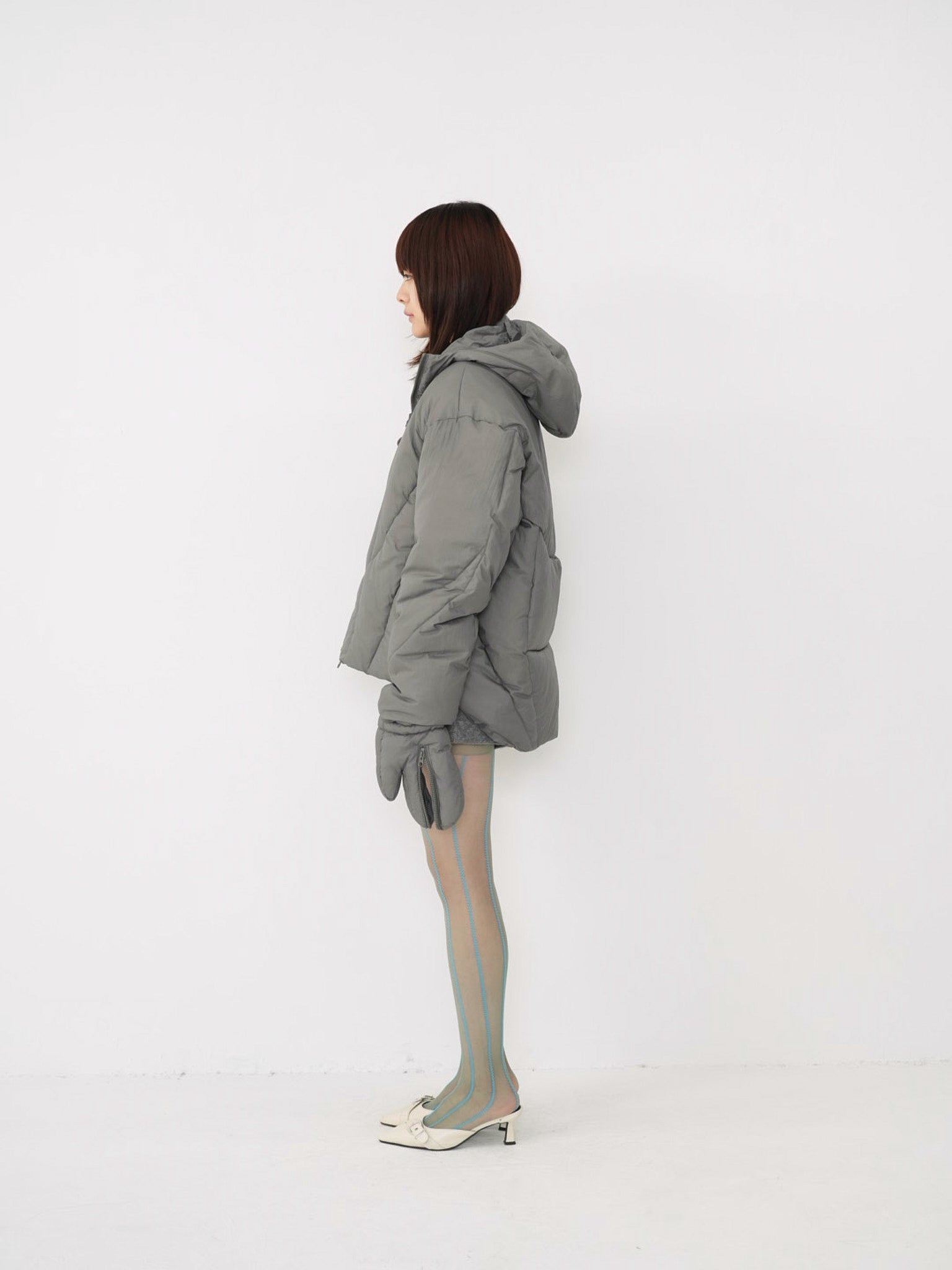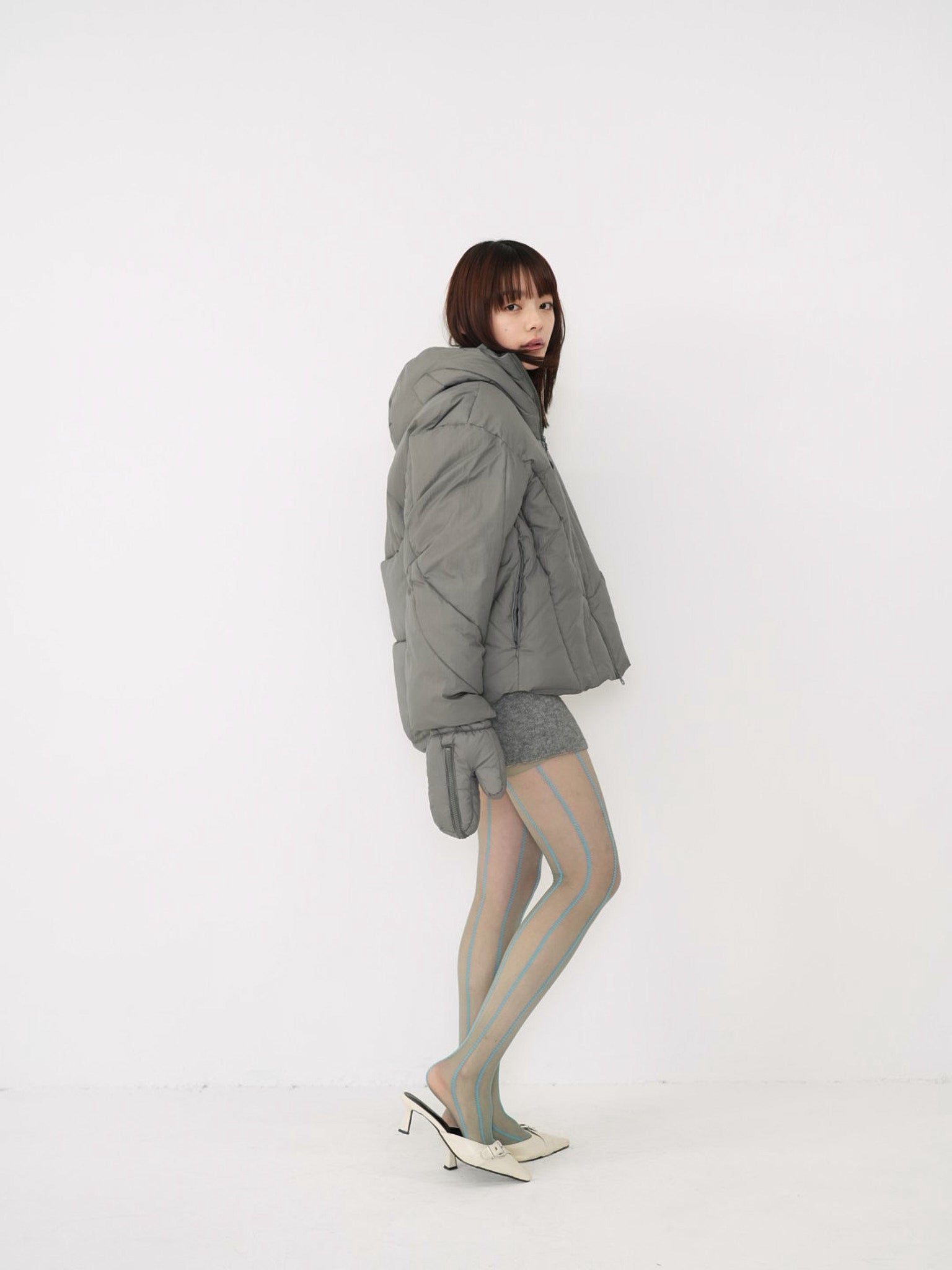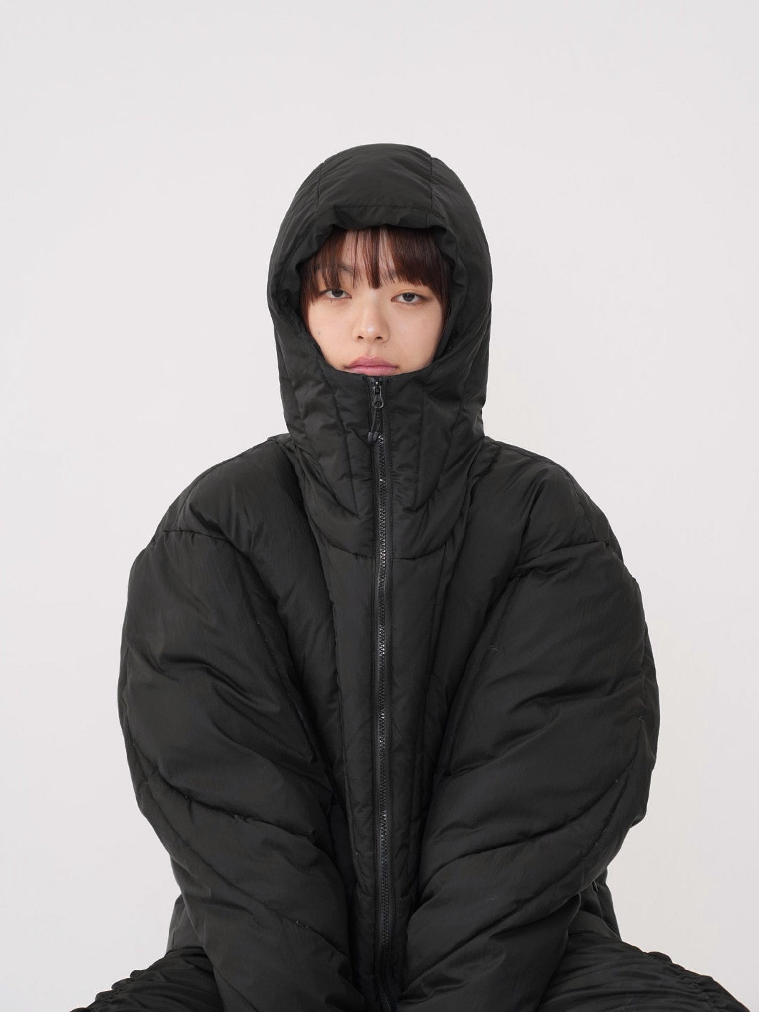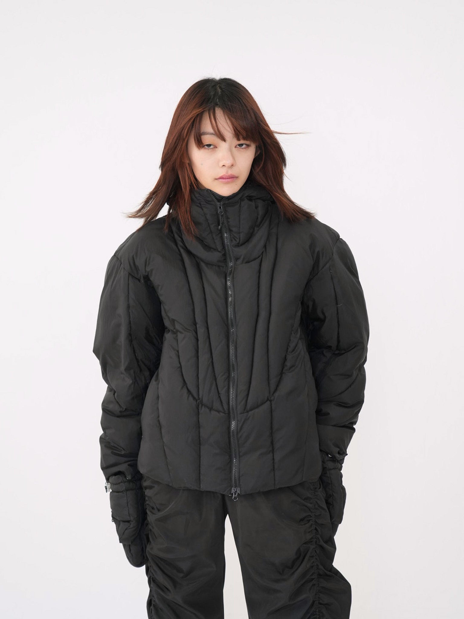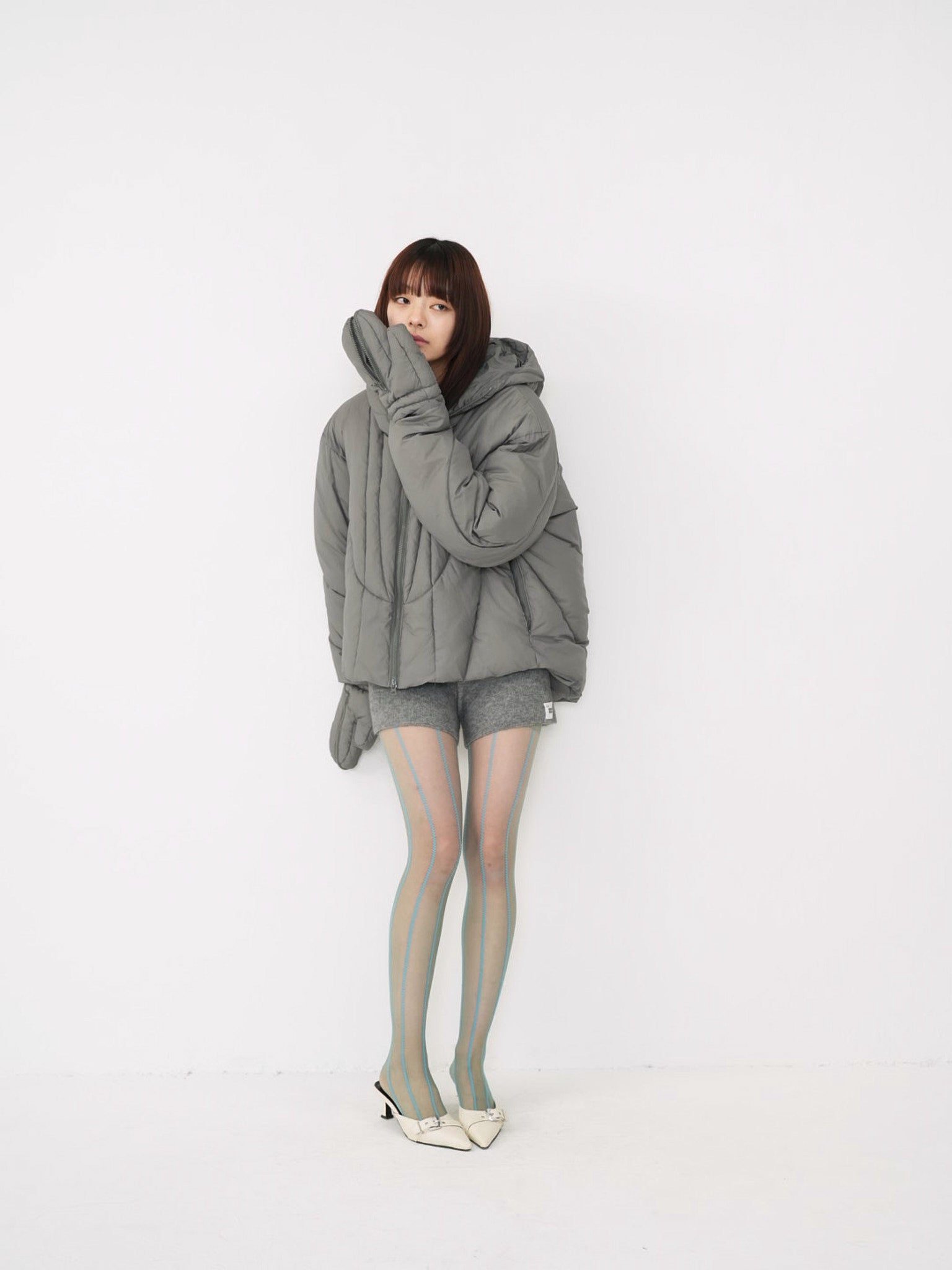 これは服というより、ちょっとした装備。フードとグローブが最初から付いていて、「寒いからどうしよう」を考える前にもう完成している。着る人の準備不足さえ受け止めてくれる、やさしくて変なダウン。ユニークな見た目は、目立つためじゃなく、迷わないため。防寒も、スタイルも、気分も全部まとめて包み込む。今日は外に出るだけ。それ以上のことは、この服がやってくれる。