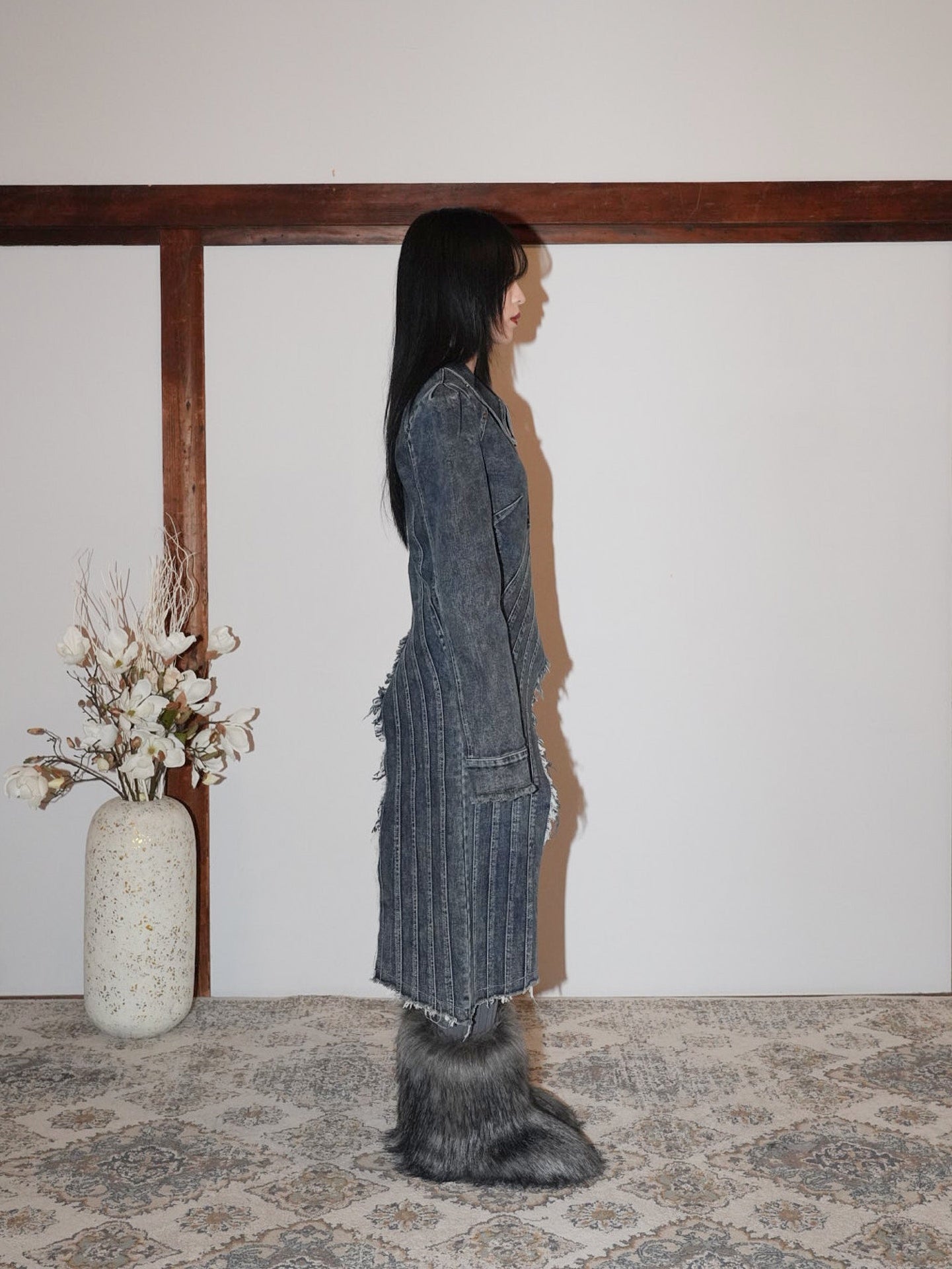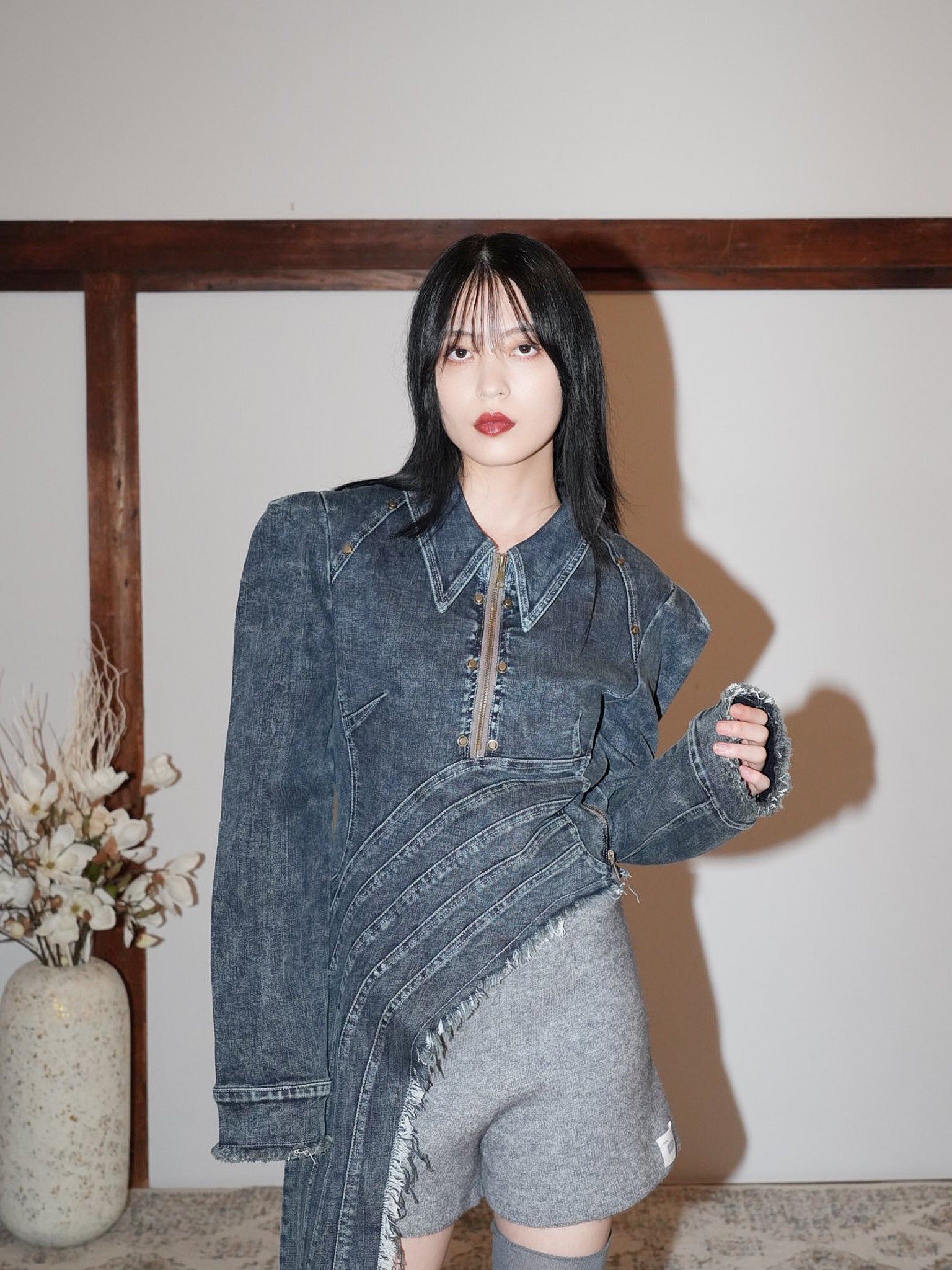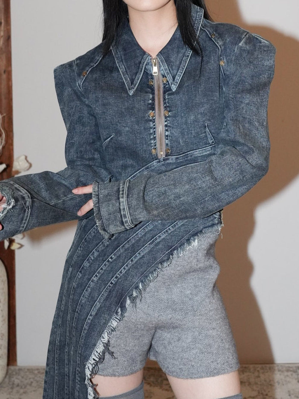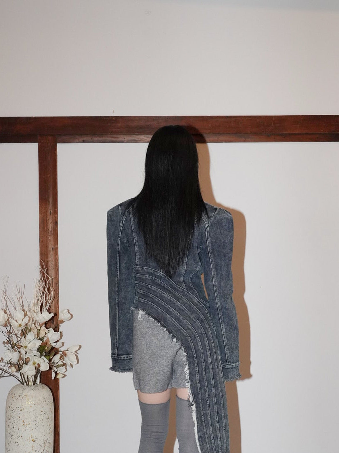 フリンジ状の切りっぱなしを効かせたロングパネルがアシンメトリーに落ちる。