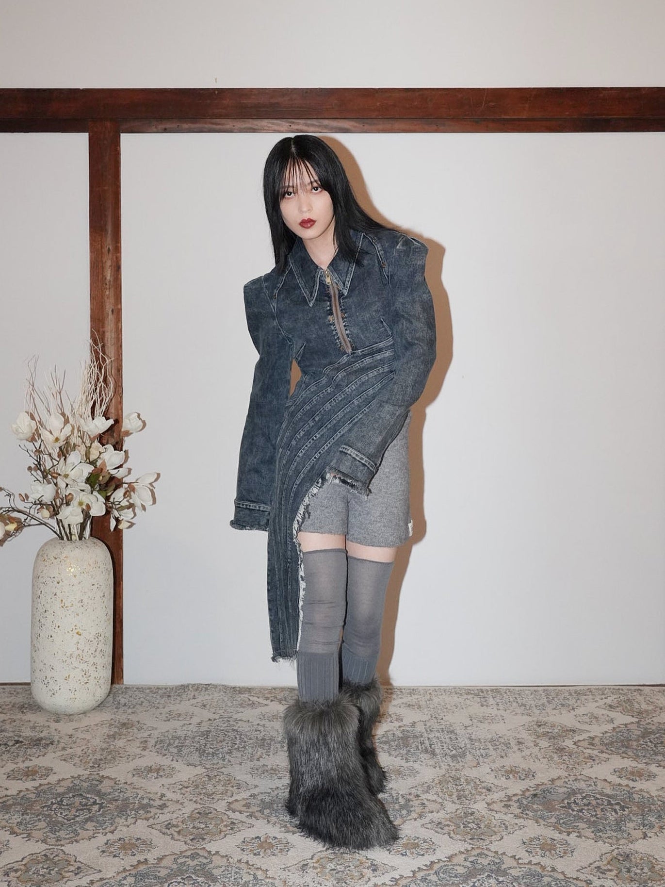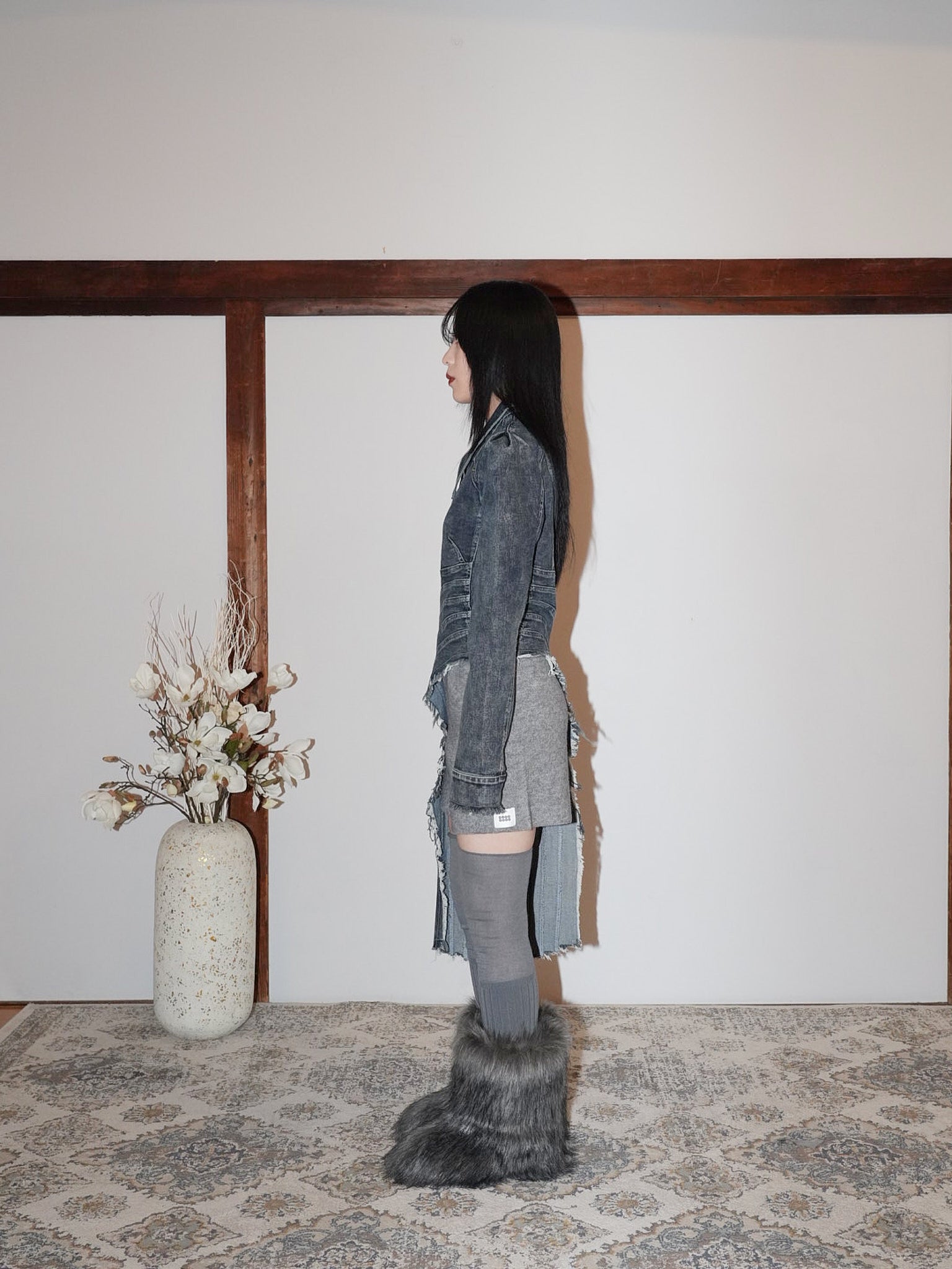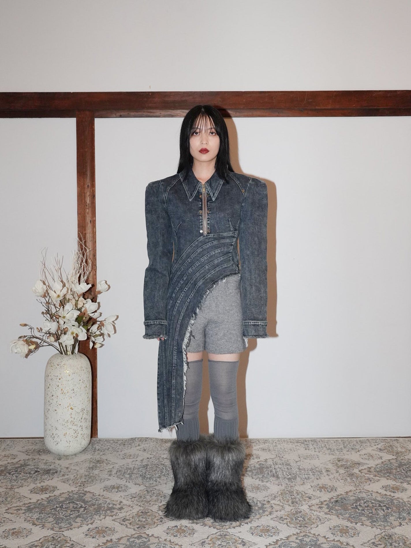 フリンジ状の切りっぱなしを効かせたロングパネルがアシンメトリーに落ちる。