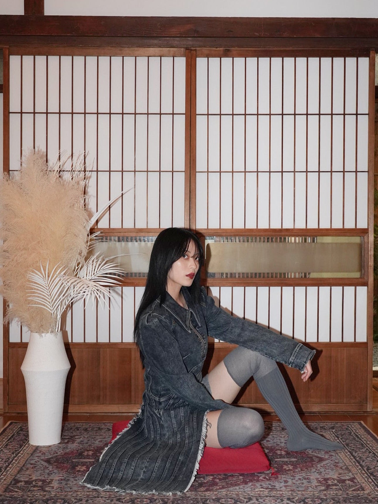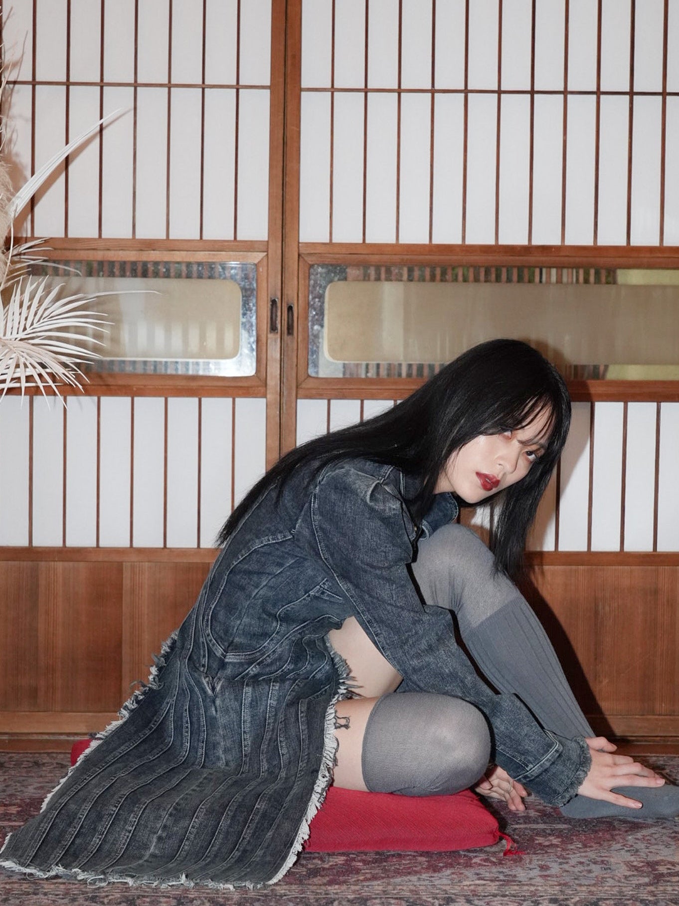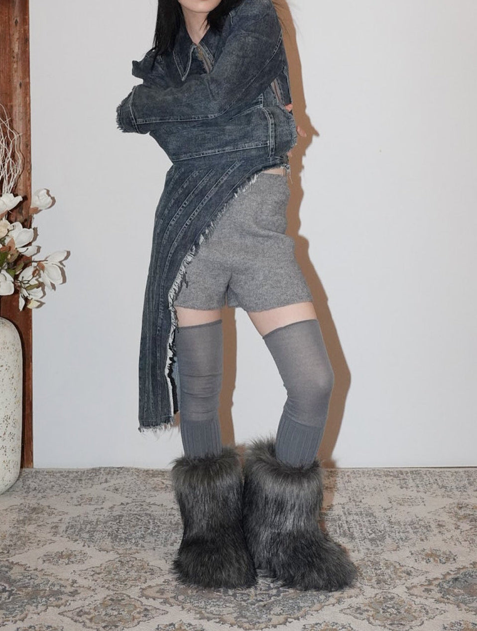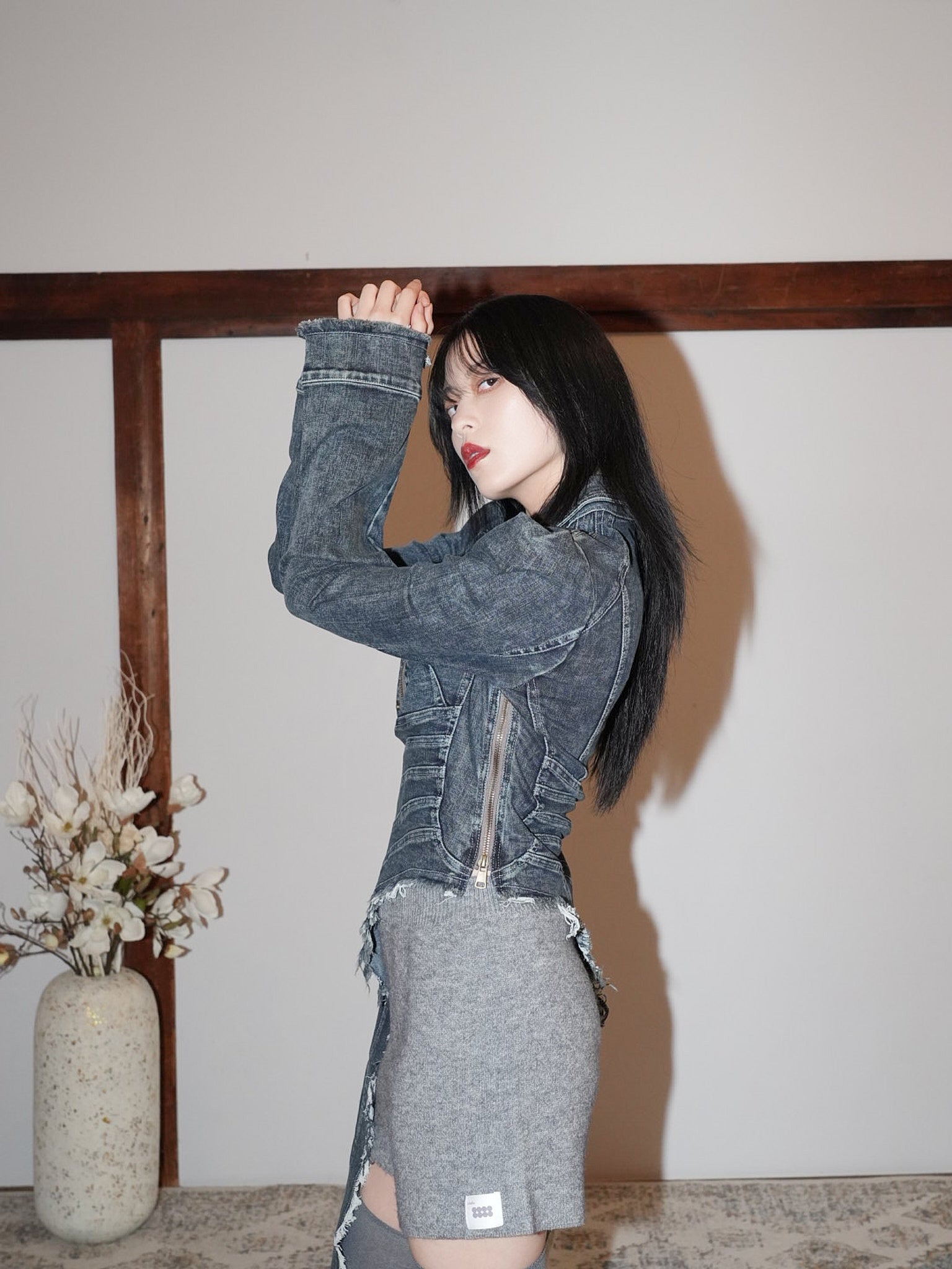 フリンジ状の切りっぱなしを効かせたロングパネルがアシンメトリーに落ちる。