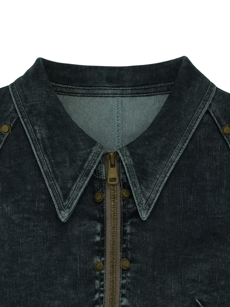 シャープなロングカラーとフロントジップ、コンパクトな身頃。