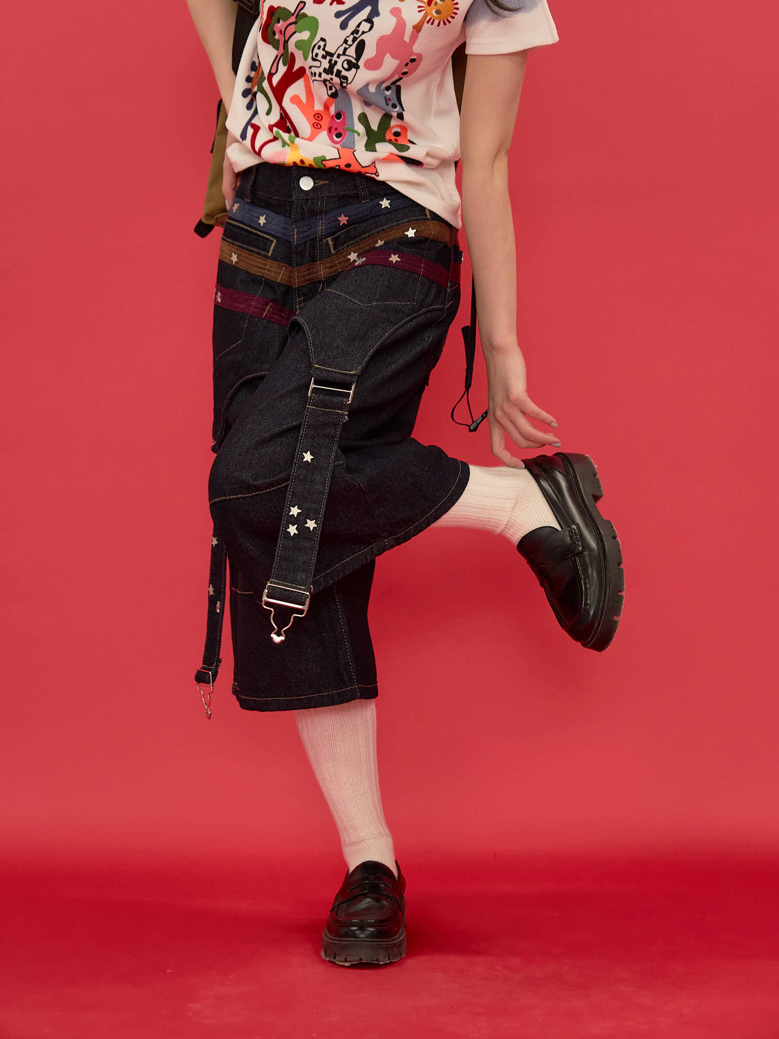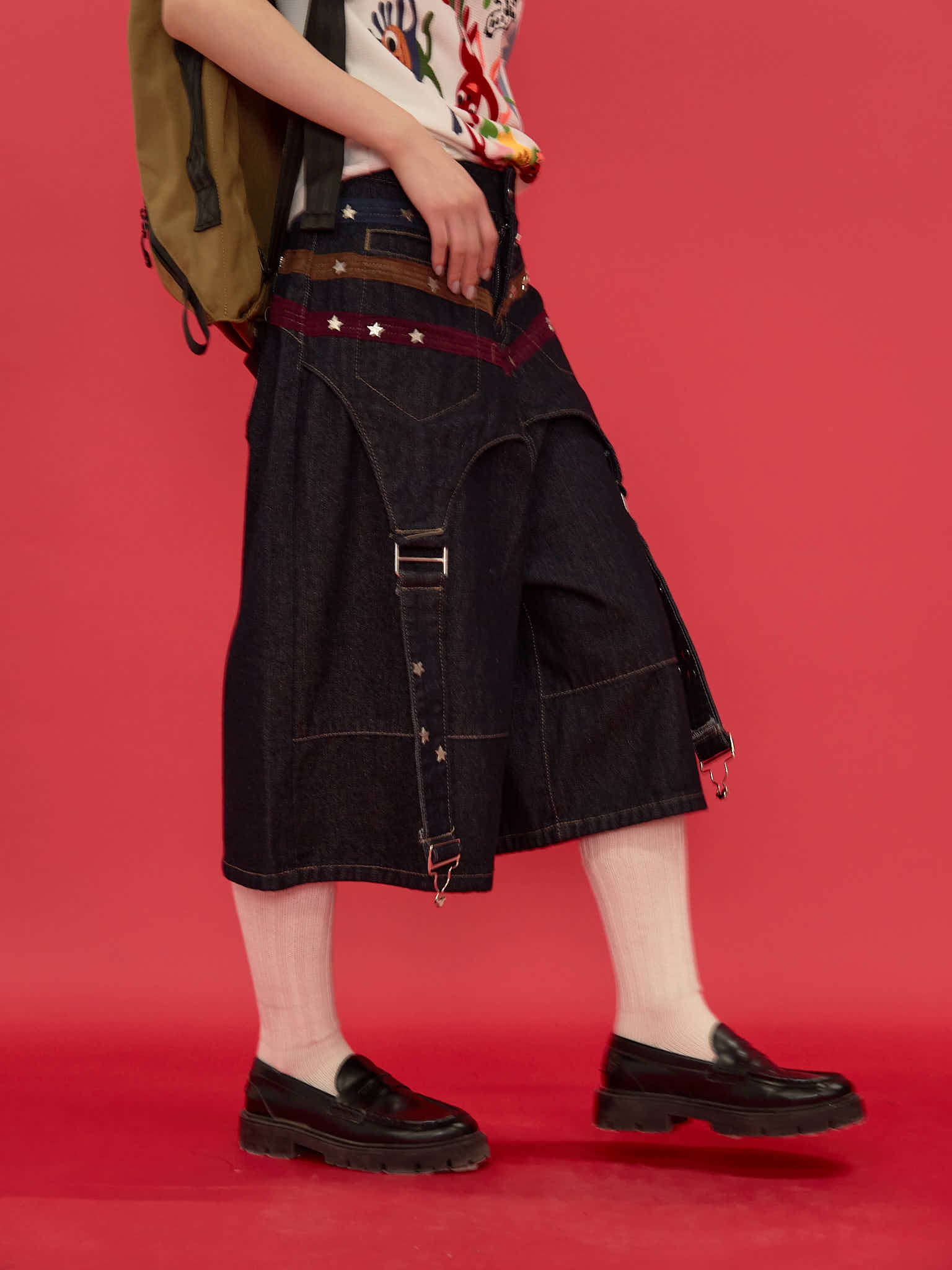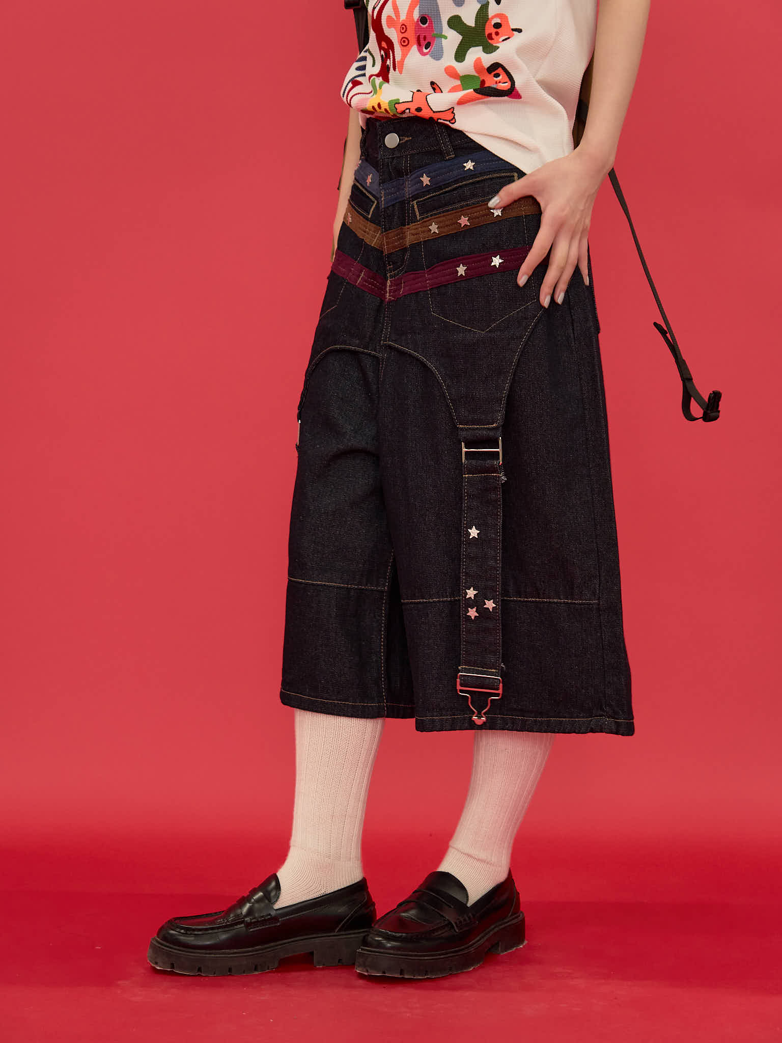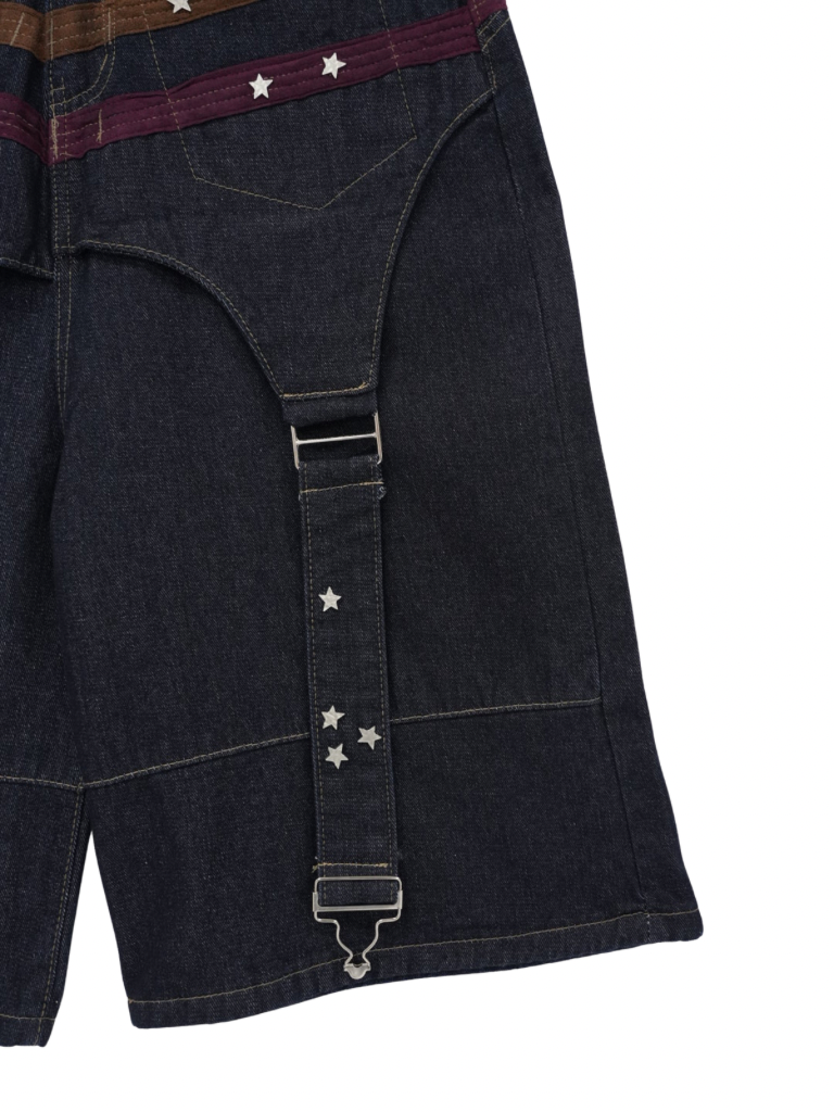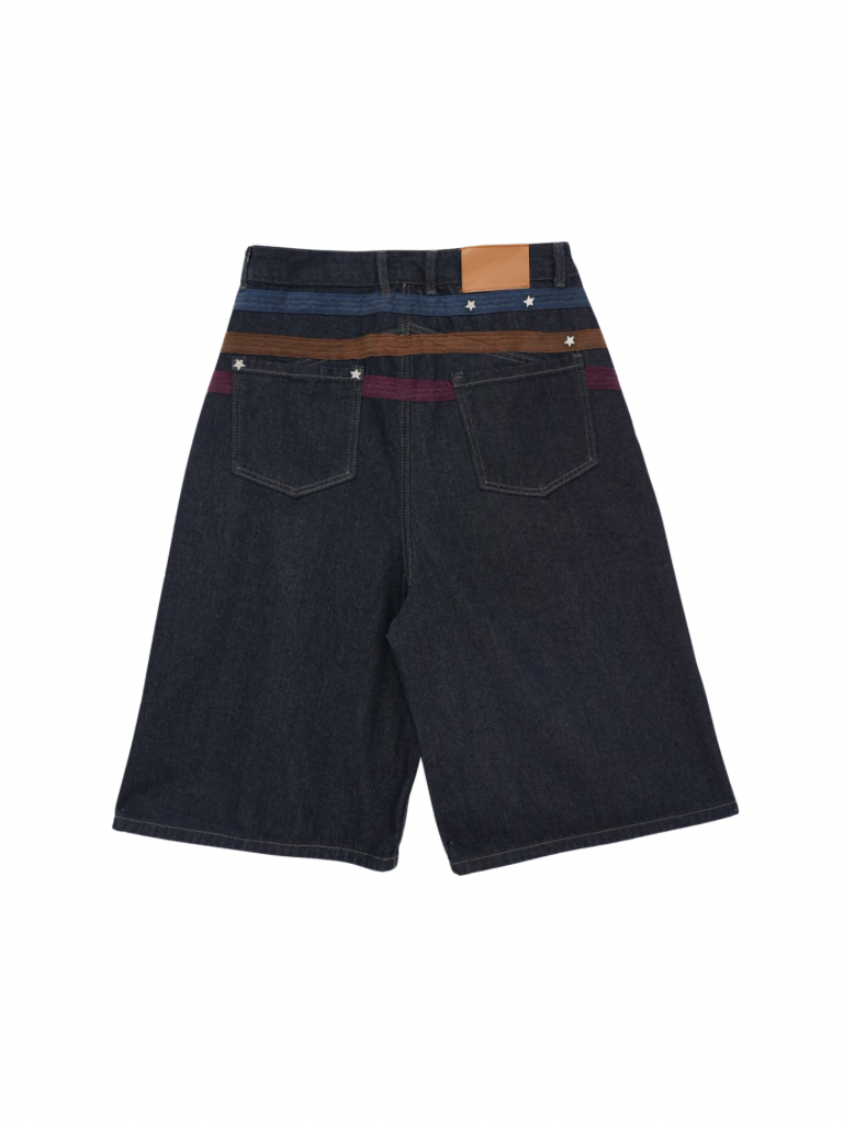 ワイドシルエットが印象的なハーフパンツ。膝下まで届く長めの丈感と、立体感のある切替デザインで存在感を演出。ウエストまわりのディテールがアクセントになり、ラフになりすぎず個性的な印象に。しっかりとした生地感で、シンプルなトップスに合わせるだけでもコーディネートが決まる一本。