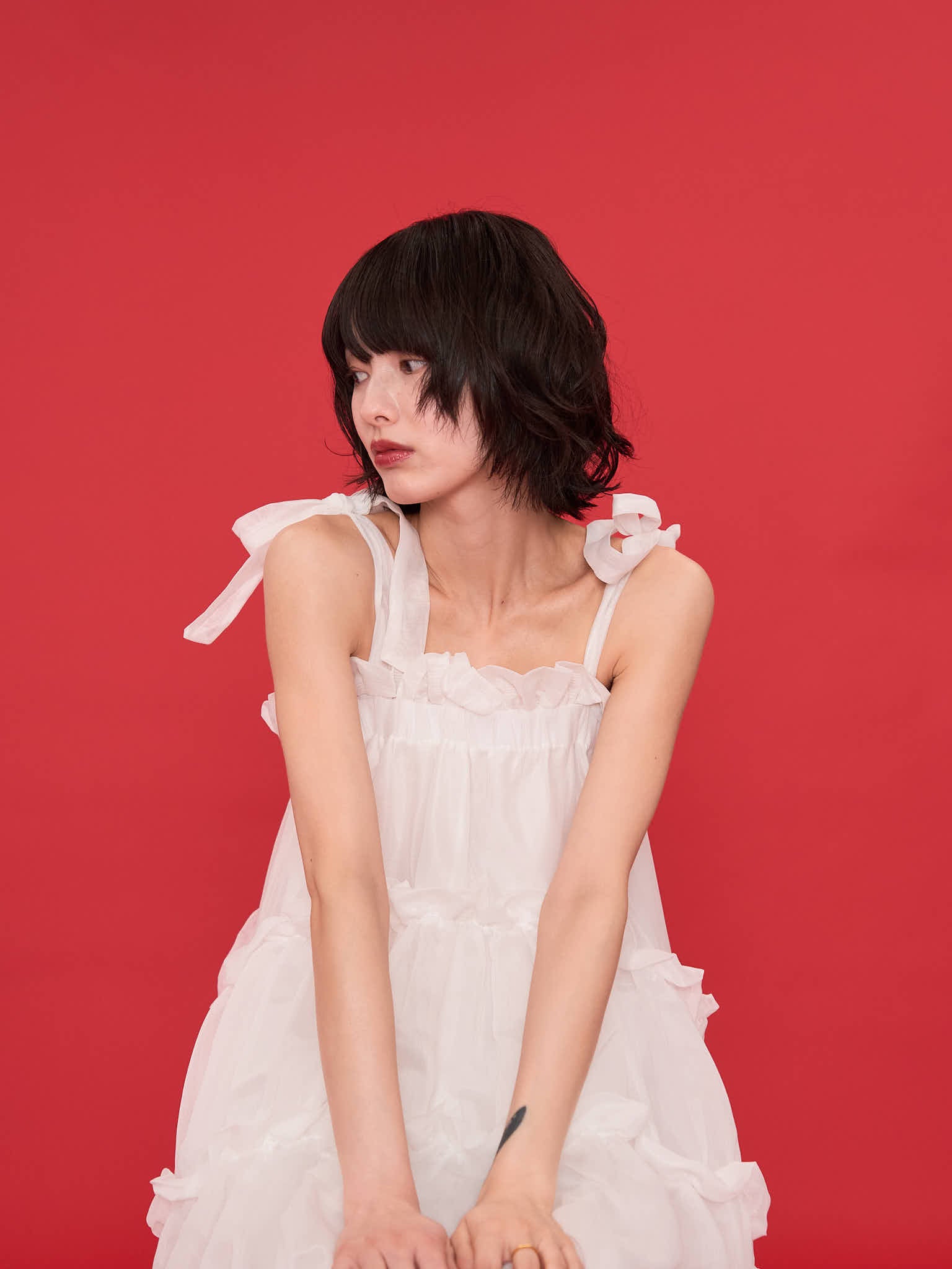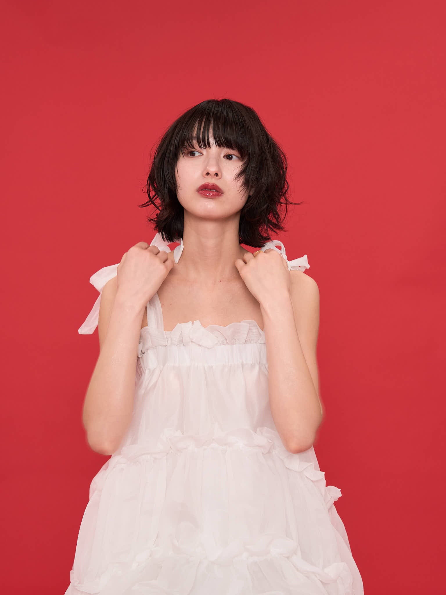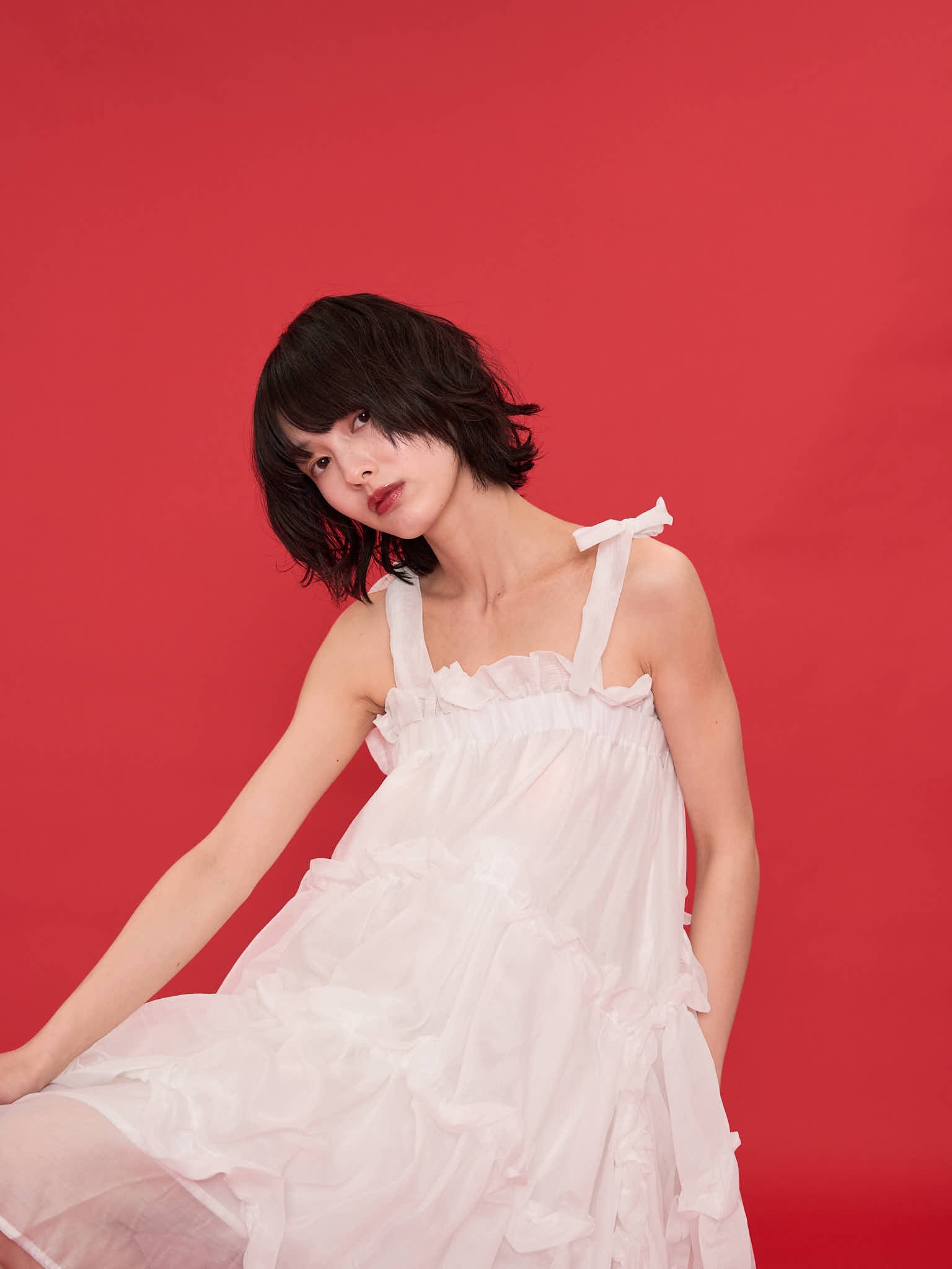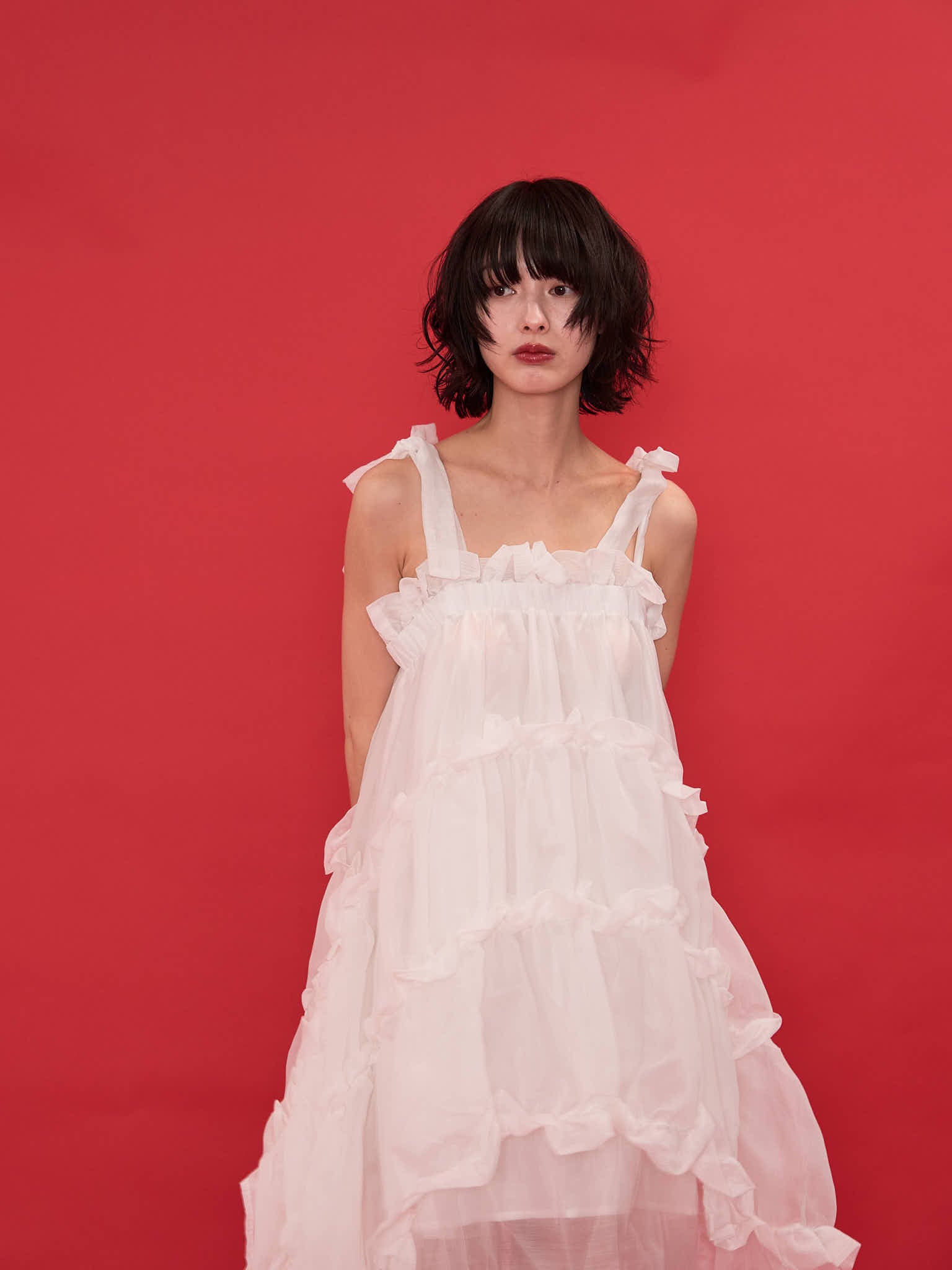 スタイリングの主役として映える、繊細で華やかなディテールが魅力の「ラウンドフリルキャミワンピース」。