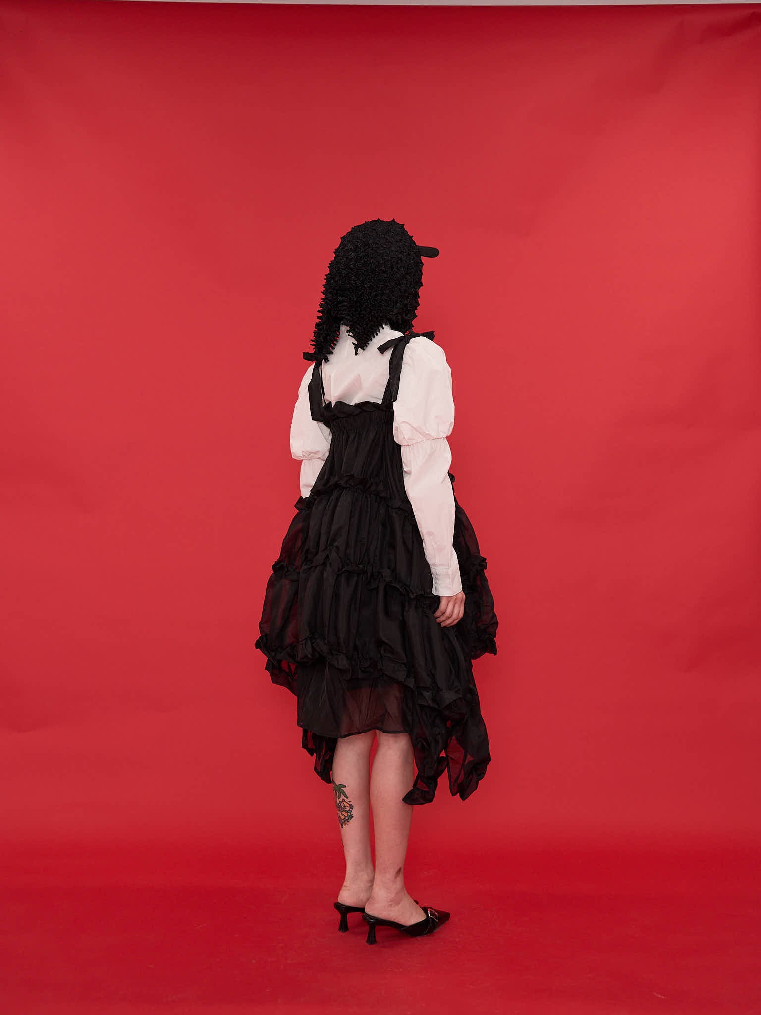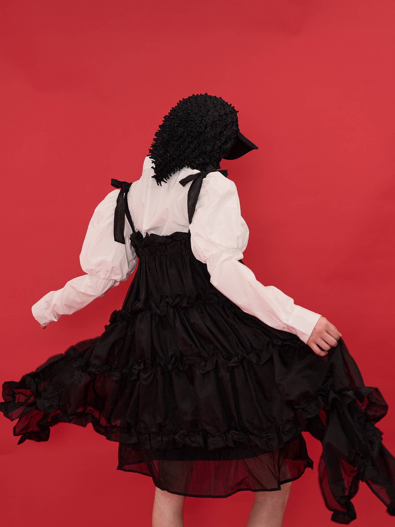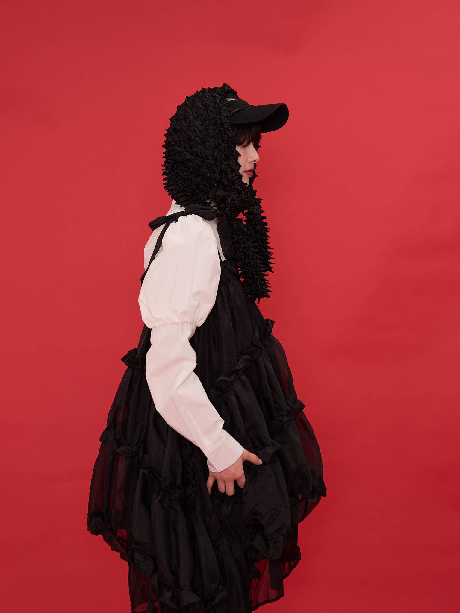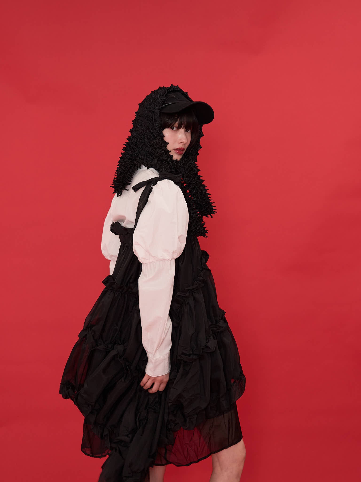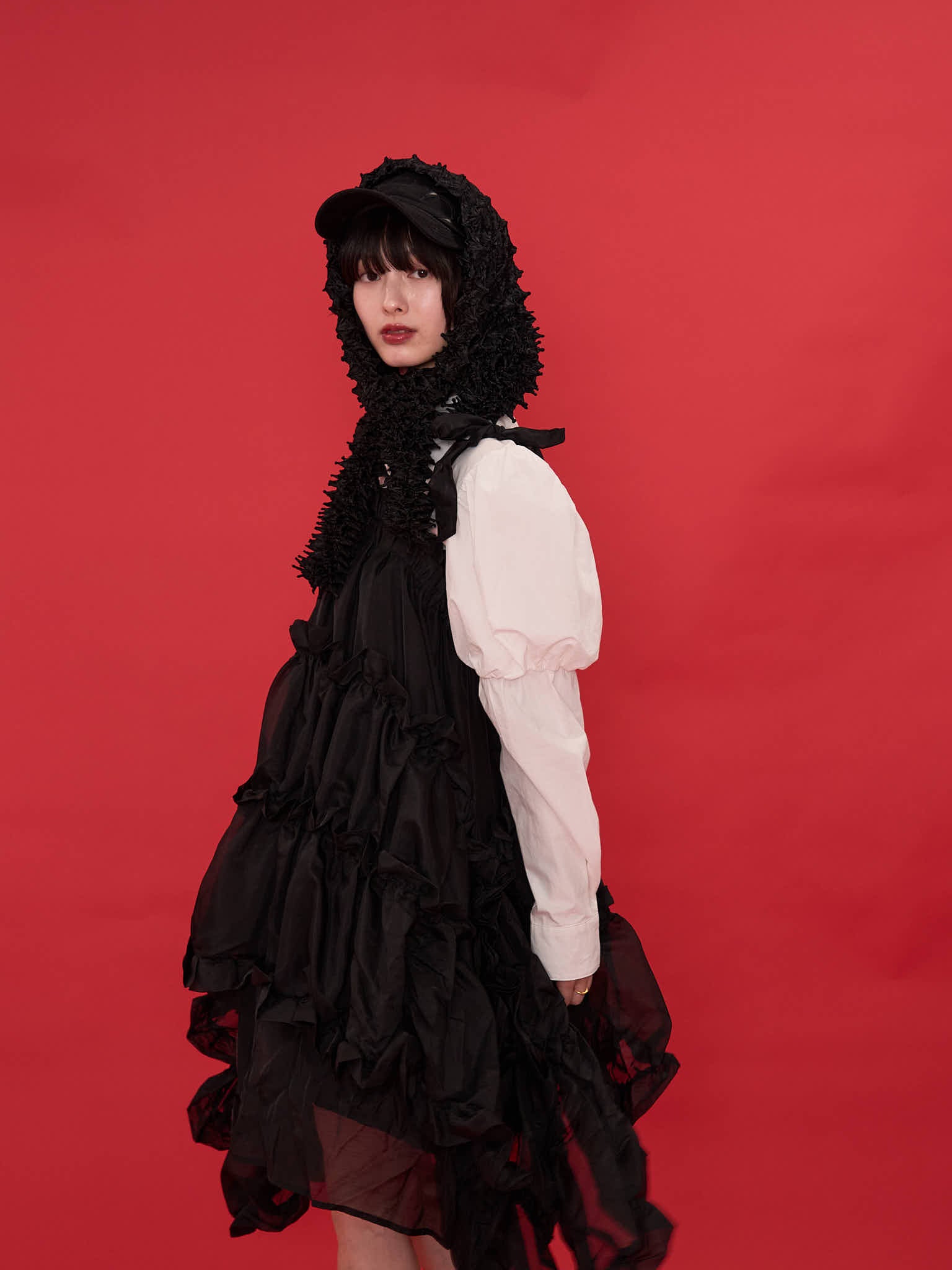 ふんわりと立体的に広がるラウンド型のフリルデザインが印象的で、動きのあるシルエットが女性らしさを引き立てます。